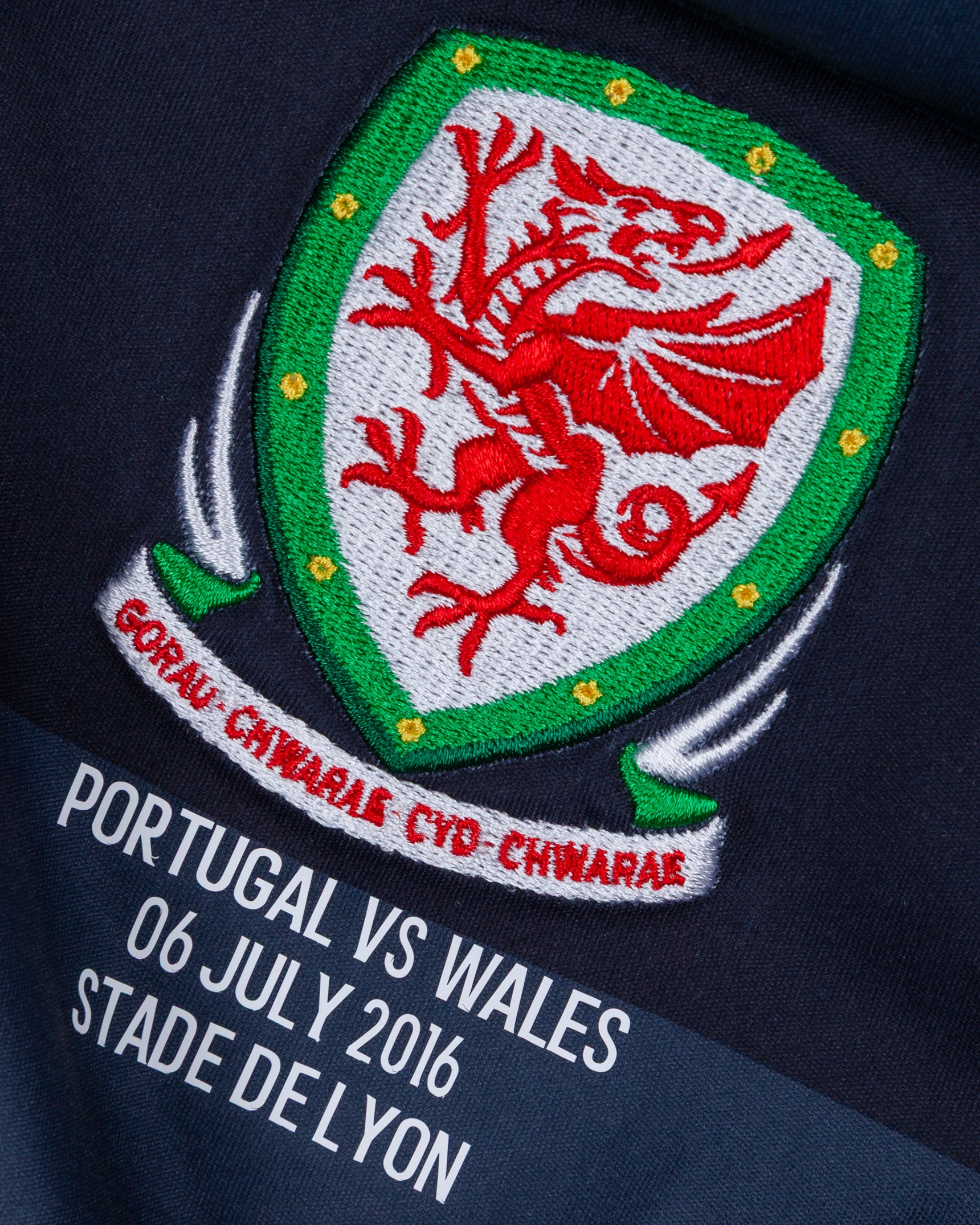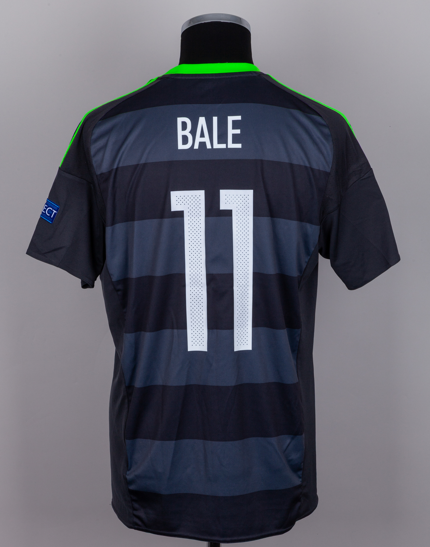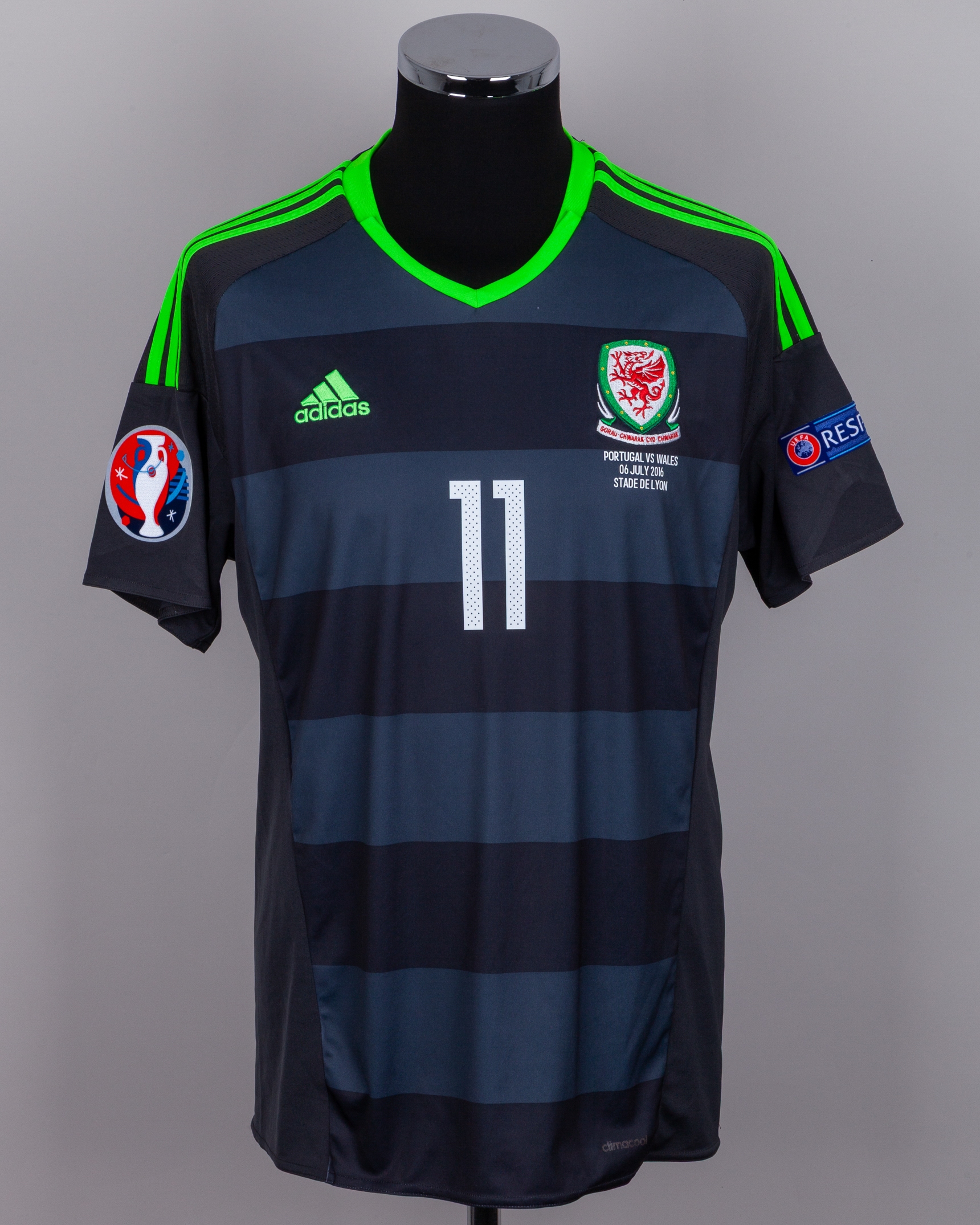 Gareth Bale grey No.11 Wales v. Portugal short-sleeved shirt, 2016, Adidas, L, with v-neck collar and embroidered badge inscribed GORAU CHWARAE CYD CHWARAE, with PORTUGAL VS WALES 06 JULY 2016 STADE DE LYON decal, the reverse lettered BALE, the right sleeve with Euros flash and the left sleeve with respect flash