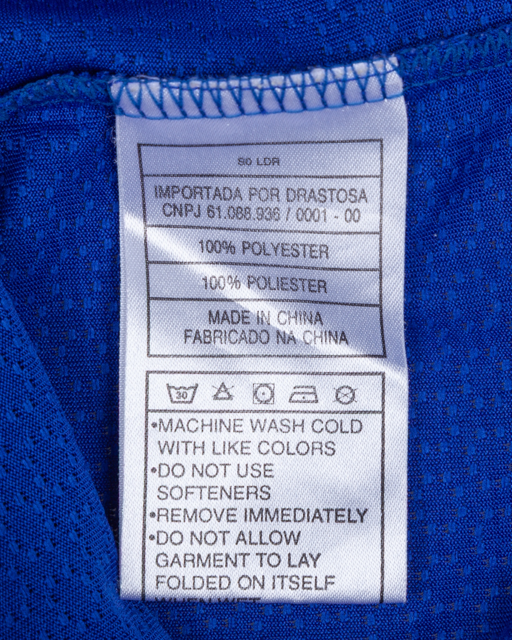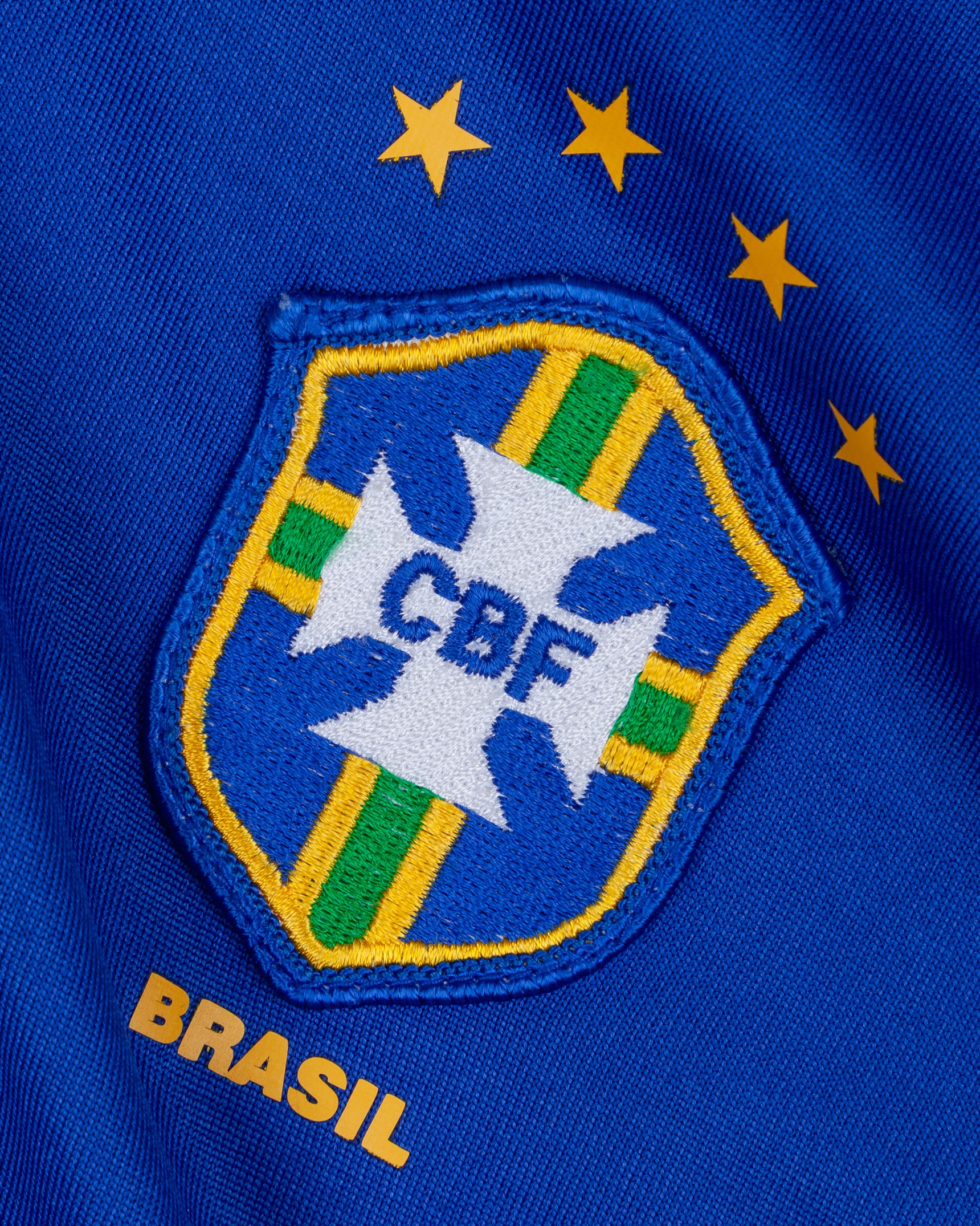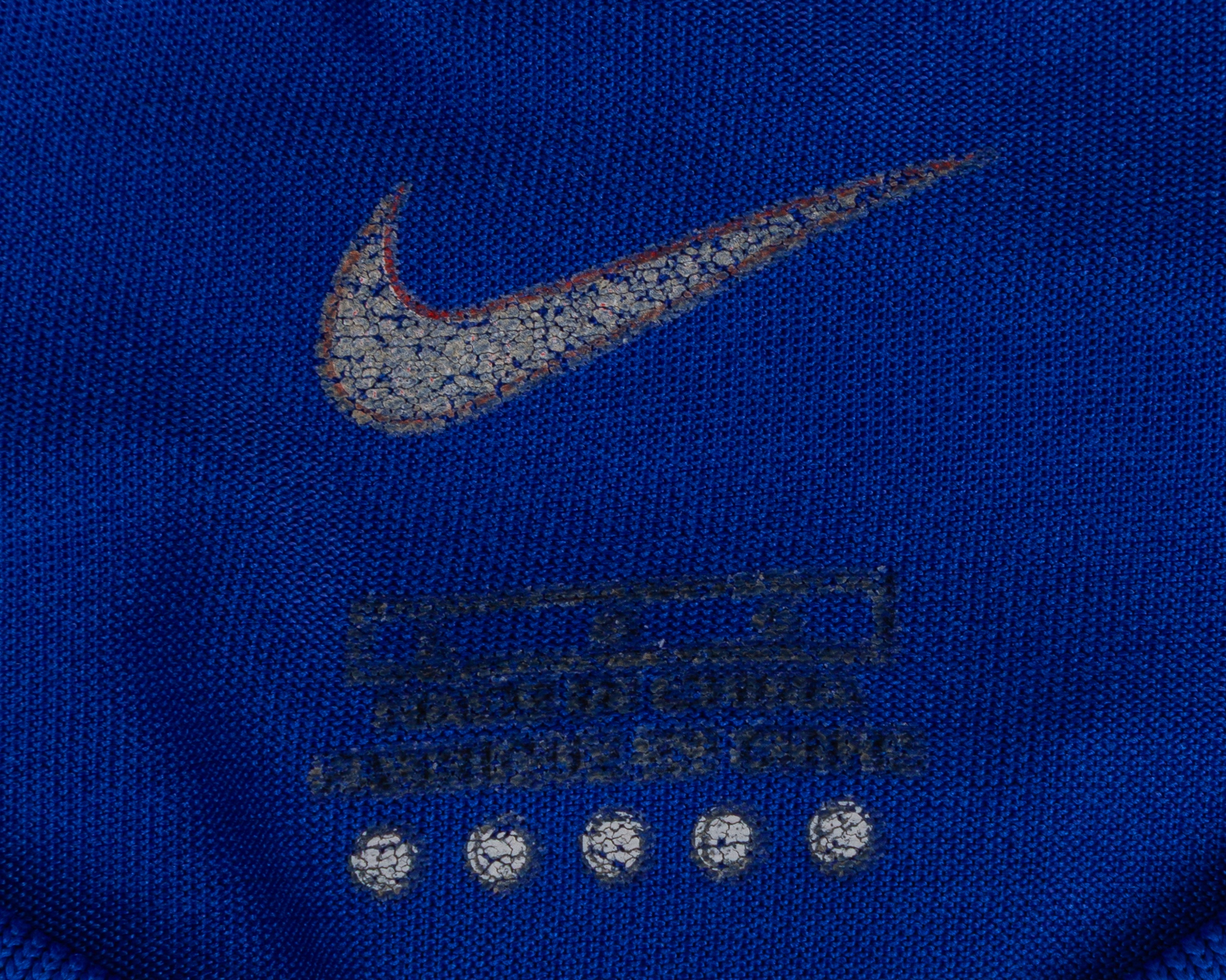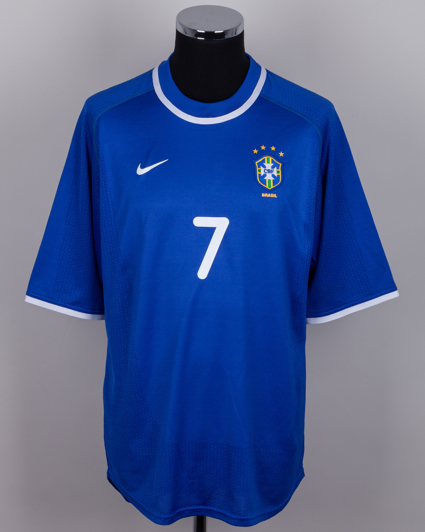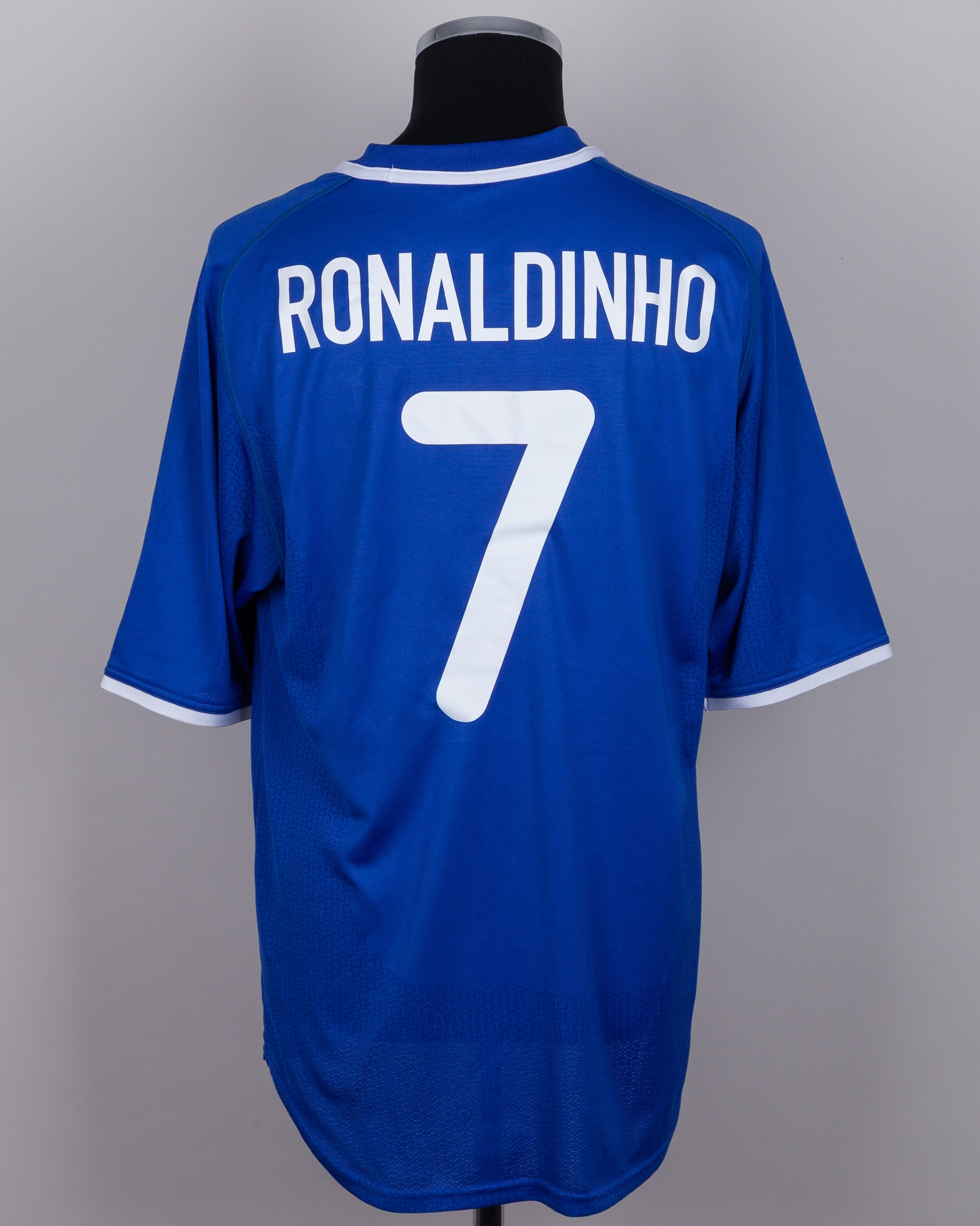 Ronaldinho blue No.7 Brazil short-sleeved shirt, 2001, Nike, L, with crew-neck collar and embroidered cloth badge inscribed CBF, with BRASIL decal, the reverse lettered RONALDINHO