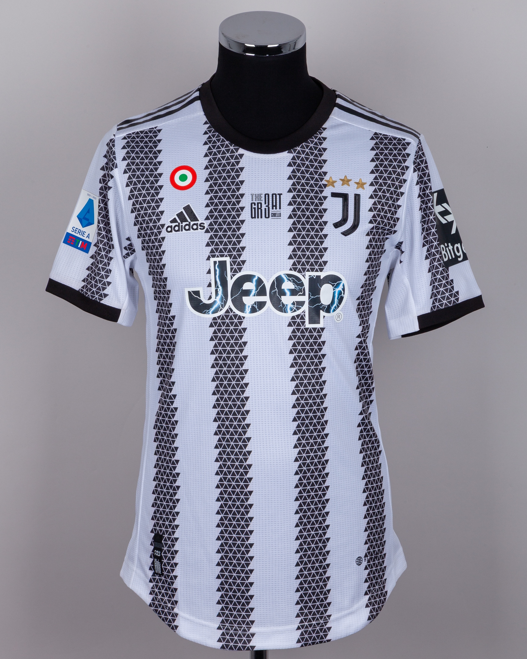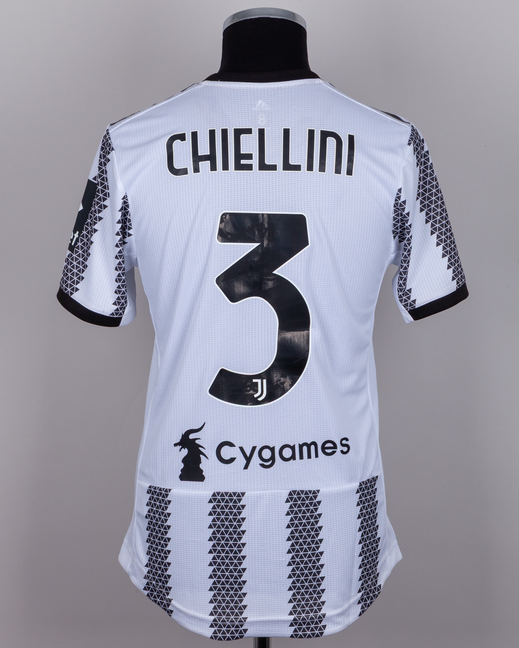 Giorgio Chiellini white and black No.3 Juventus v. Lazio short-sleeved farewell shirt, 2022, Adidas, 8, with crew-neck collar and printed badge, with THE GR3AT CHIELLO decal, the reverse lettered CHIELLINI, the right sleeve with 2021/2022 Serie A flash
