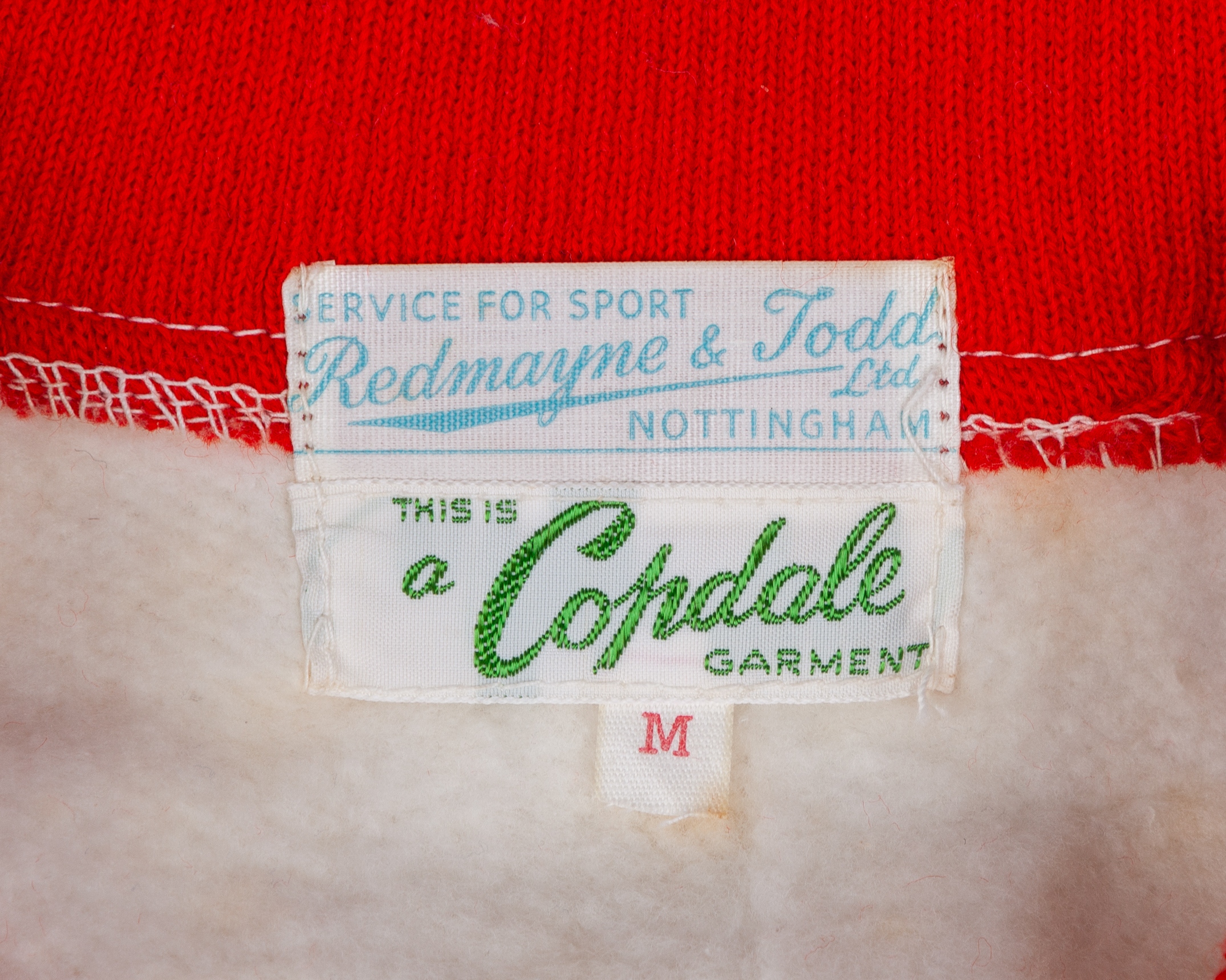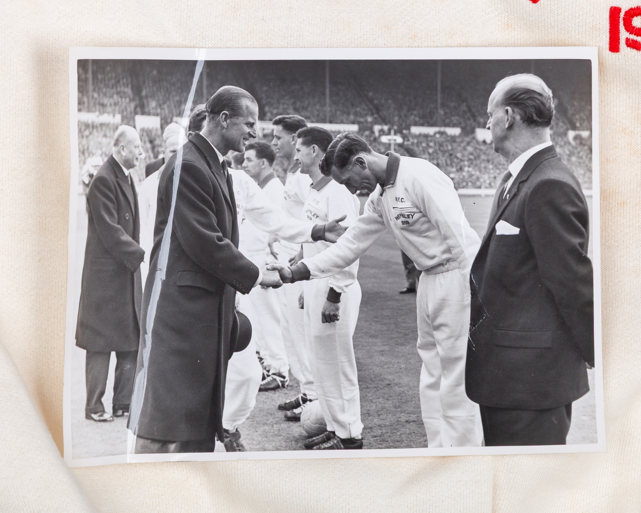 A white and red Nottingham Forest F.A.Cup Final tracksuit top, 1959, Copdale, M, with zip-up front and embroidered badge inscribed N.F.F.C. Wembley 1959, staining, including original bag and black and white photograph of Chic Thompson shaking hands with Prince Philip at the cup final