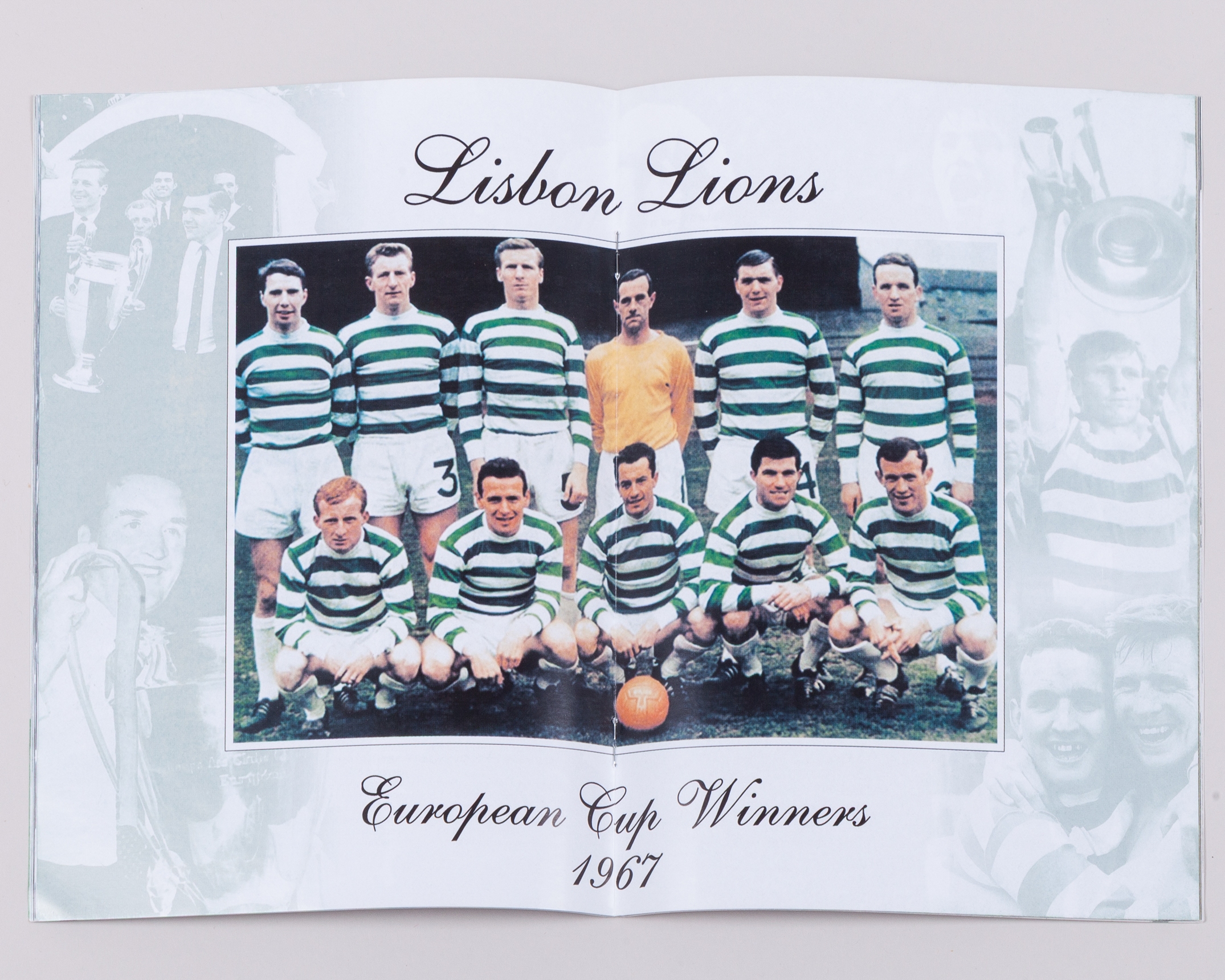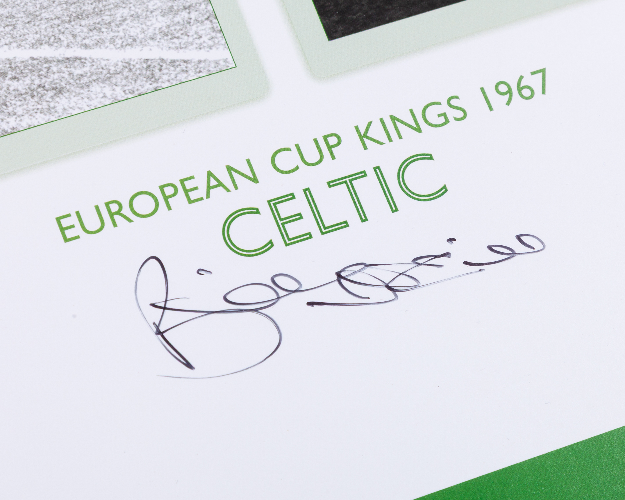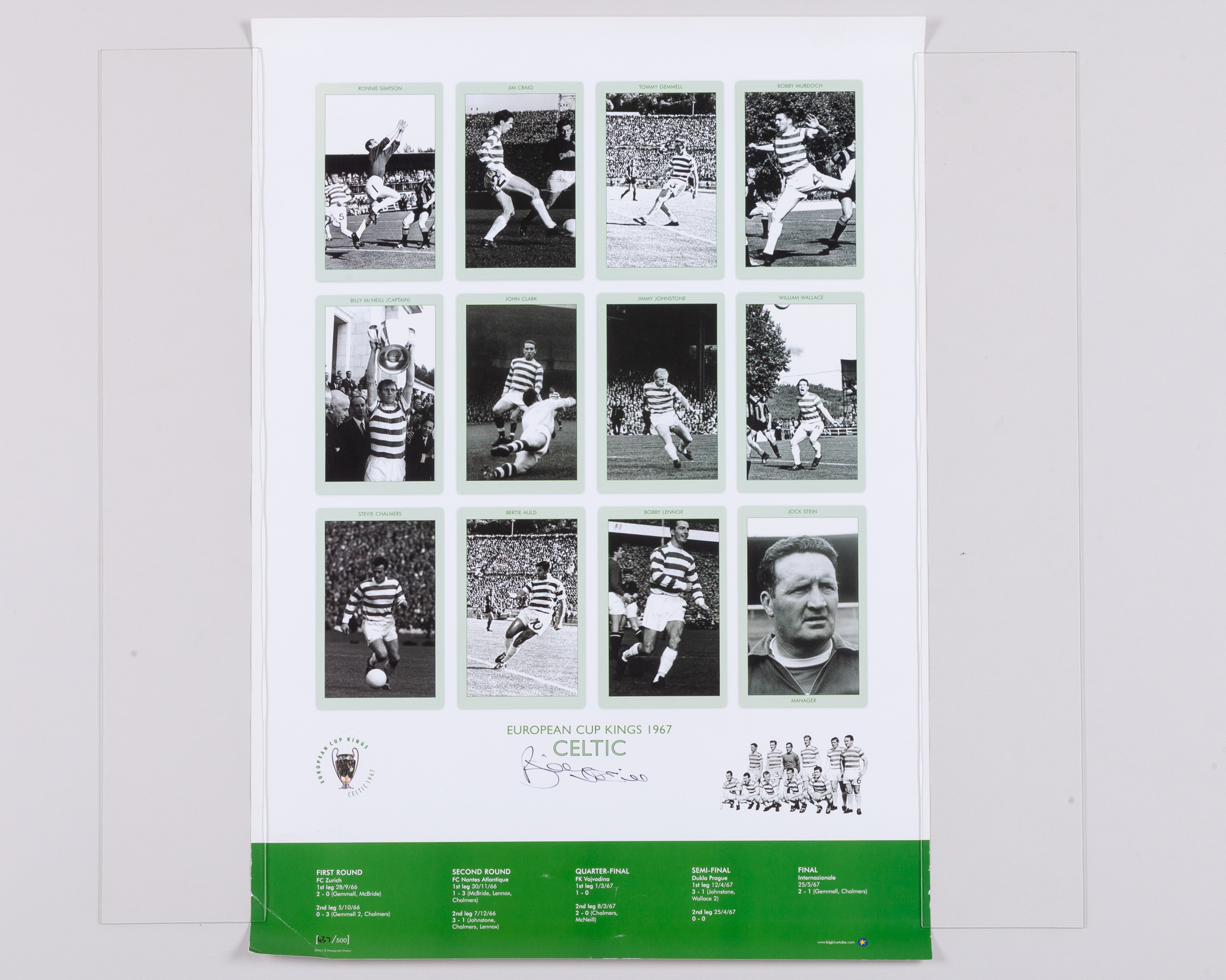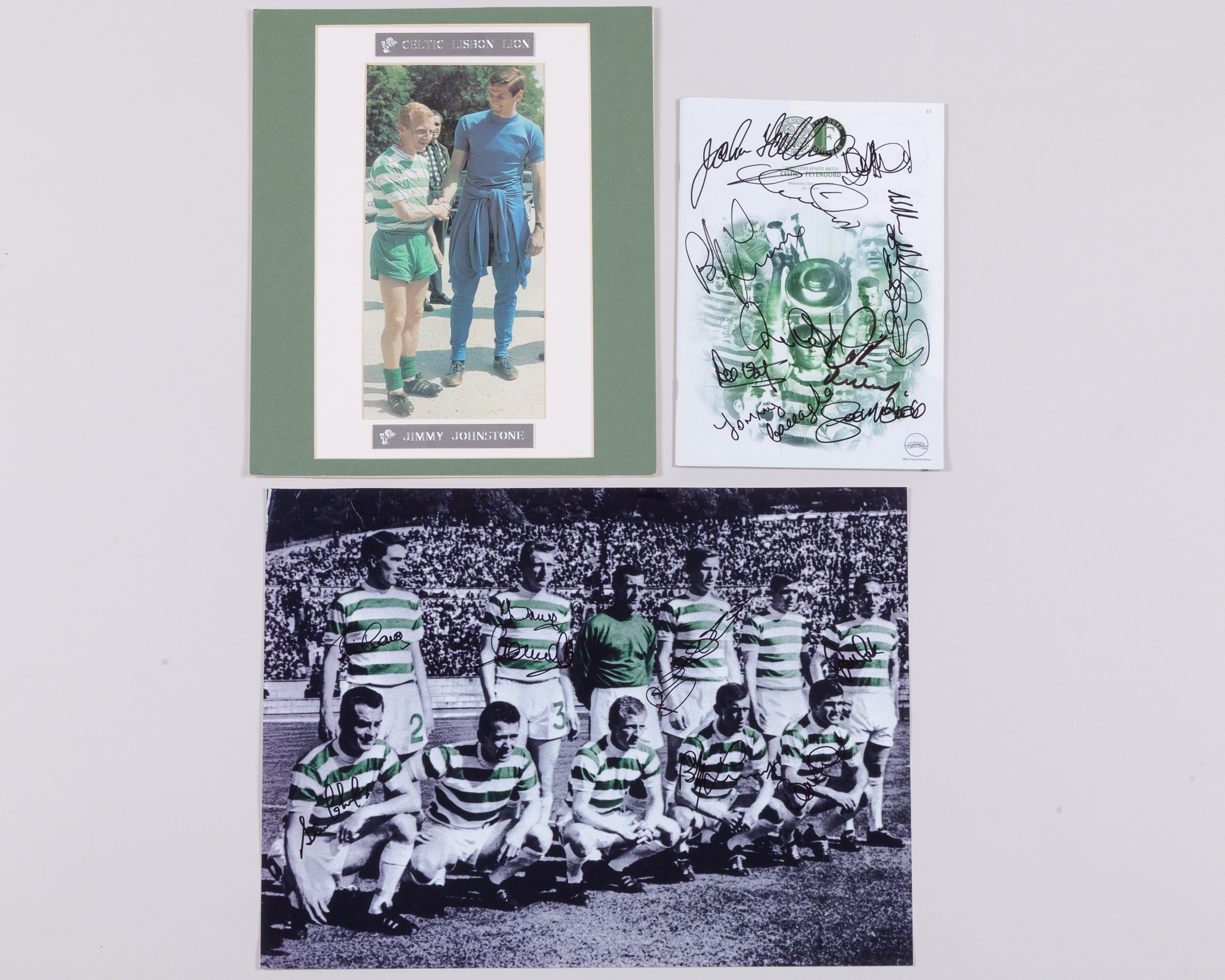 Selection of autographs relating to the 1967 Celtic Lisbon Lions, Pre-match line-up photographic print with seven autographs, Jimmy Johnstone autographed magazine clipping in mount, Celtic v. Feyenoord Lisbon Lions benefit match 22nd January 2003 programme with autographed cover, Billy McNeill autographed European Cup Kings 1967 Celtic limited edition print, 437/500, 42 x 59cm with the rest smaller (4)