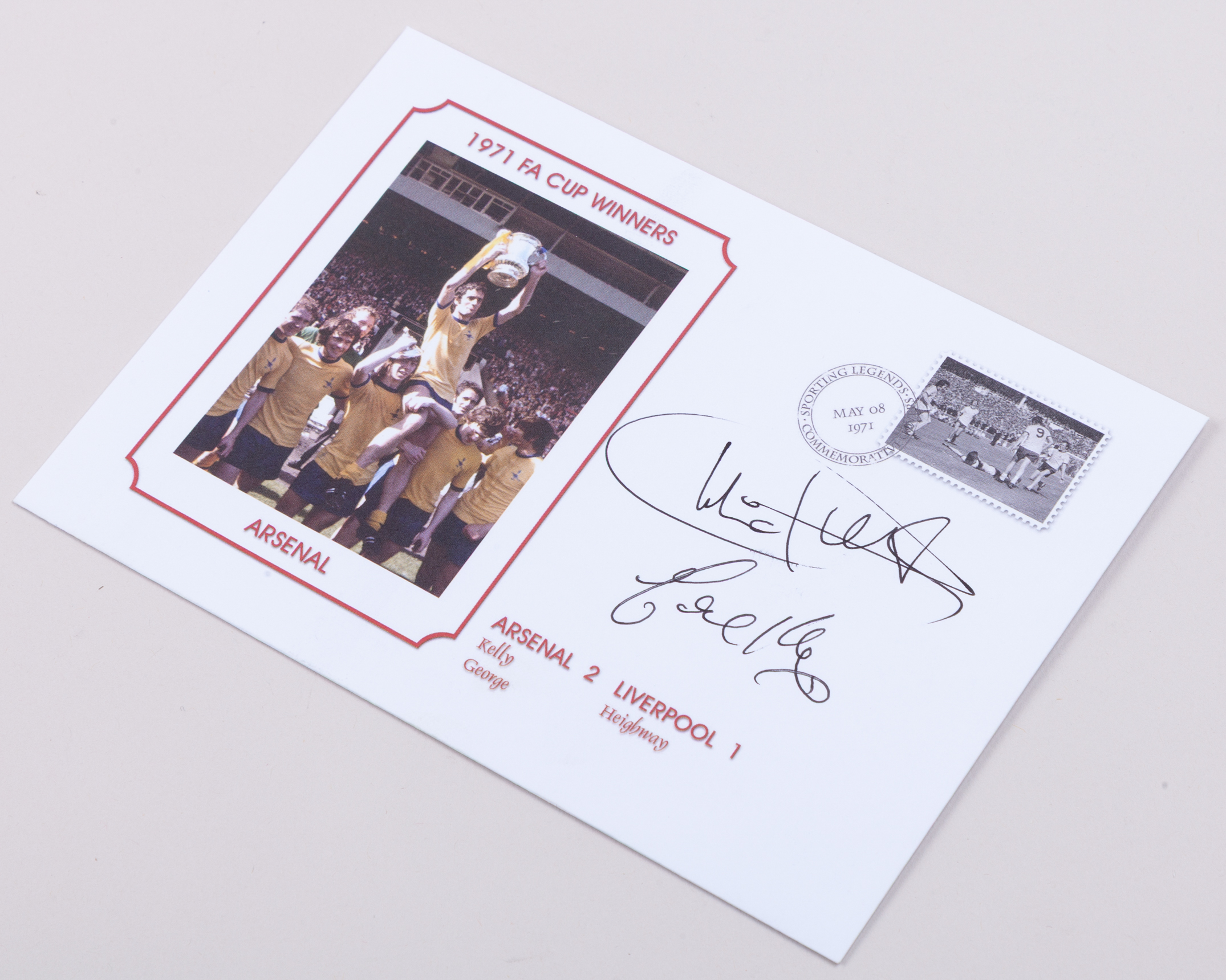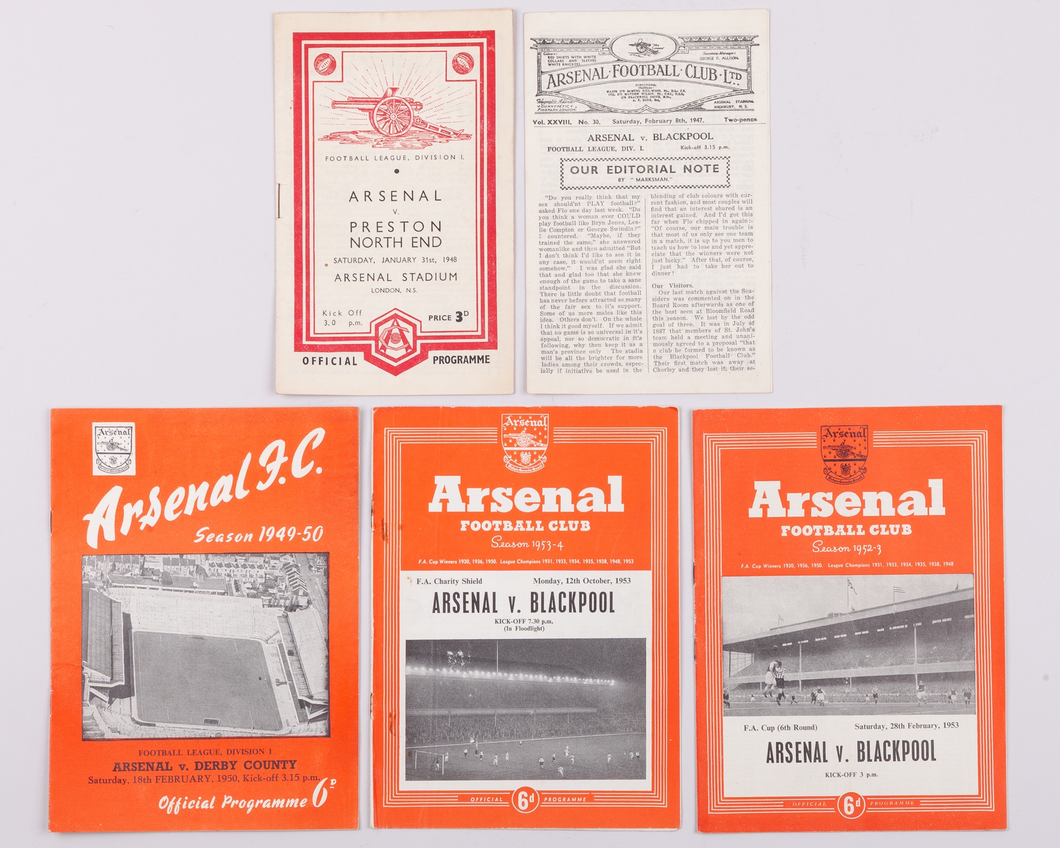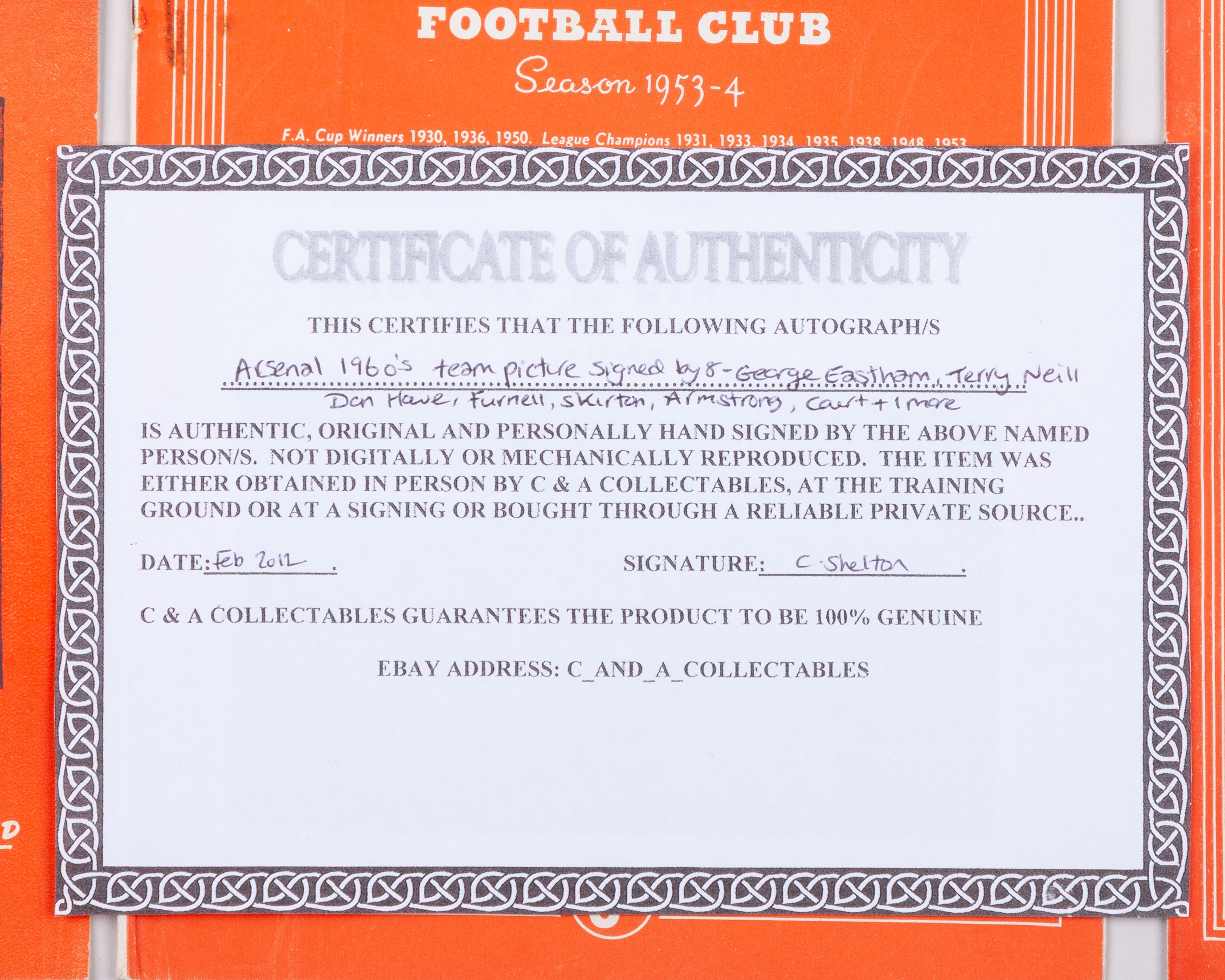 Selection of Arsenal autographs including a 1960s team line-up, with eight autographs and COA, Charlie George first day cover, five Arsenal programmes including Arsenal v. Blackpool 8th February 1947, Arsenal v. Preston North End 31st January 1948, Arsenal v. Blackpool Charity Shield 12th October 1953 etc., a few with annotations