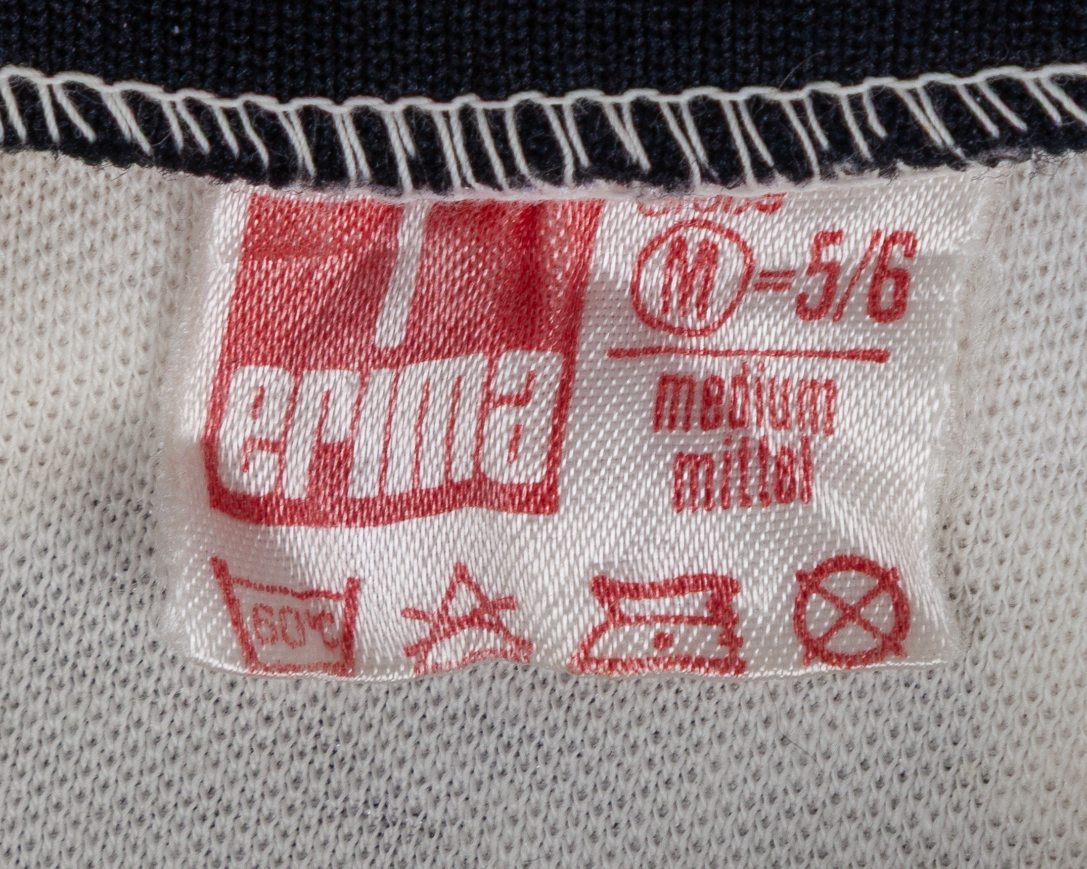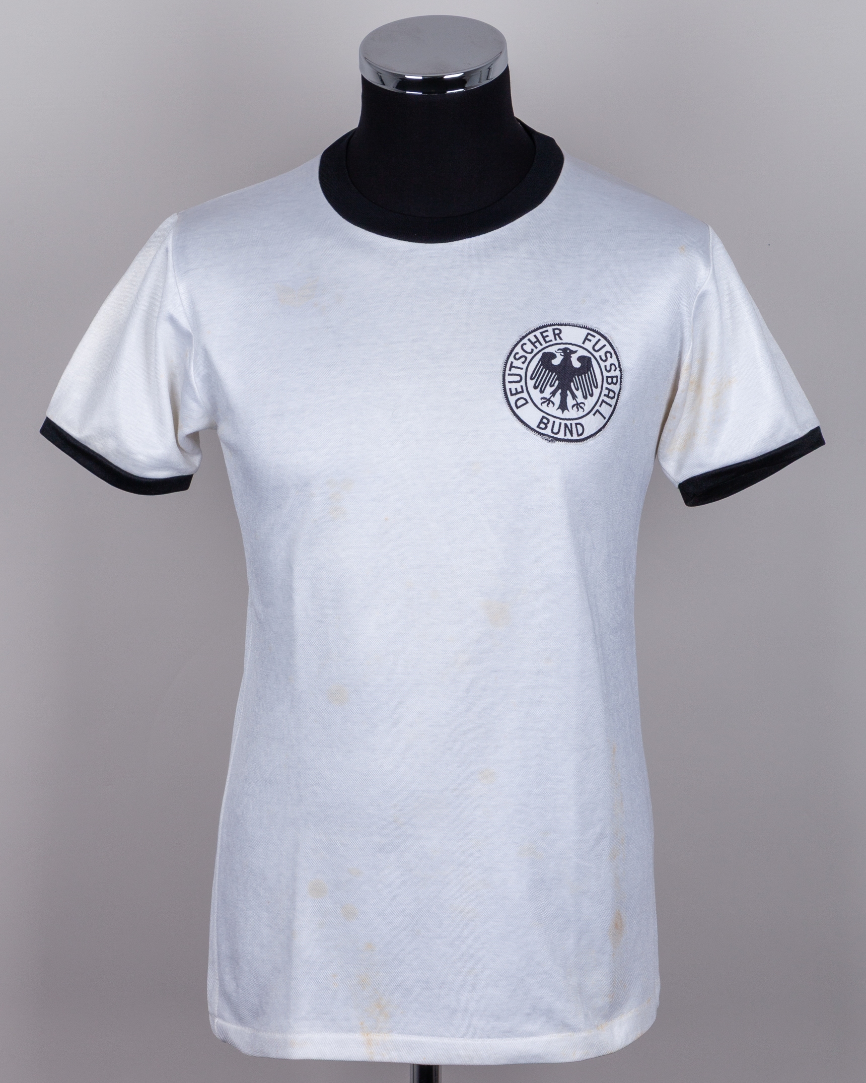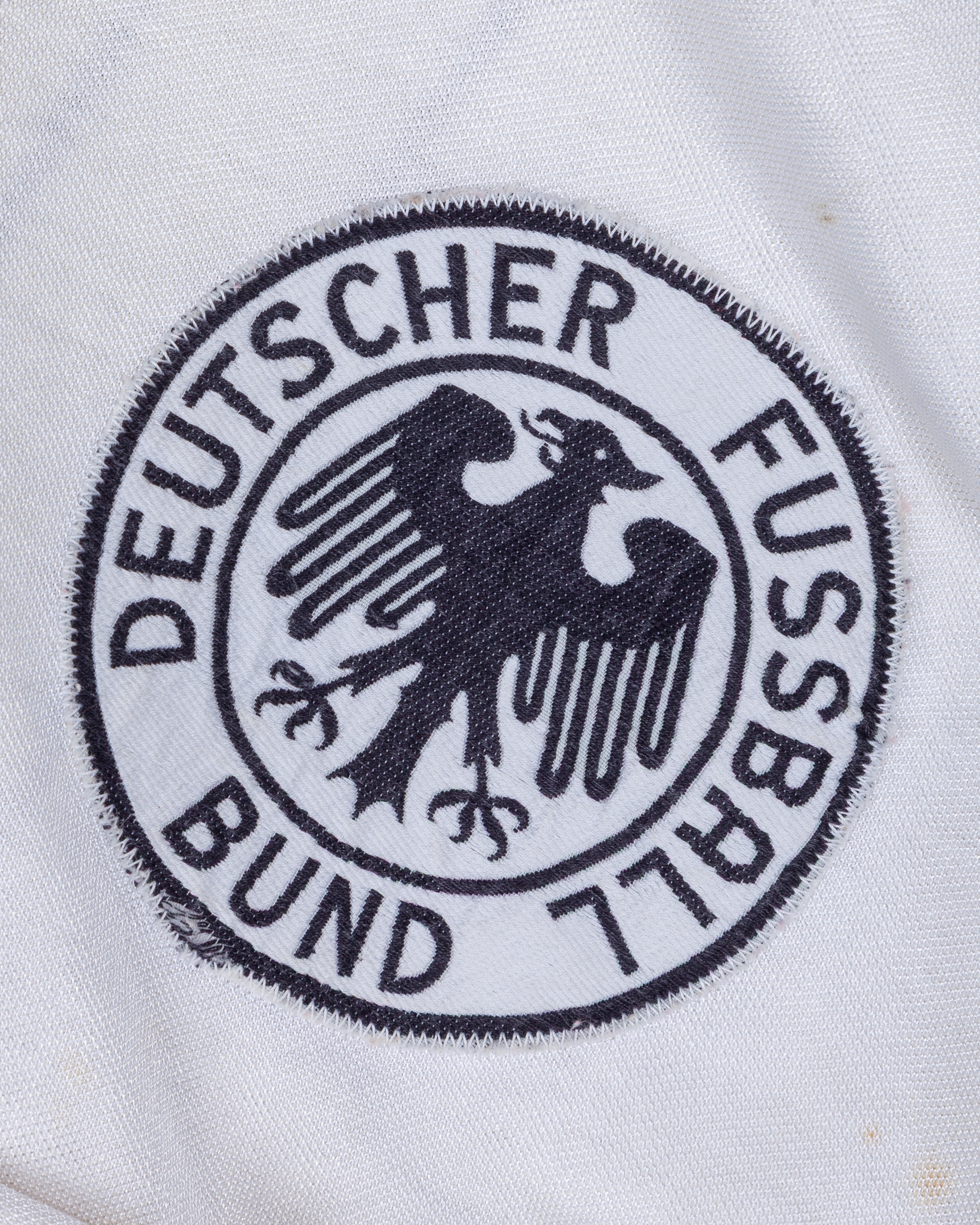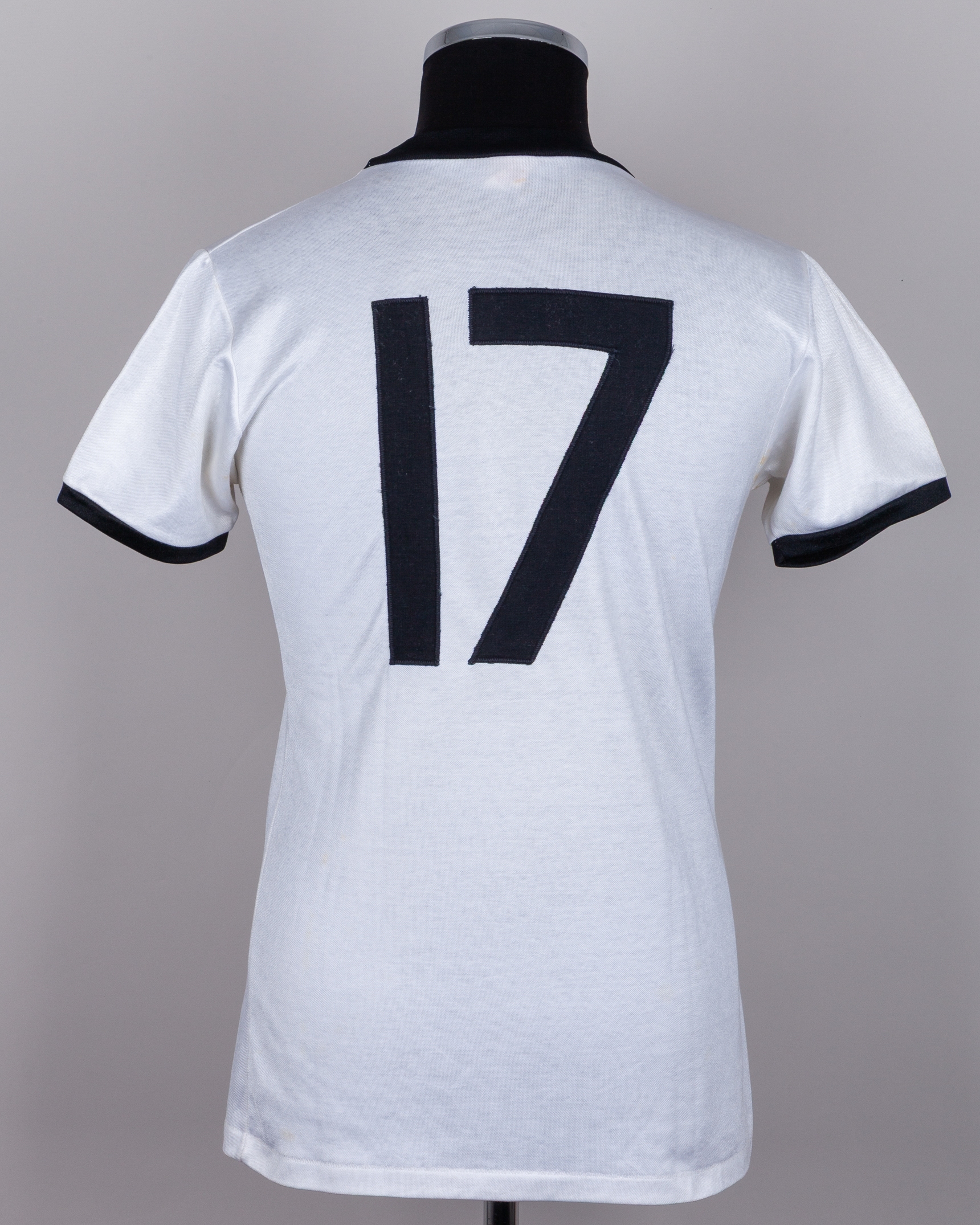 White and black No.17 West Germany short-sleeved shirt, 1970s, Erima, M, with crew-neck collar and embroidered cloth badge inscribed DEUTSCHER FUSBALL BUND, staining front and back