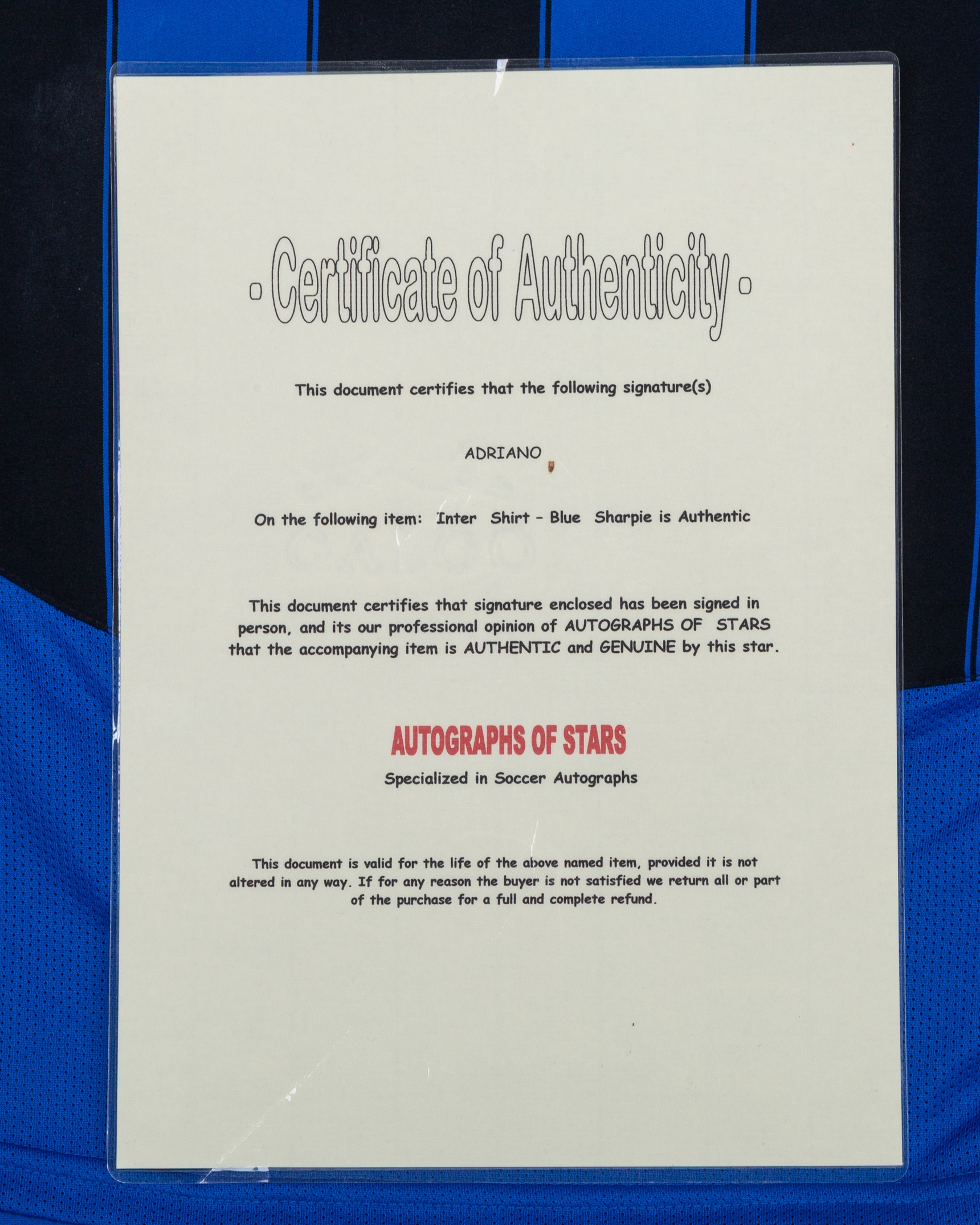 An Adriano autographed Inter Milan replica short-sleeved shirt, the number autographed, with COA, wear to name set and sponsors logo, autograph slightly faded