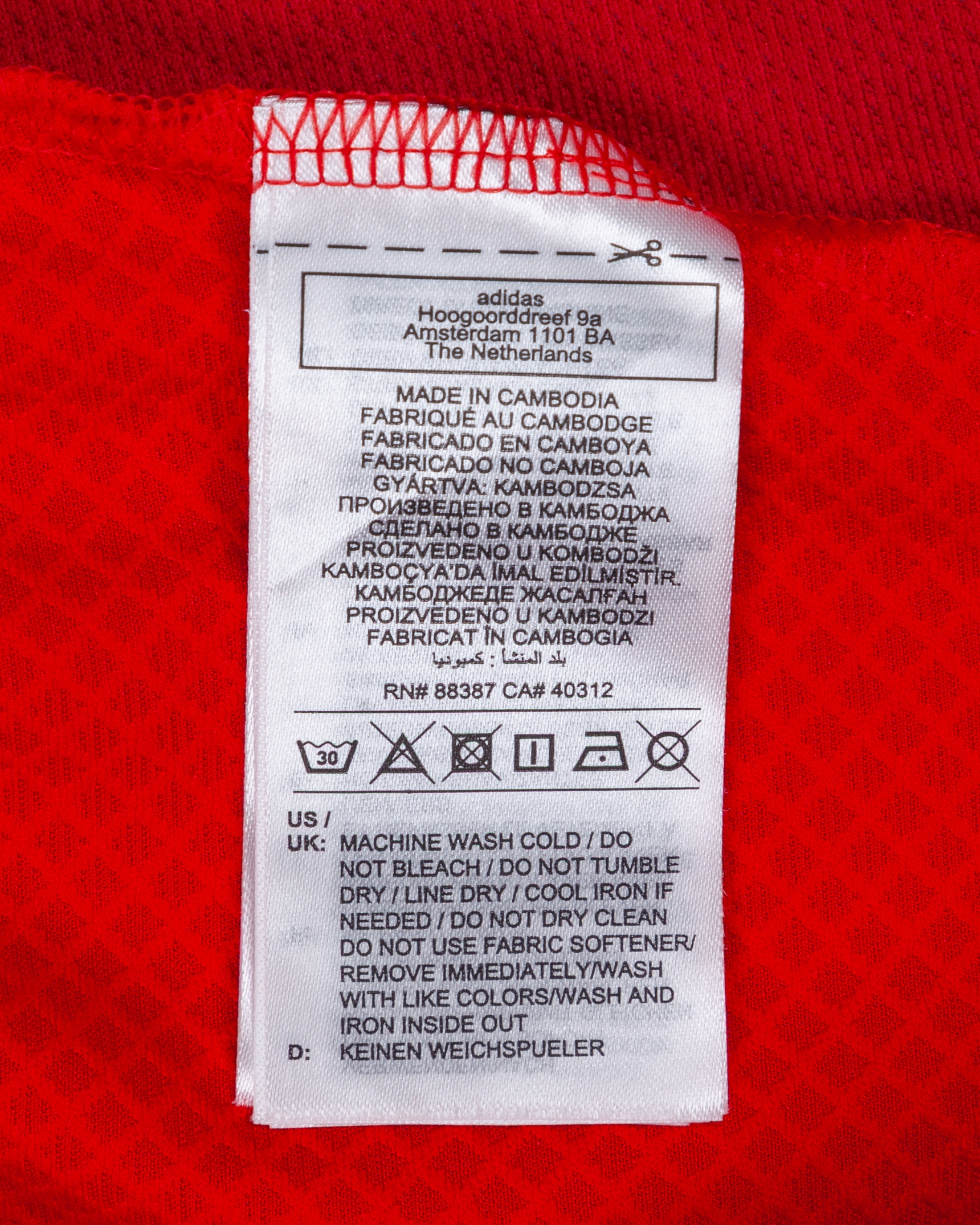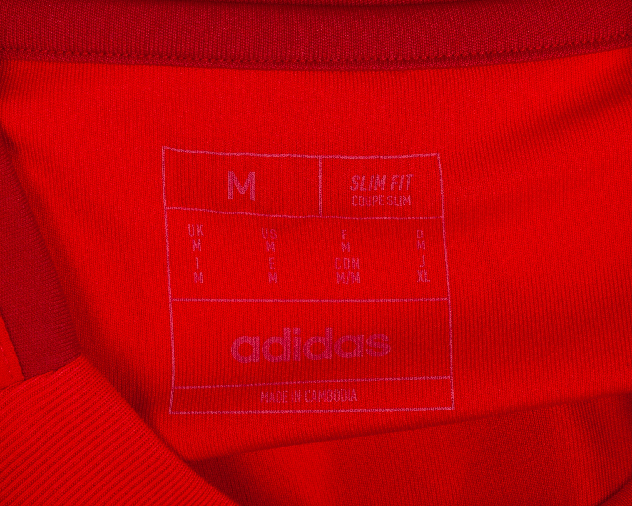 Alex Moreno red No.19 Nottingham Forest match issued short-sleeved shirt, 2025, Adidas, M, with crew-neck collar and embroidered badge inscribed FOREST, the reverse lettered ALEX MORENO, the right sleeve with Premier League flash