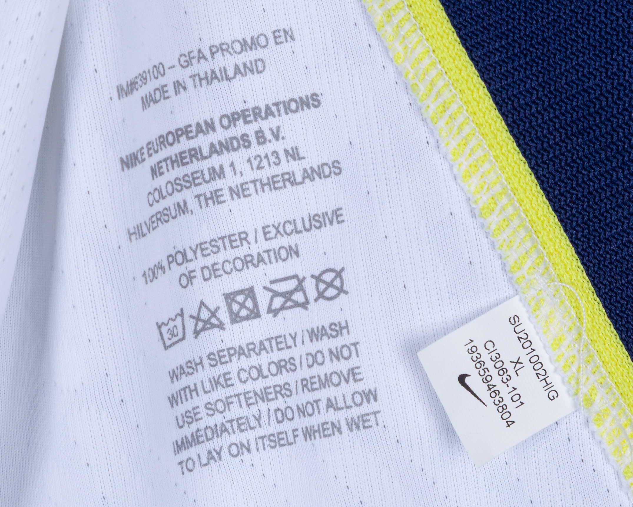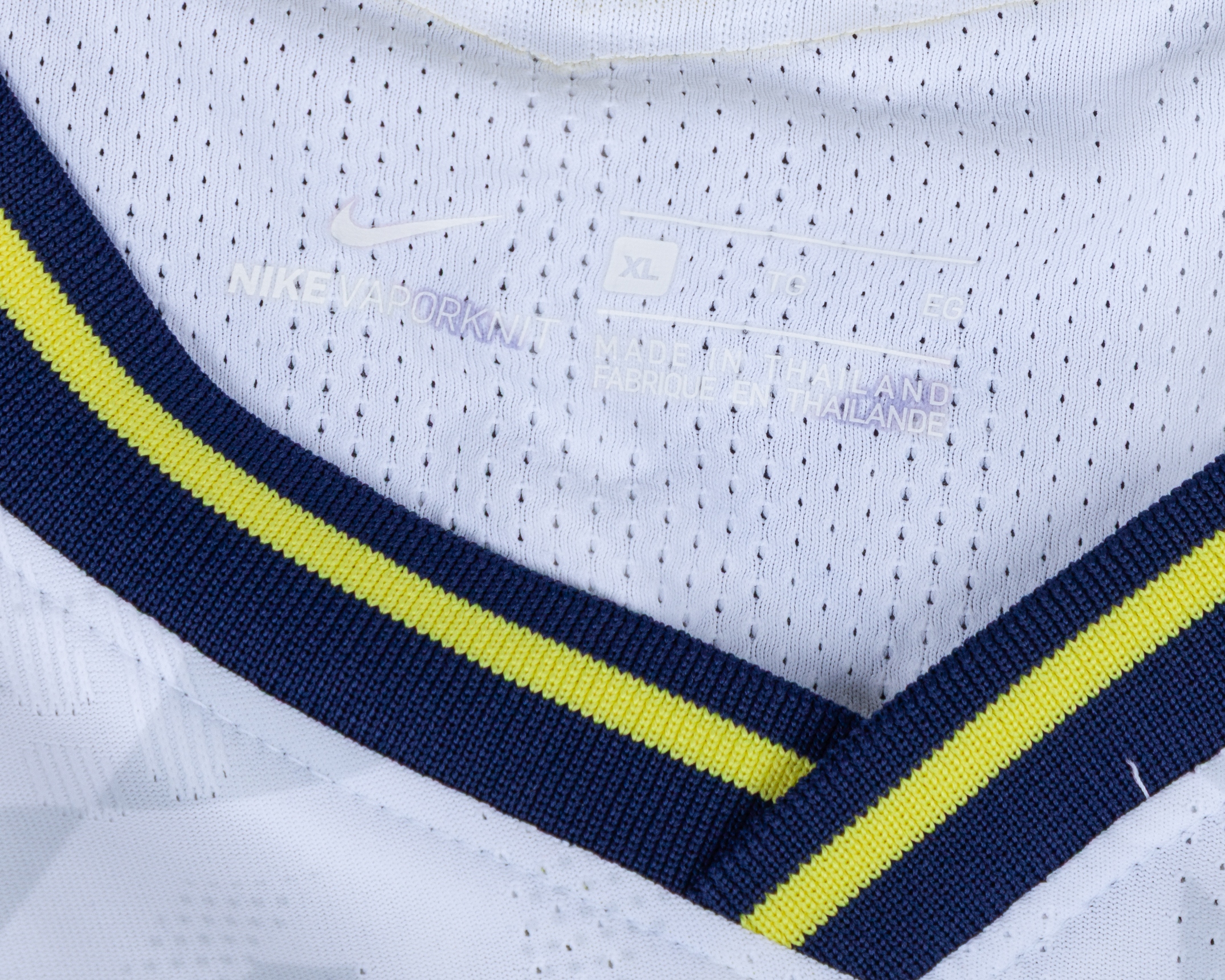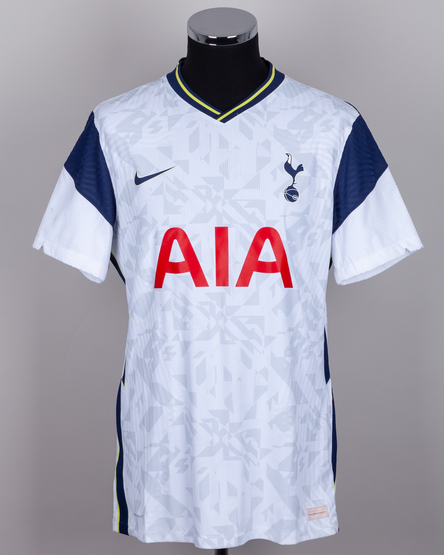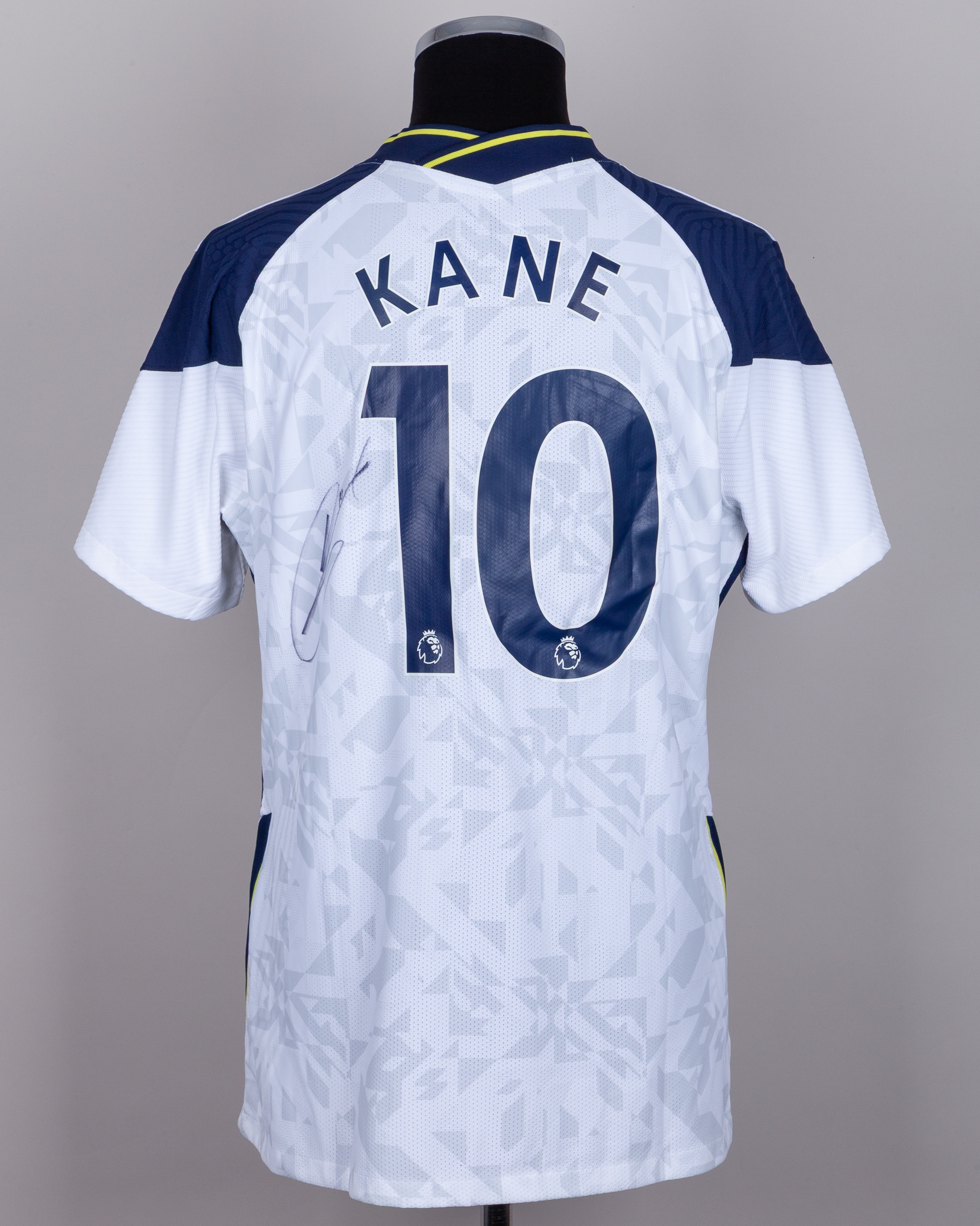 Harry Kane white and blue No.10 Tottenham Hotspur autographed short-sleeved shirt, 2020-21, Nike, XL, with v-neck collar and printed badge, the reverse lettered KANE, the back of the shirt autographed