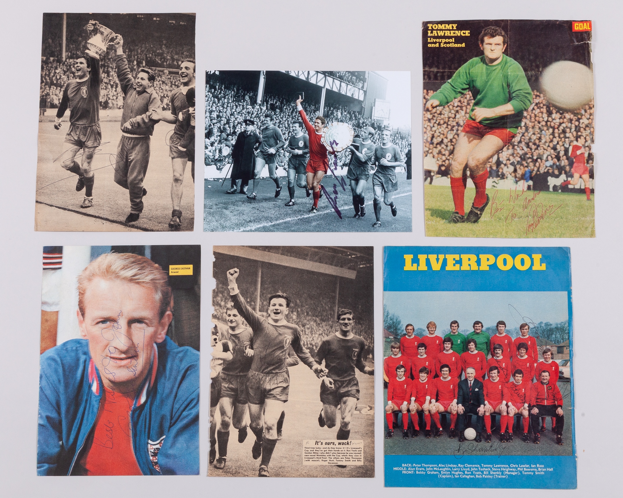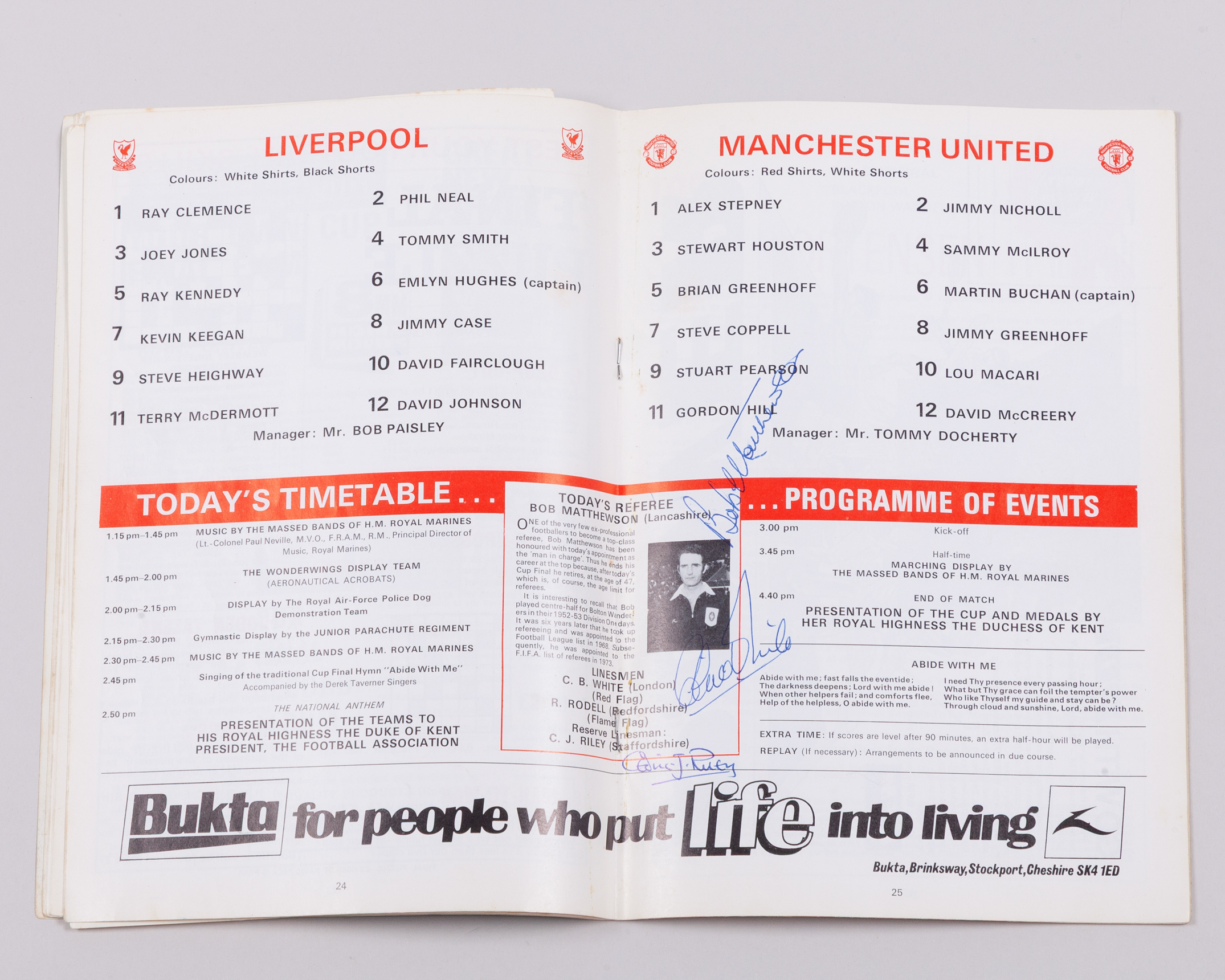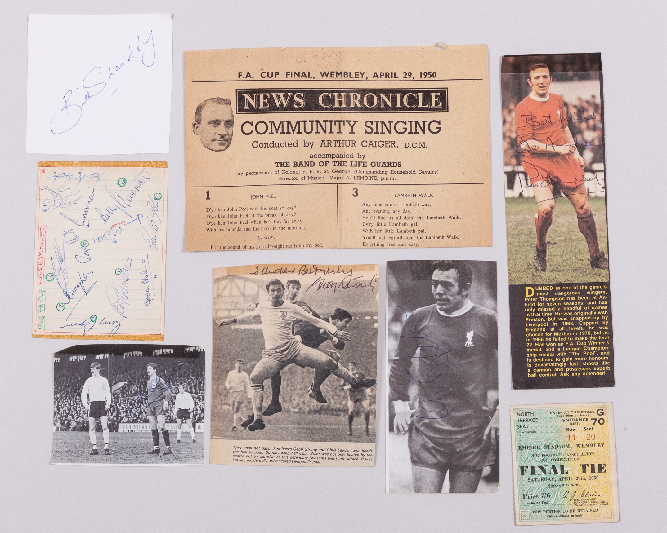 Four Liverpool F.A.Cup Final programmes and relating autographs, including 1950, 1965, autographed 1974 and autographed 1977 programmes, News Chronicle F.A.Cup Final 1950 community singing sheet and ticket stub