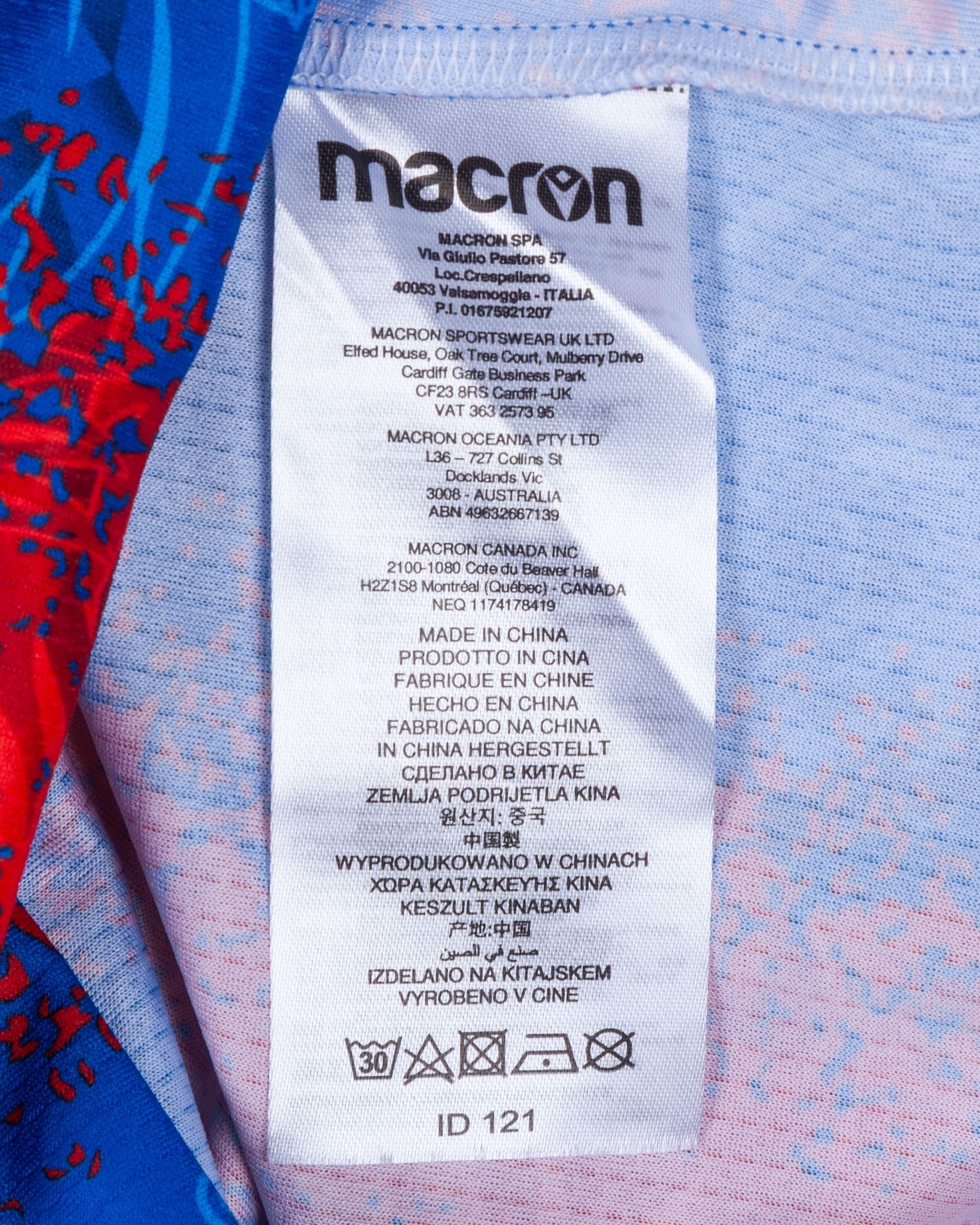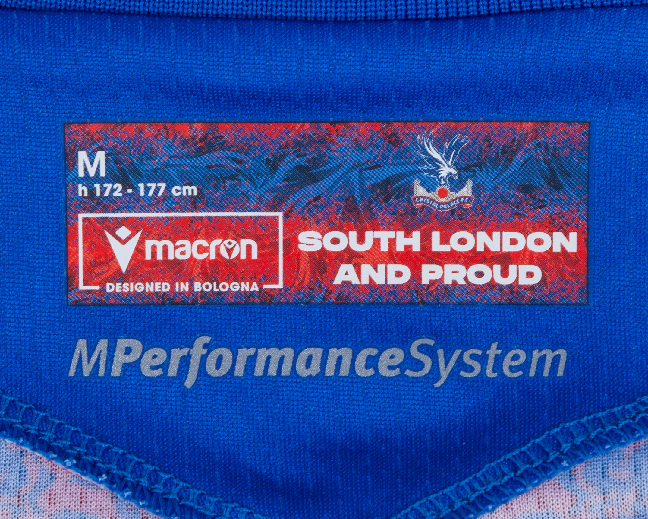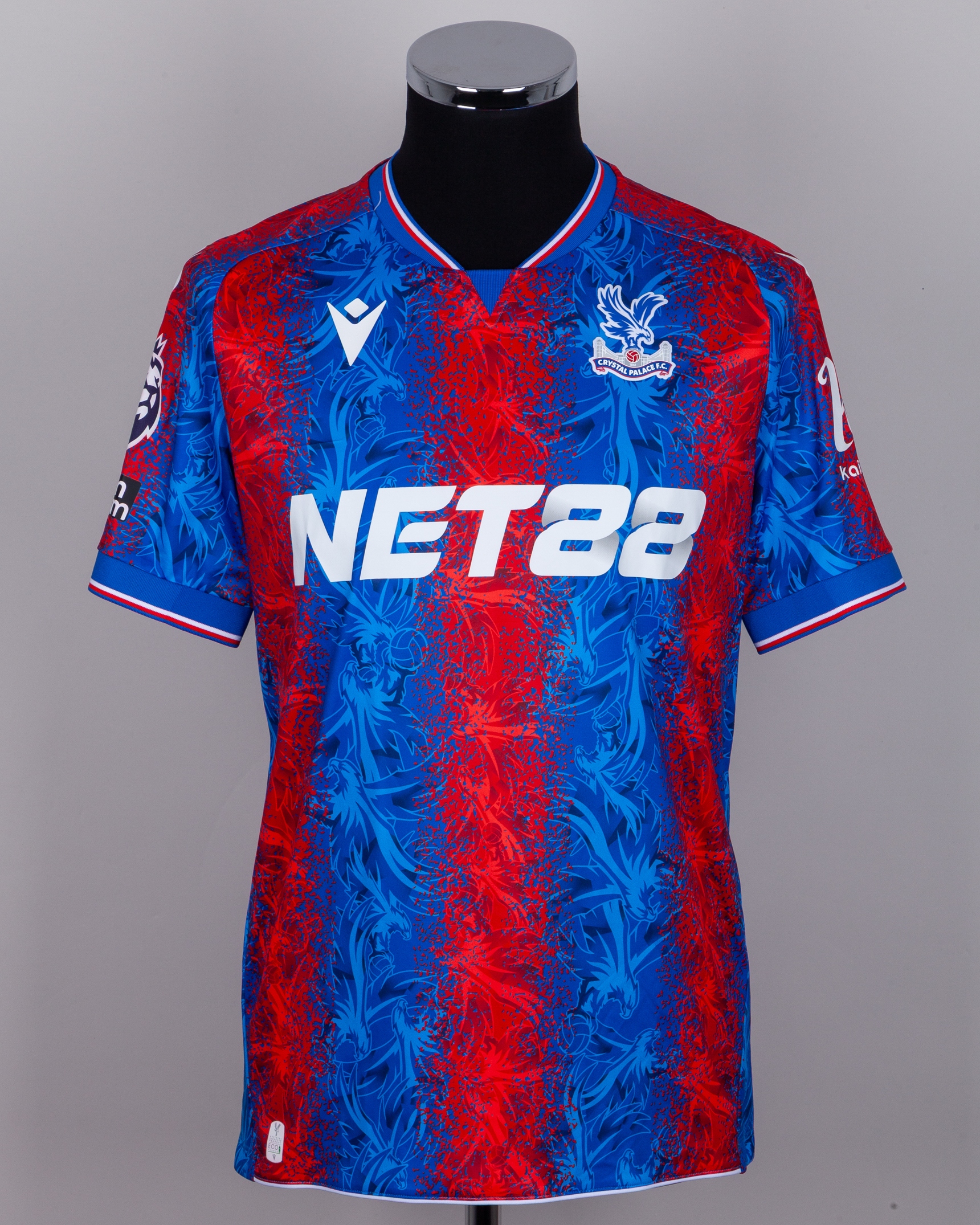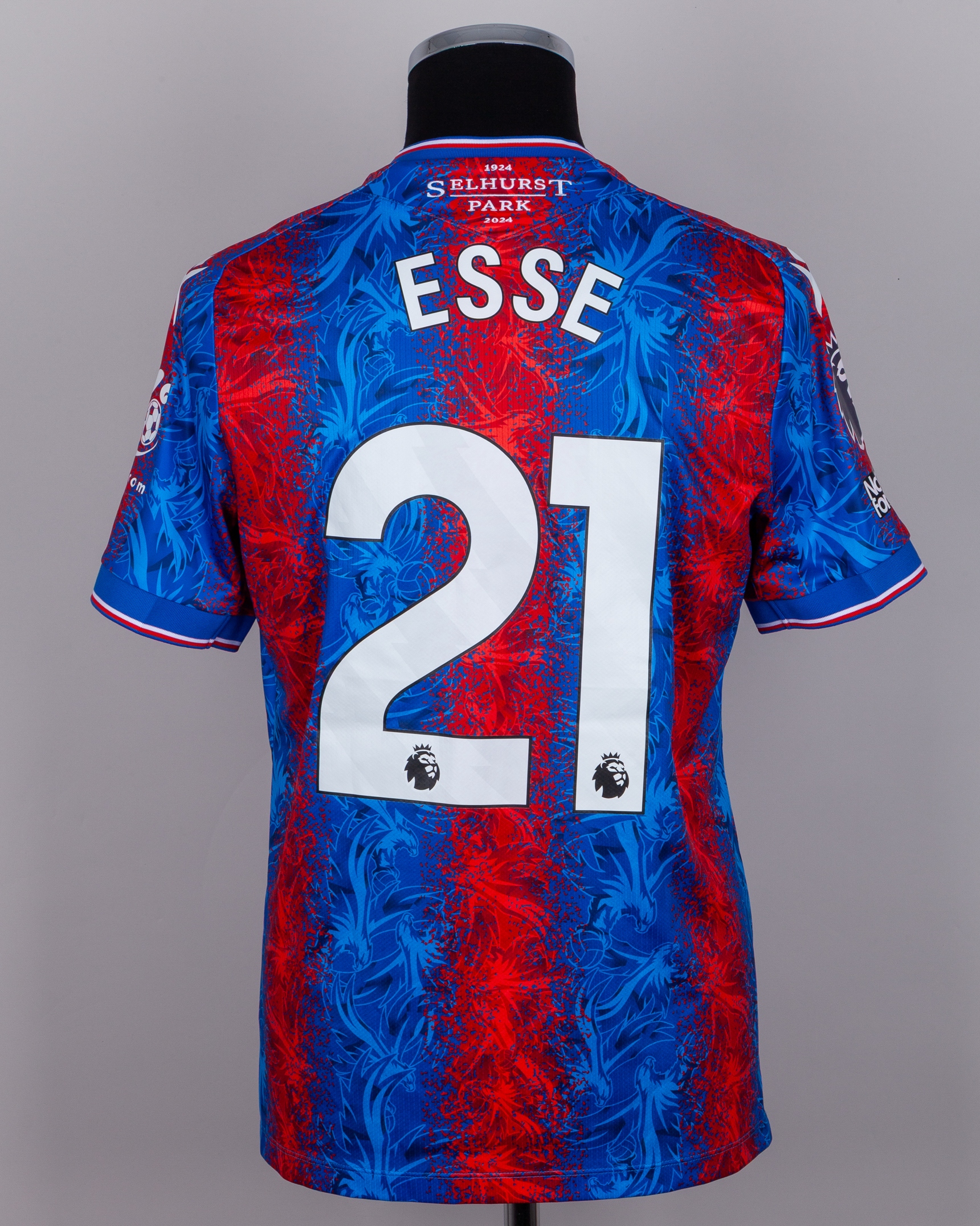 Romain Esse blue and red No.21 Crystal Palace v. Tottenham Hotspur match issued short-sleeved shirt, 2025, Macron, M, with v-neck collar and printed badge, the reverse lettered ESSE and embroidered 1924 SELHURST PARK 2024, the right sleeve with Premier League flash