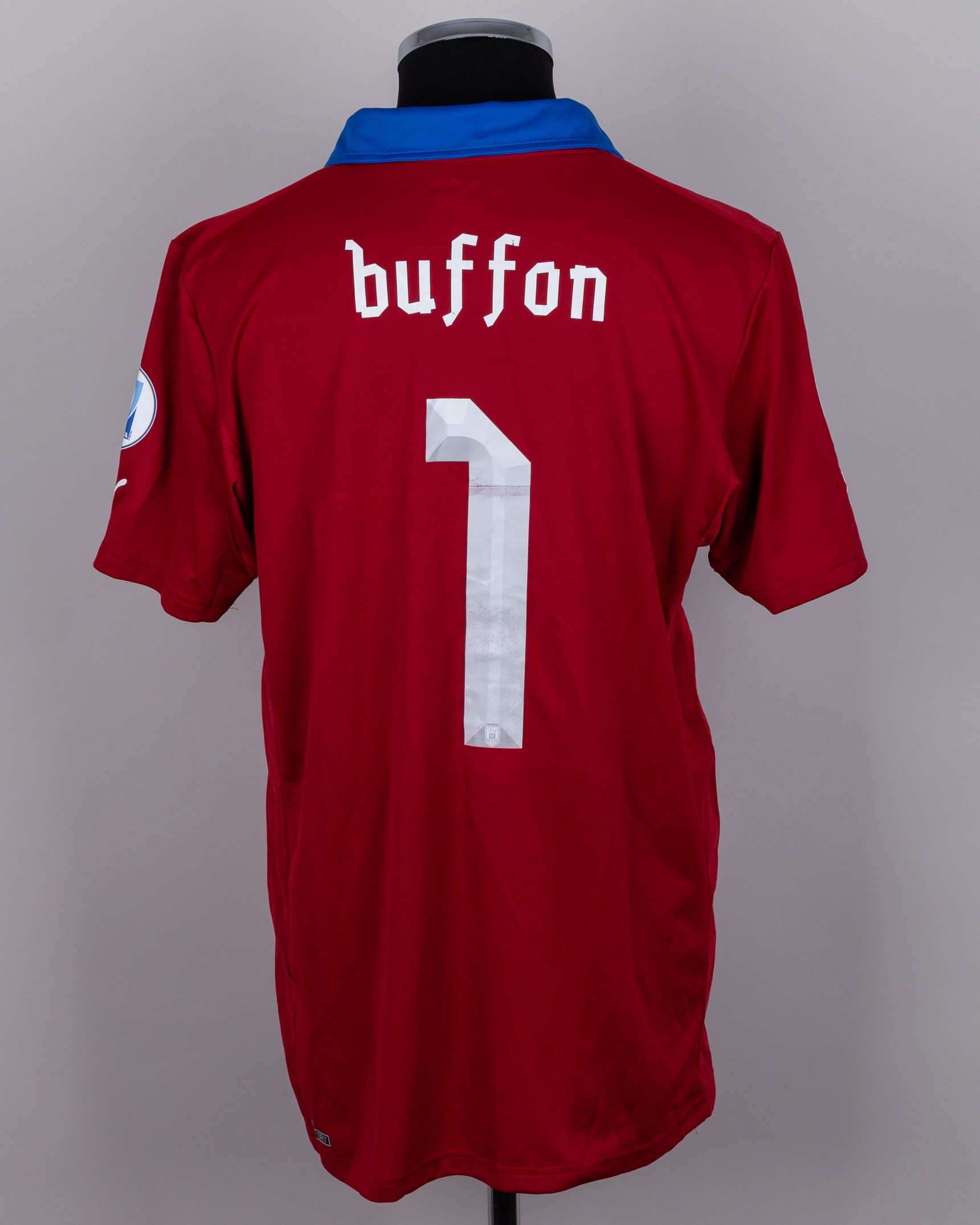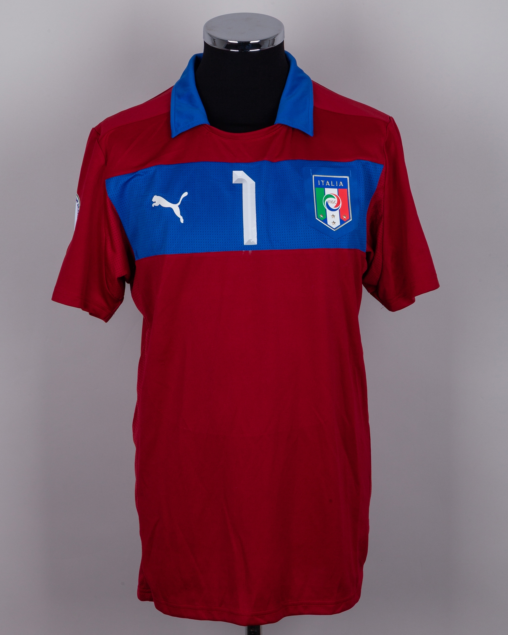 Gianluigi Buffon blue and red No.1 Italy v. Bulgaria match worn short-sleeved shirt, 2013
