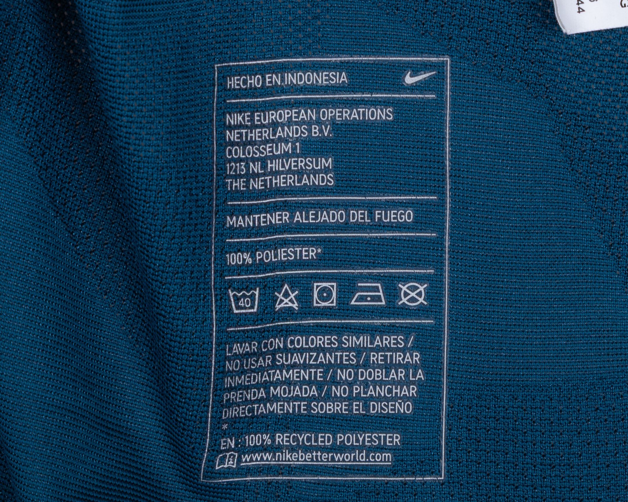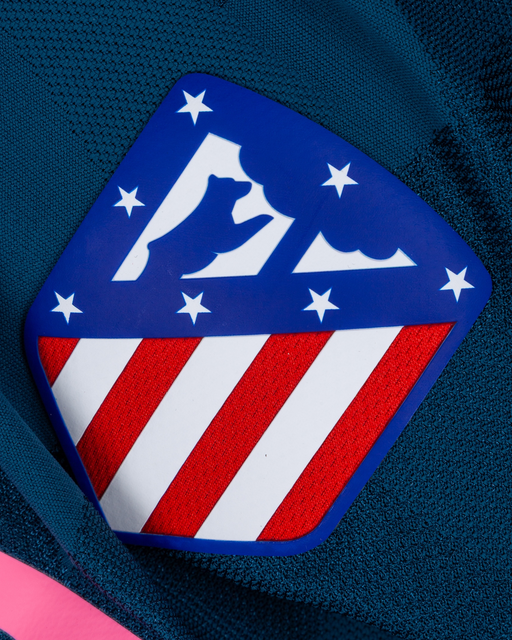Antoinne Griezmann blue and pink No.7 Atletico Madrid match issued short-sleeved shirt, Nike, S, with crew-neck collar and printed badge, the reverse lettered GRIEZMANN, the right sleeve with La Liga flash