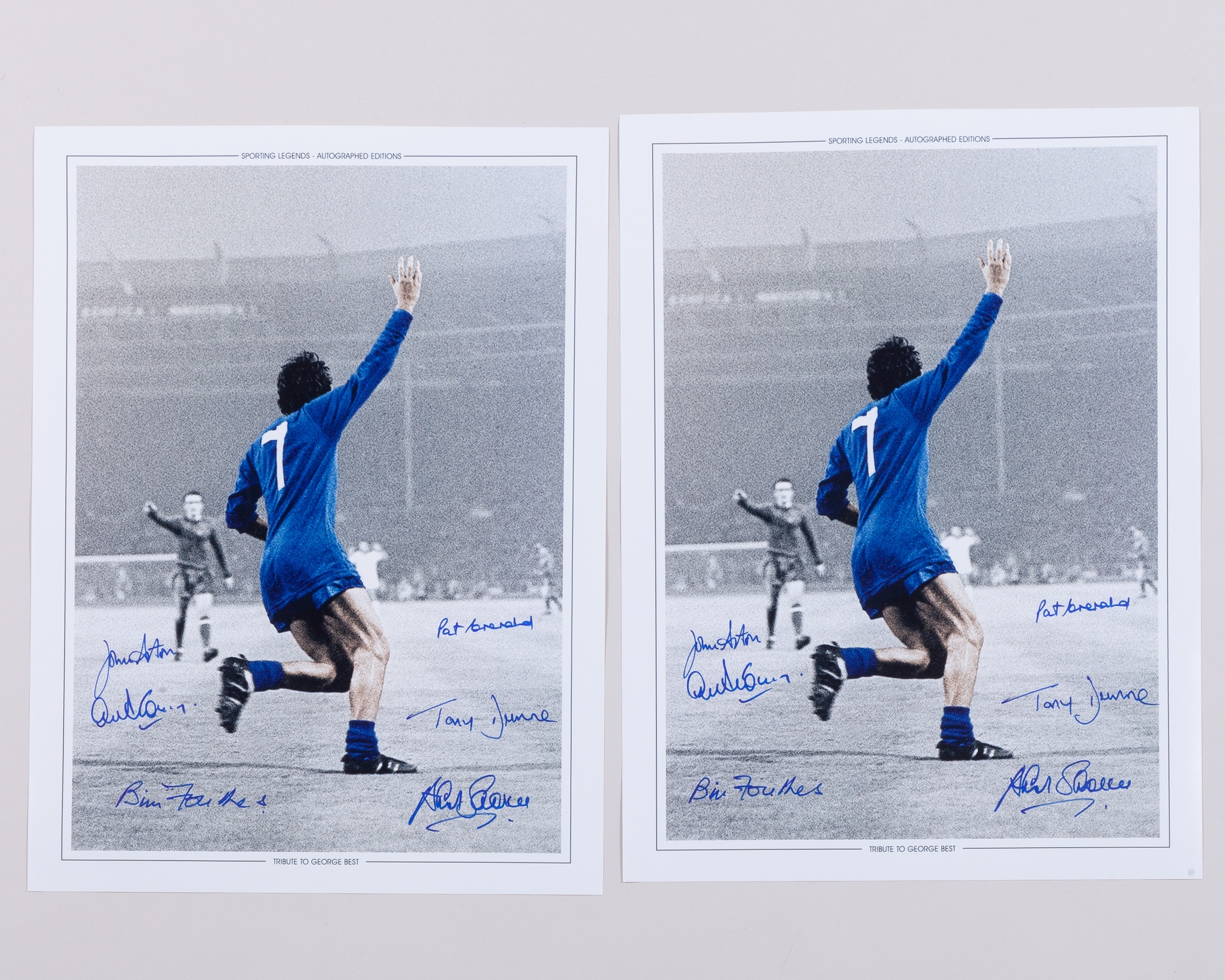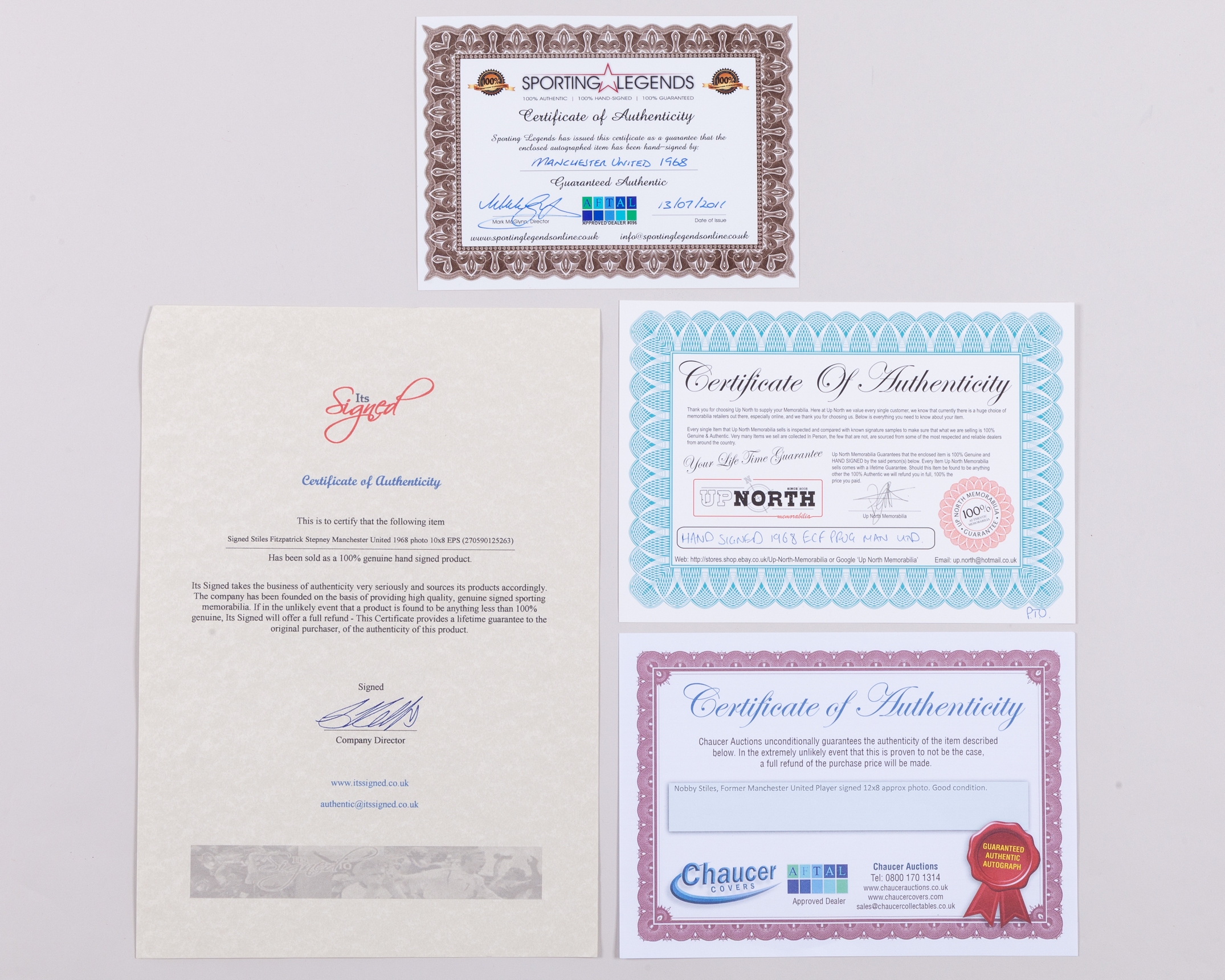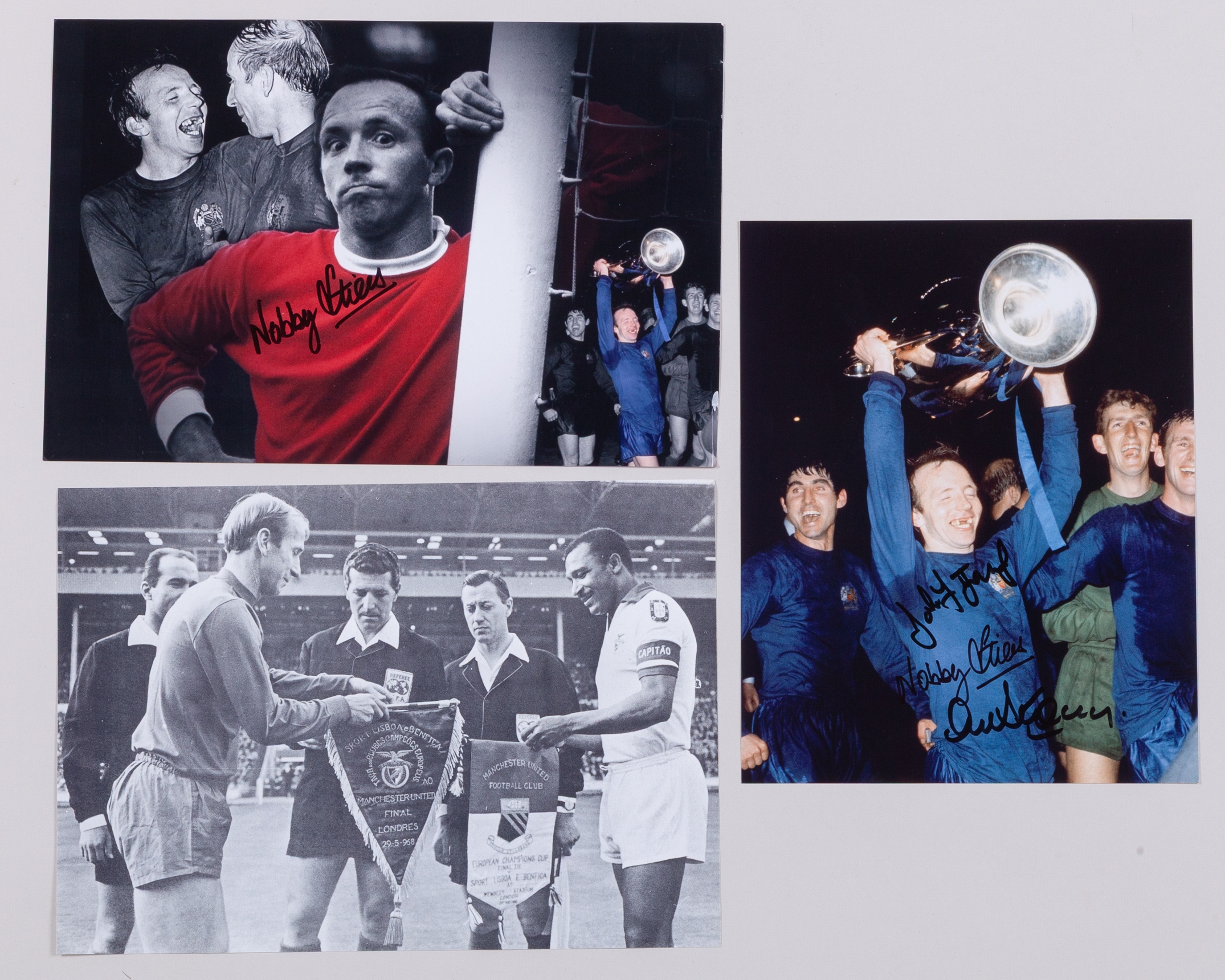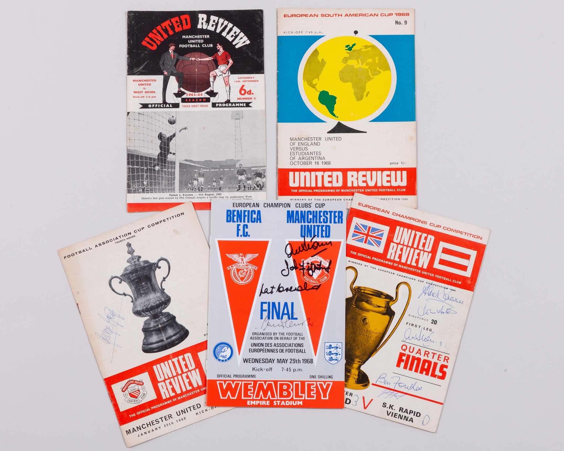 Manchester United 1960s autographs and programmes, four programmes including v. West Brom 14th September 1963, v. Estudiantes 16th October 1968, George Best autographed v. Watford 25th January 1969 and autographed v. Rapid Vienna 26th February 1969, autographed 1968 European Champions Final replica programme with COA, three autographed photographs with COA's, three autographed cards, Alex Stepney autographed glove