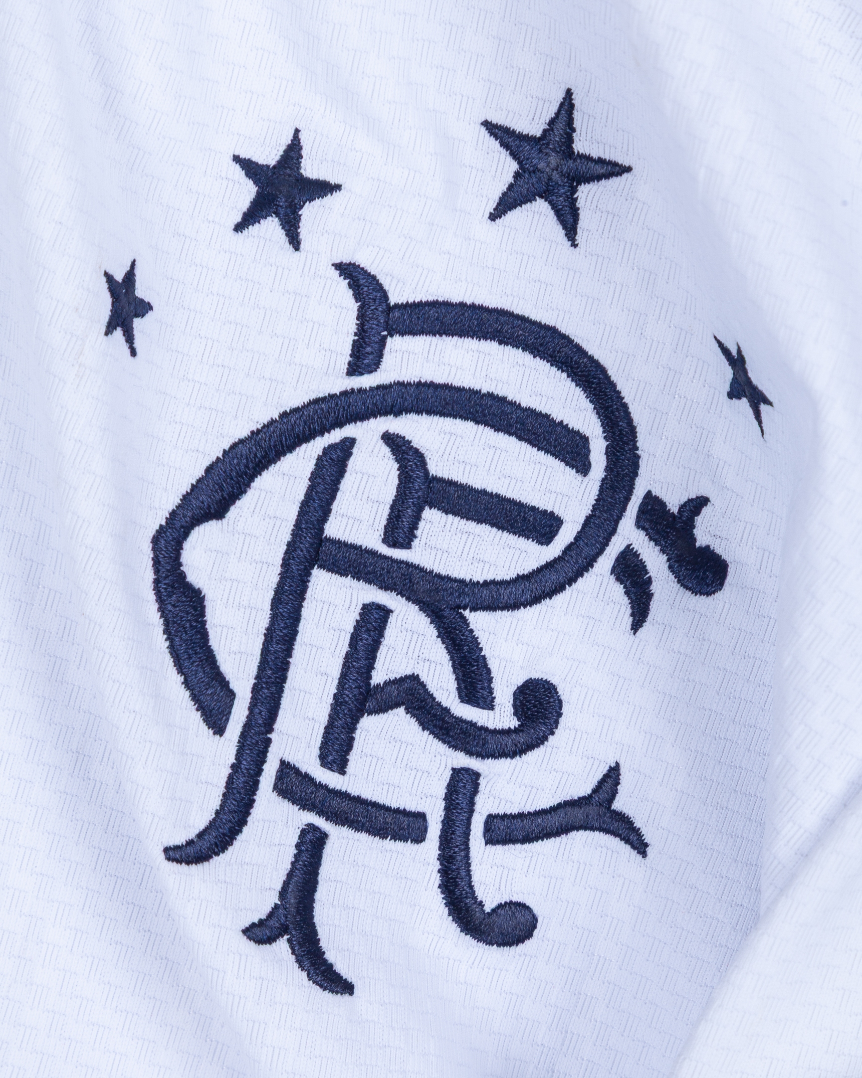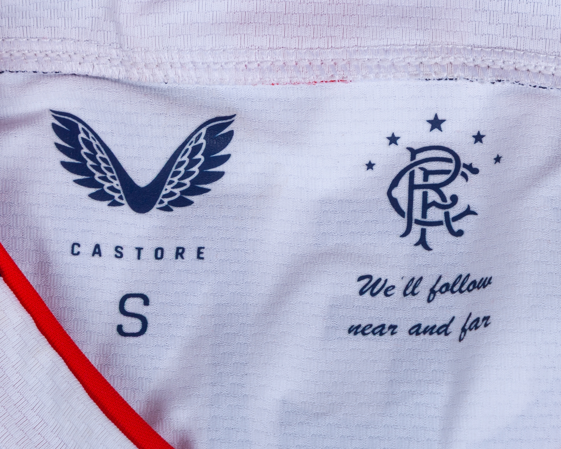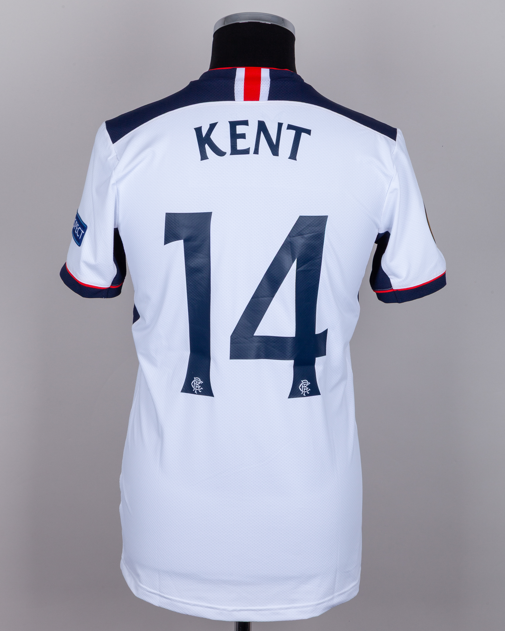 Ryan Kent white and blue No.14 Rangers v. Lech Poznan match issued short-sleeved shirt, 2020, Castore, S, with crew-neck collar and embroidered badge inscribed RFC, the reverse lettered KENT, the right sleeve with Europa League flash, the other with UEFA Respect flash