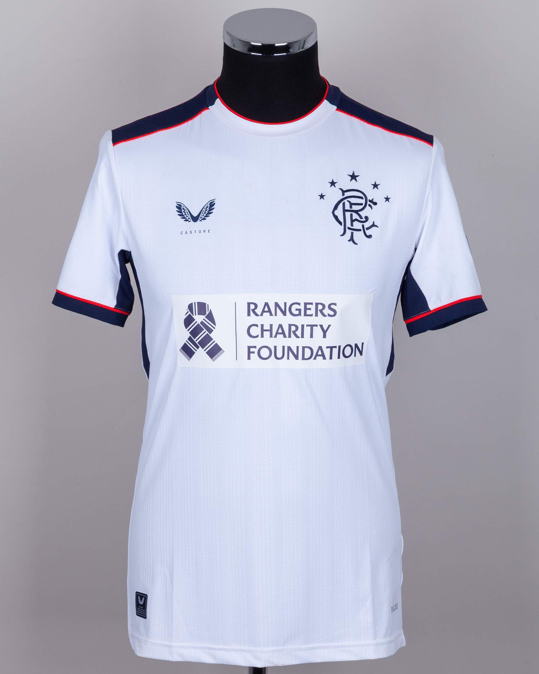 Ryan Kent white and blue No.14 Rangers v. Lech Poznan match issued short-sleeved shirt, 2020