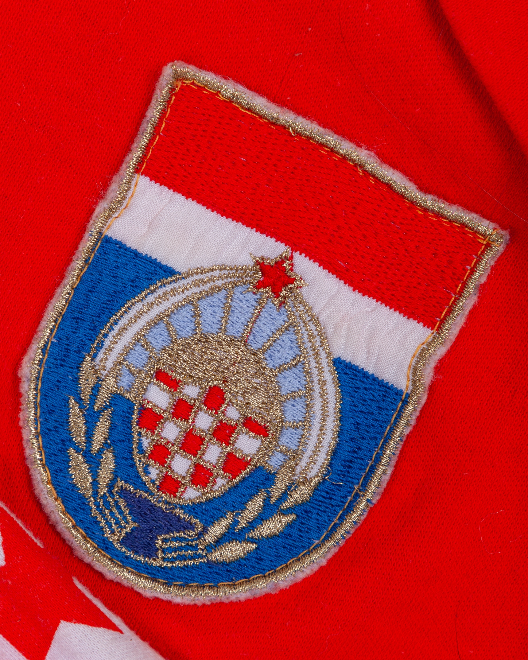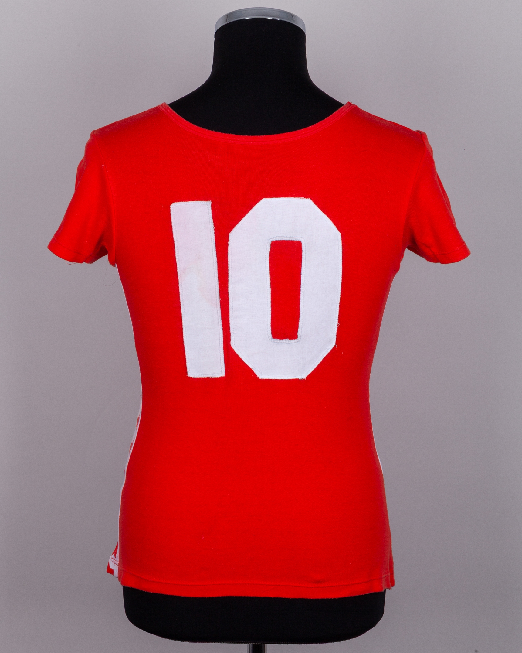 A rare red No.10 shirt, 1980s, Yassa, with crew-neck collar and embroidered cloth badge