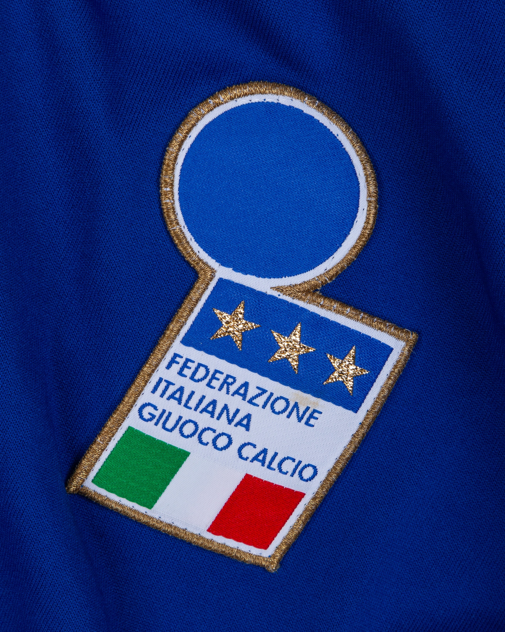 Gianluca Vialli blue No.9 Italy v. USSR match worn long-sleeved shirt, 1991, Diadors, L, with crew-neck collar and embroidered cloth badge inscribed FEDERAZIONE ITALIANA GIUOCO CALCIO