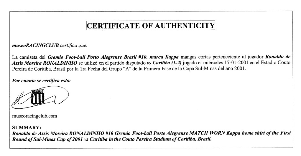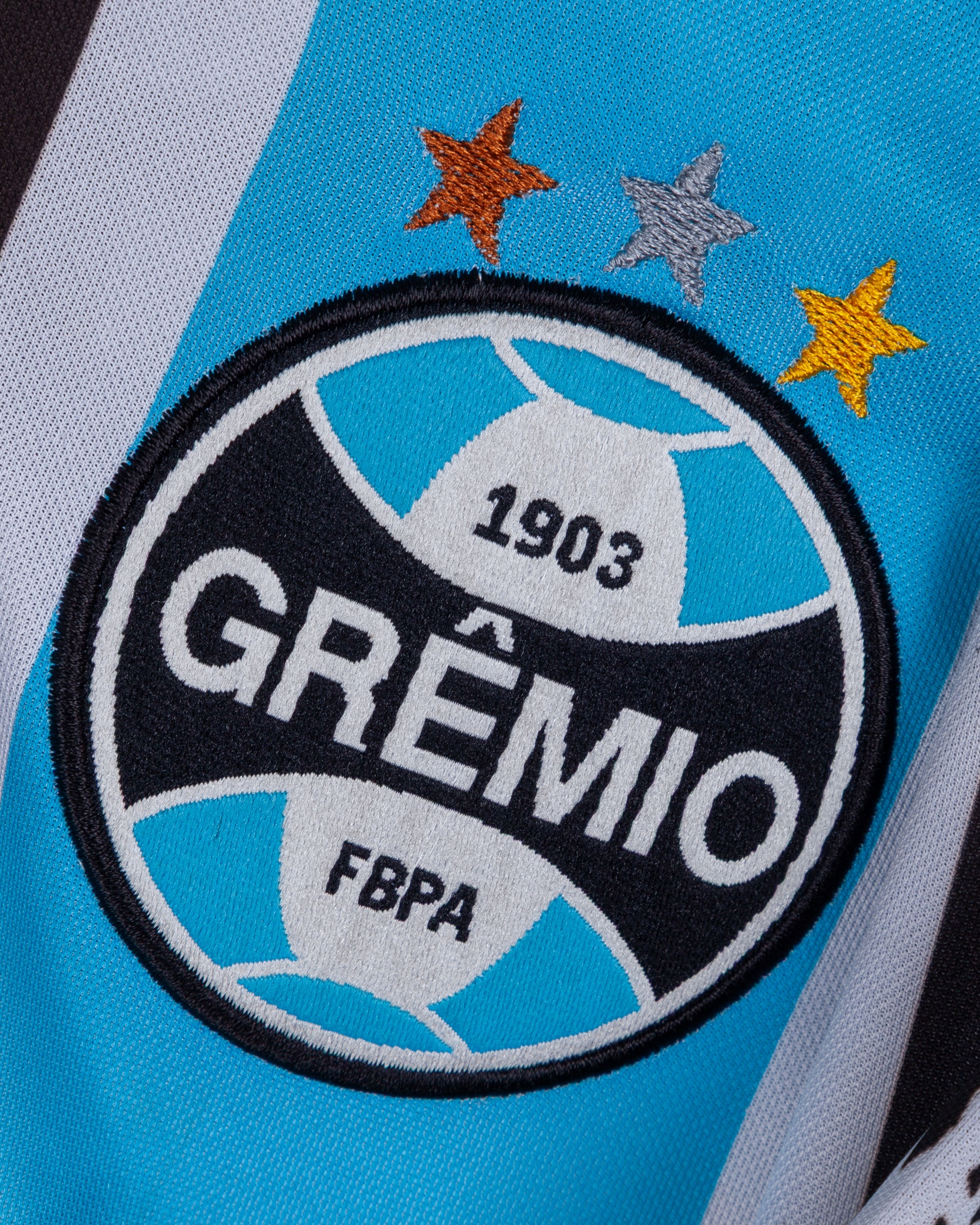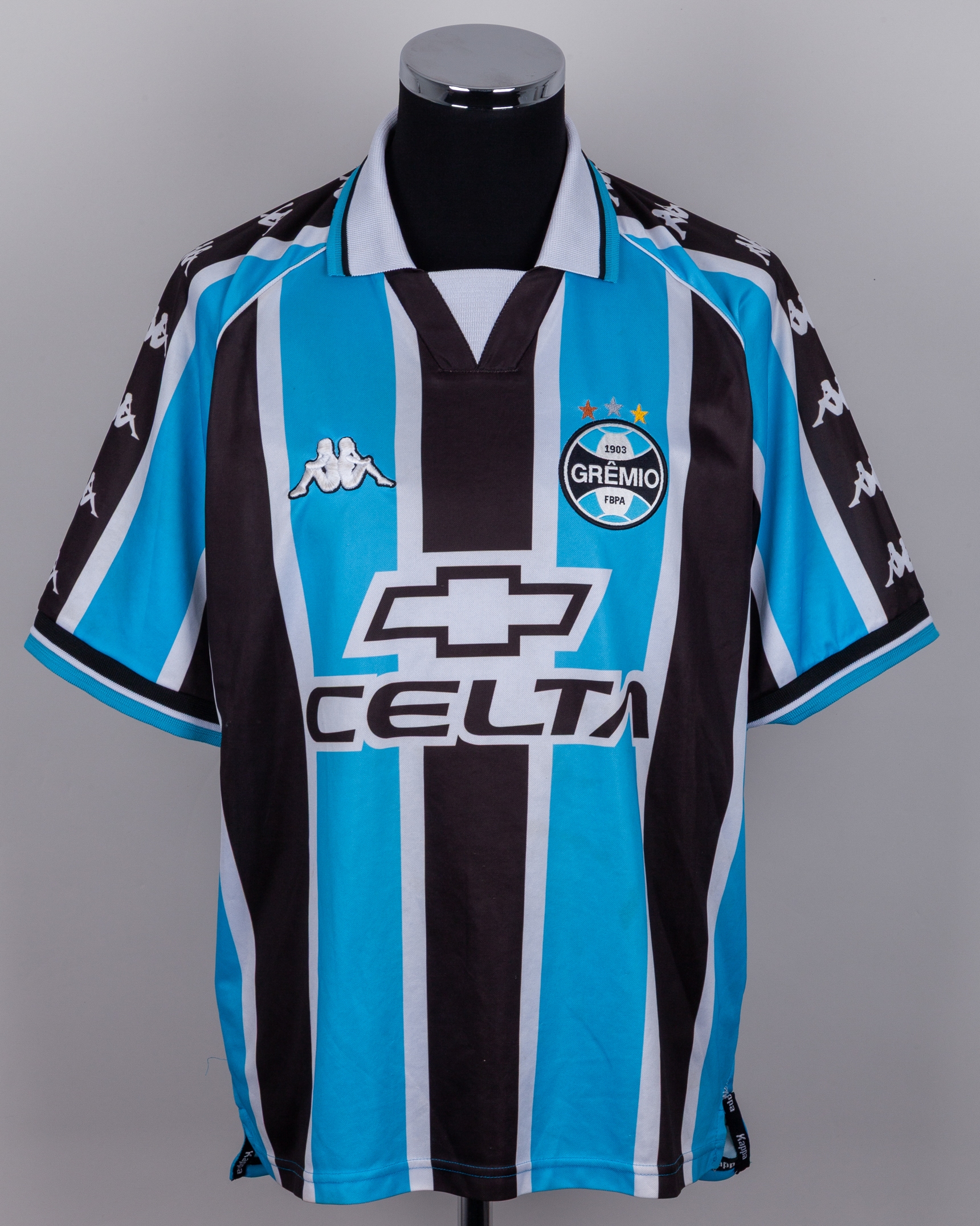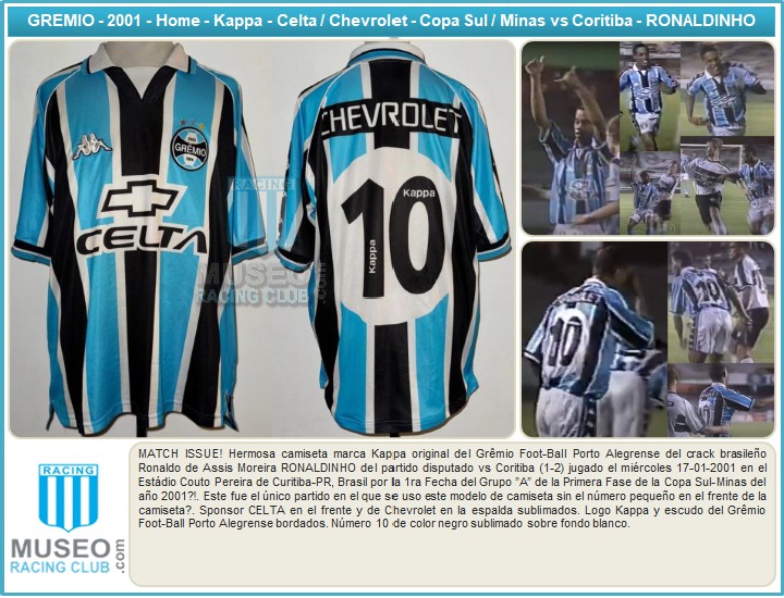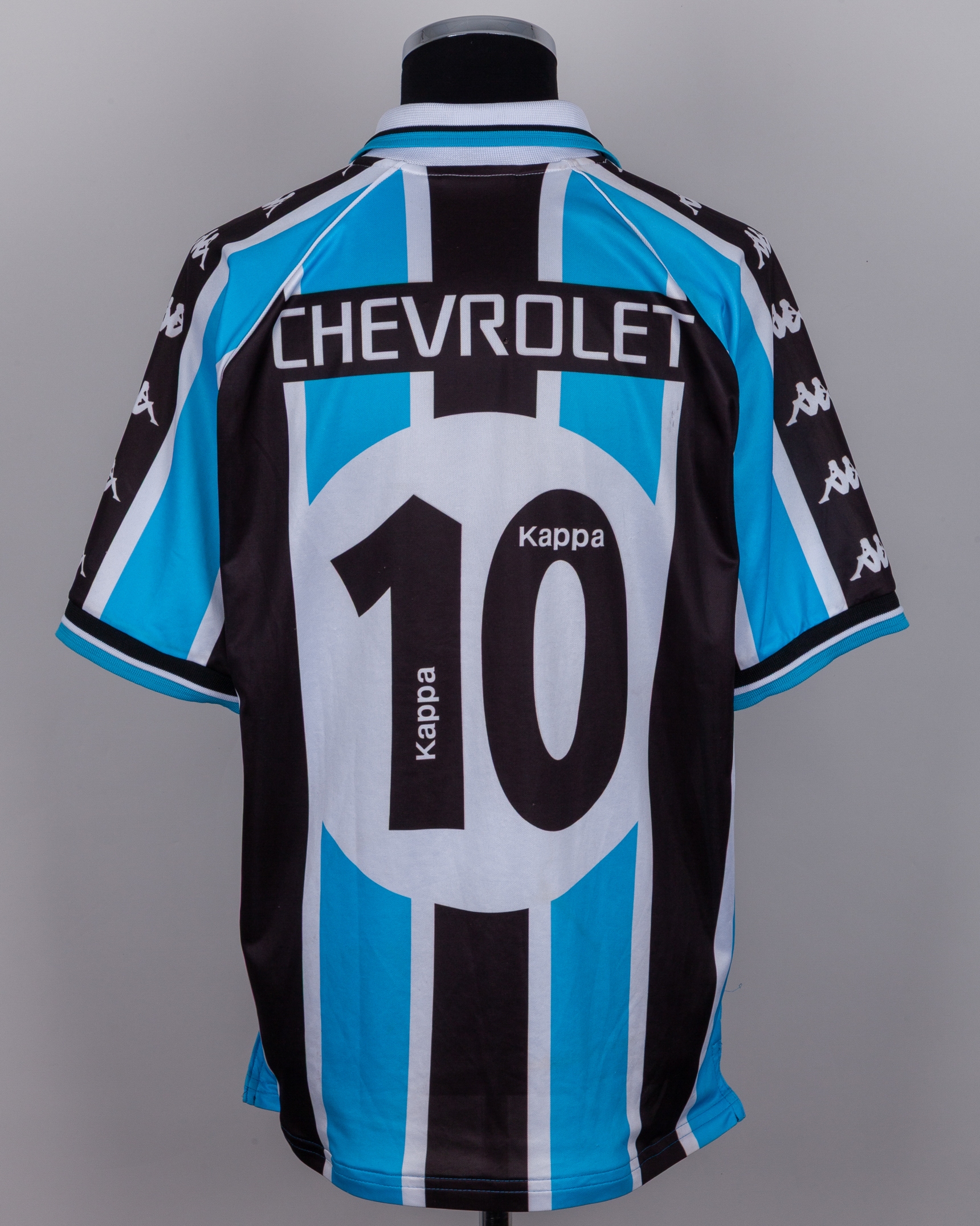 Ronaldinho blue and black No.10 Gremio v. Coritiba Copa Sul Minas match issued short-sleeved shirt, 2001, Kappa, with v-neck ctyle collar and embroidered cloth badge inscribed GREMIO 1903 FBPA, with digital COA from Racing Club Museum