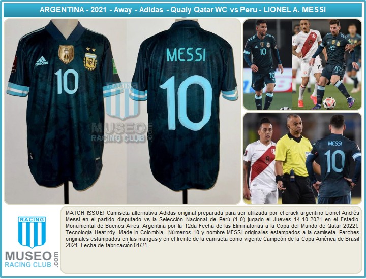 Lionel Messi blue No.10 Argentina v. Peru match issued short-sleeved shirt, 2021, Adidas, 6, with v-neck collar and printed badge, with Conmebol Copa America Campeon 2021 badge, the reverse lettered MESSI, the right sleeve with 2022 FIFA World Cup qualifying flash, the other with FIFA Living Football, with digital COA from Racing Club Museum