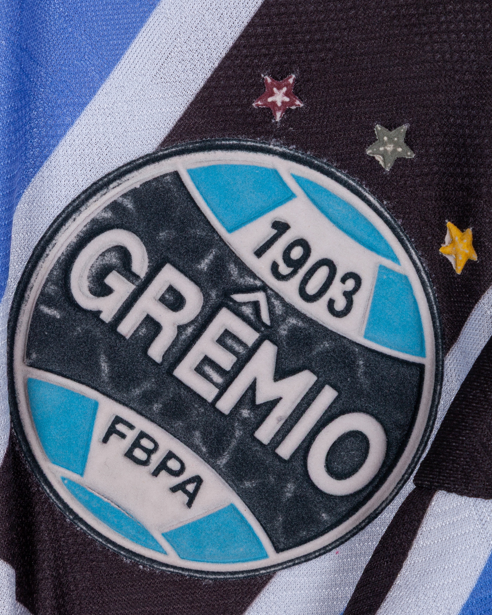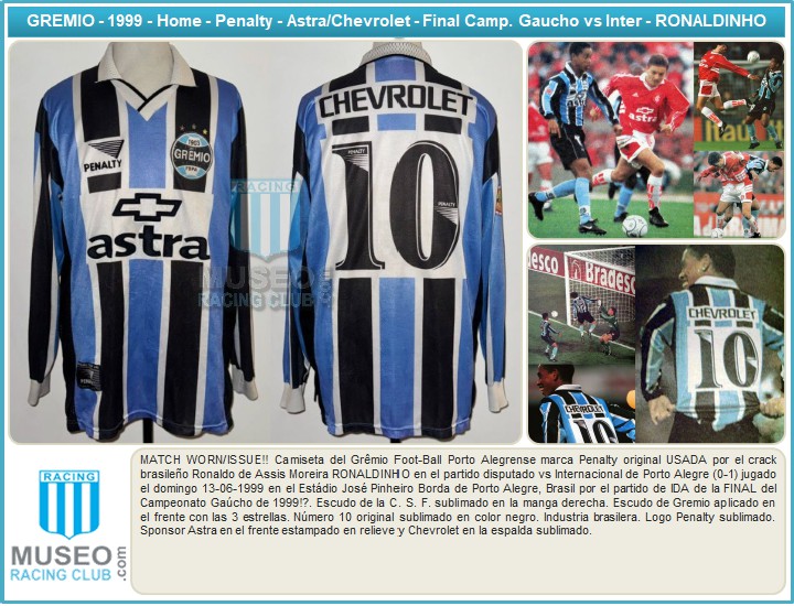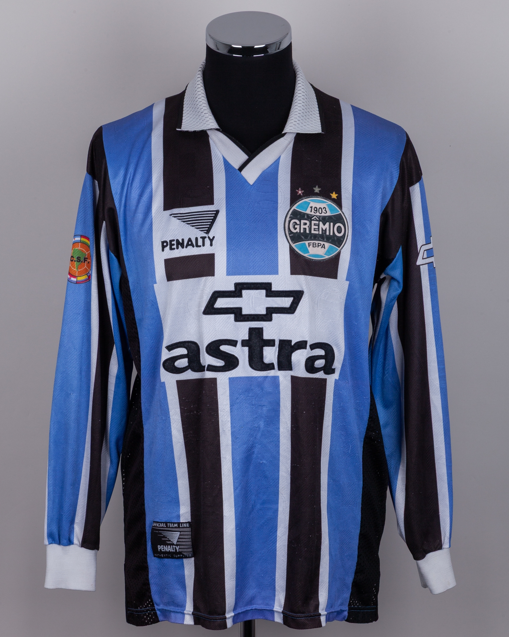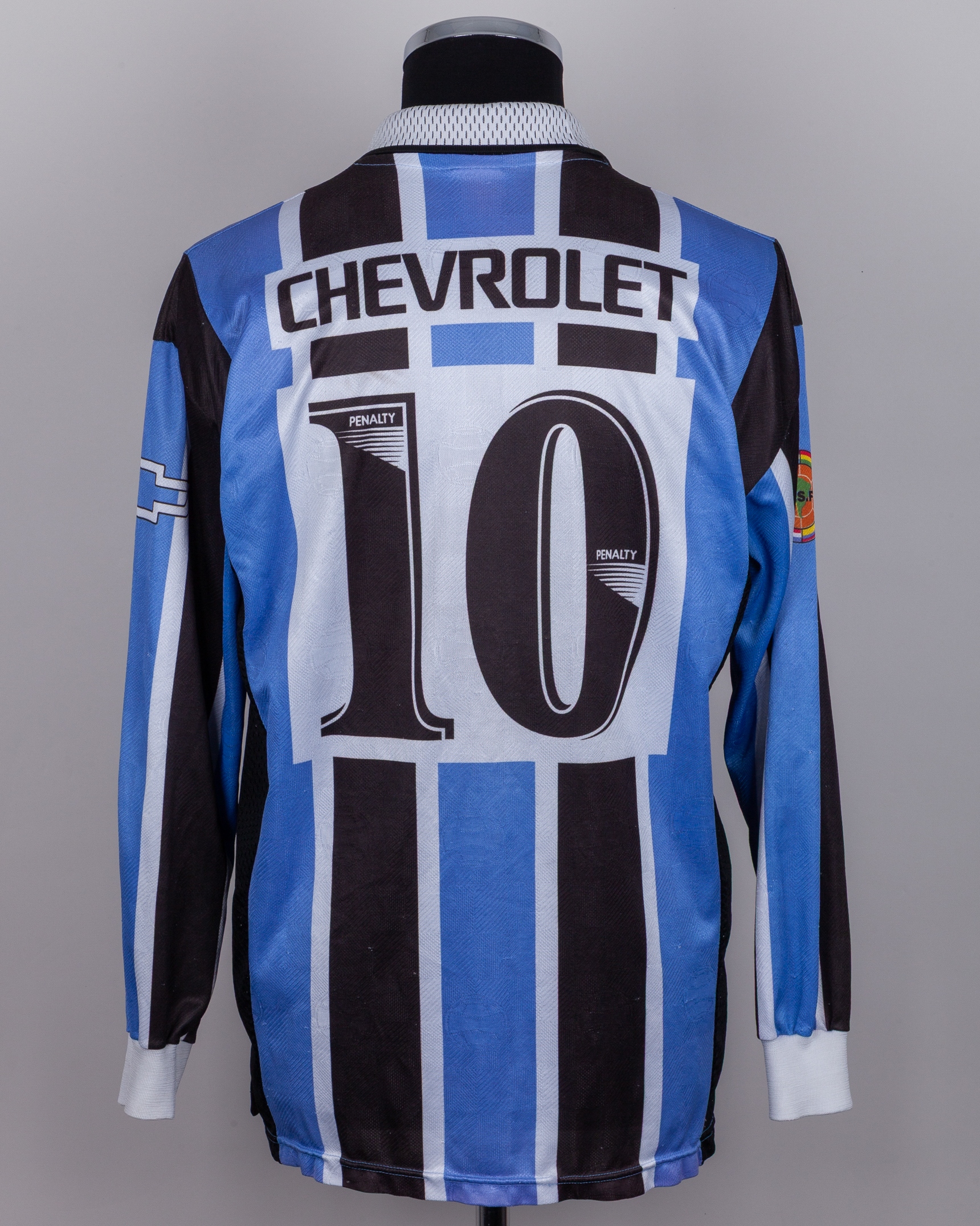 Ronaldinho blue and black No.10 Gremio v. Inter Milan Gaucho Final match issued/worn long-sleeved shirt, 1999, L, Penalty, with v-neck collar and embroidered cloth badge inscribed GREMIO 1903 FBPA, with digital COA from Racing Club Museum
