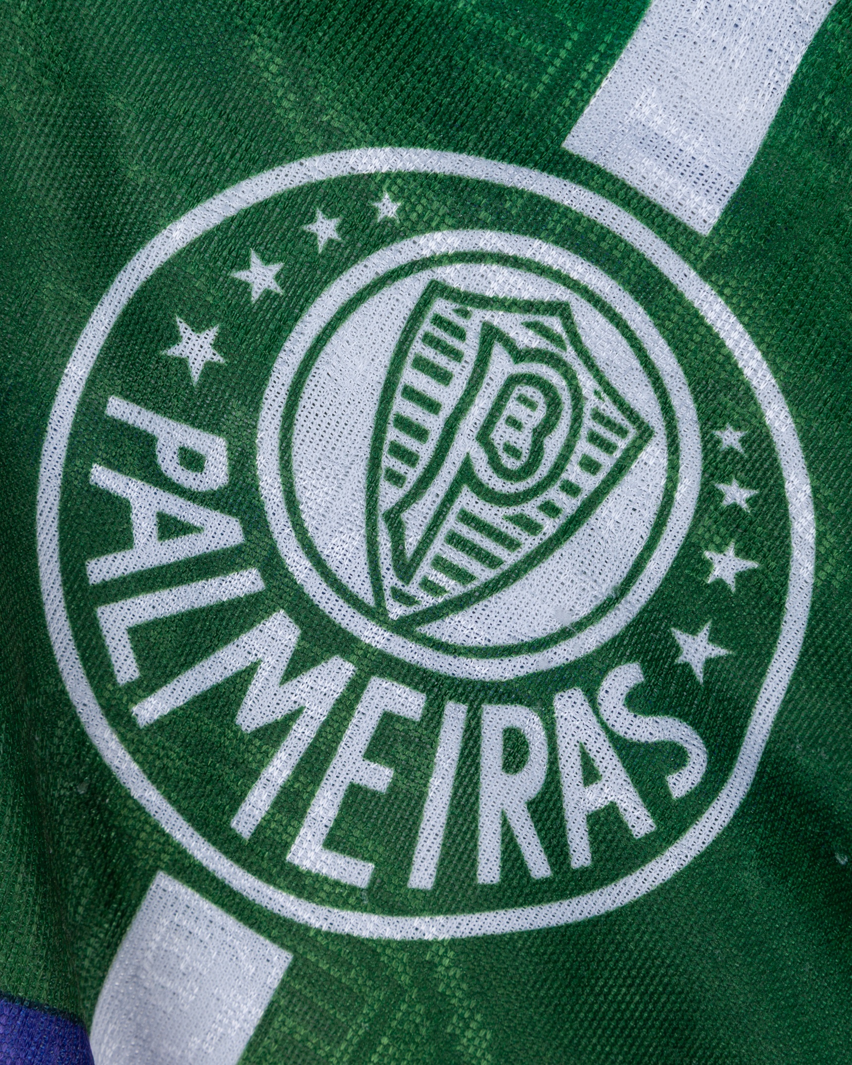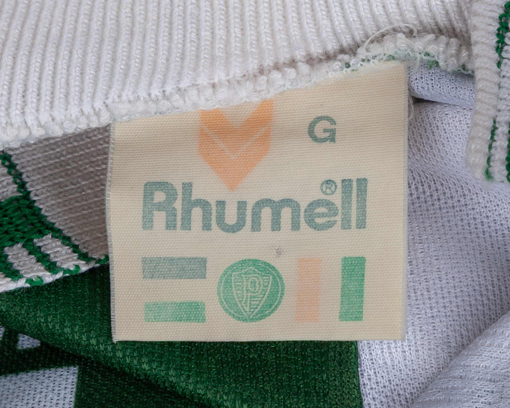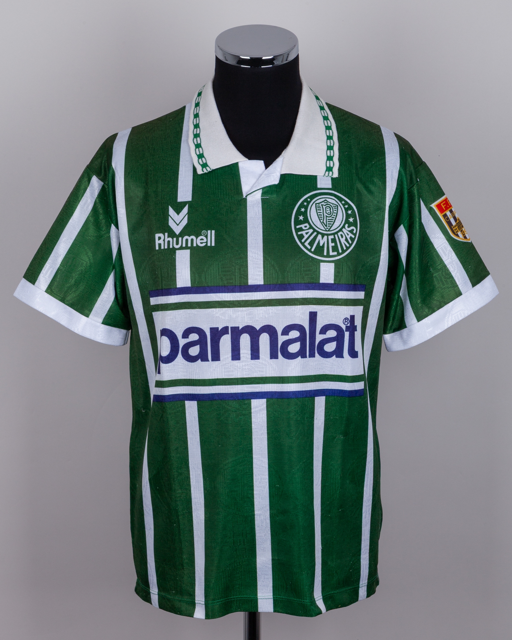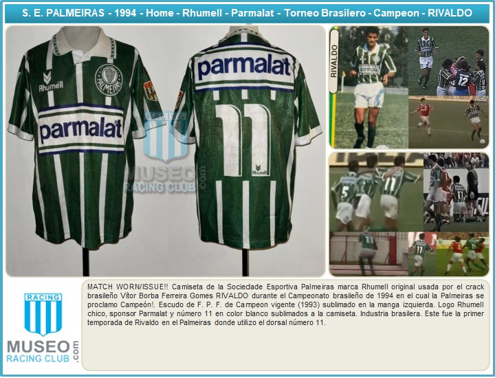 Rivaldo green and white No.11 Palmeiras match issued short-sleeved shirt, 1994, Rhumell, G, with v-neck collar and printed badge, with digital COA from Racing Club Museum