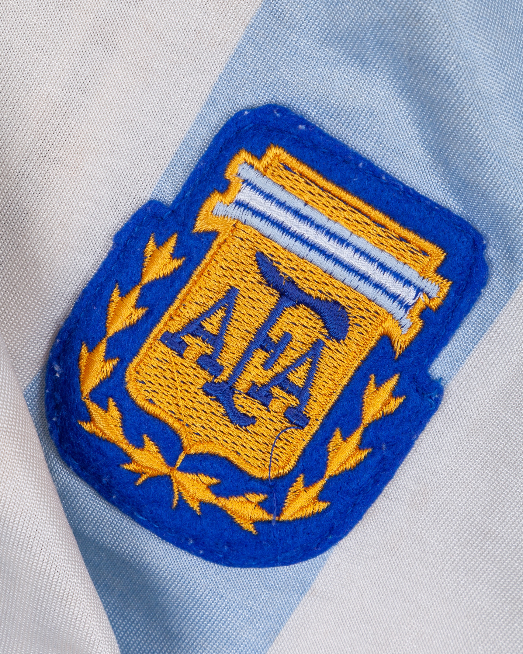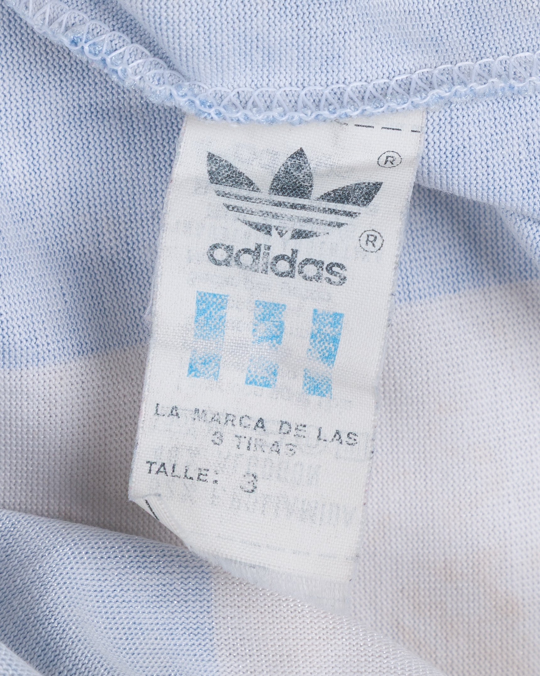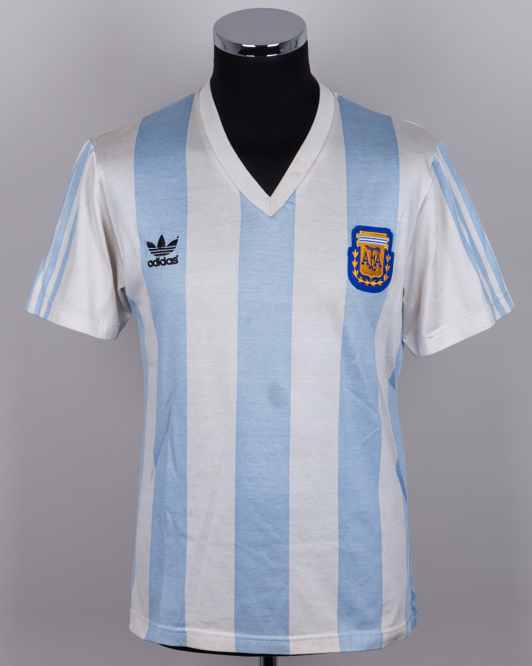 Gabriel Batistuta blue and white No.9 Argentina v. Saudi Arabia King Fahd Cup match worn shirt, 1992, Adidas, T4, with v-neck collar and embroidered cloth badge inscribed AFA, some discolouration and bobbling to front of shirt, with digital COA from Racing Club Museum