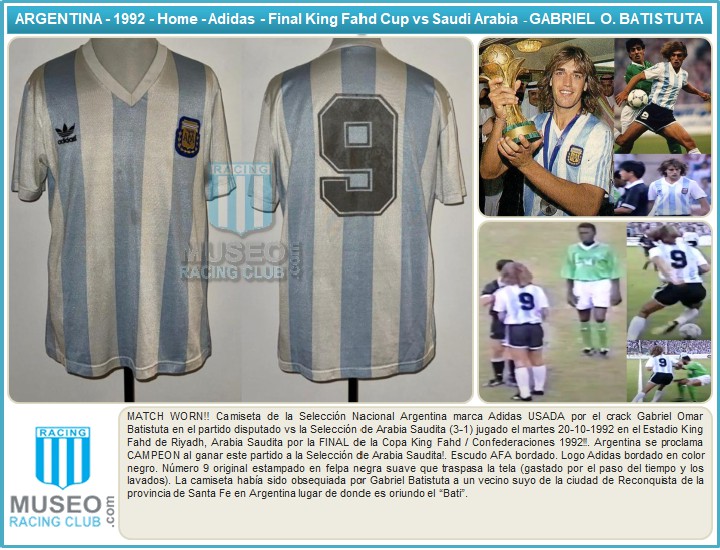 Gabriel Batistuta blue and white No.9 Argentina v. Saudi Arabia match worn shirt, 1992
