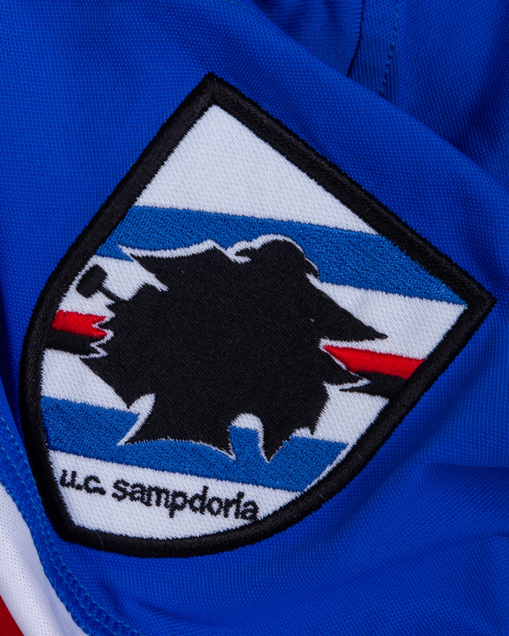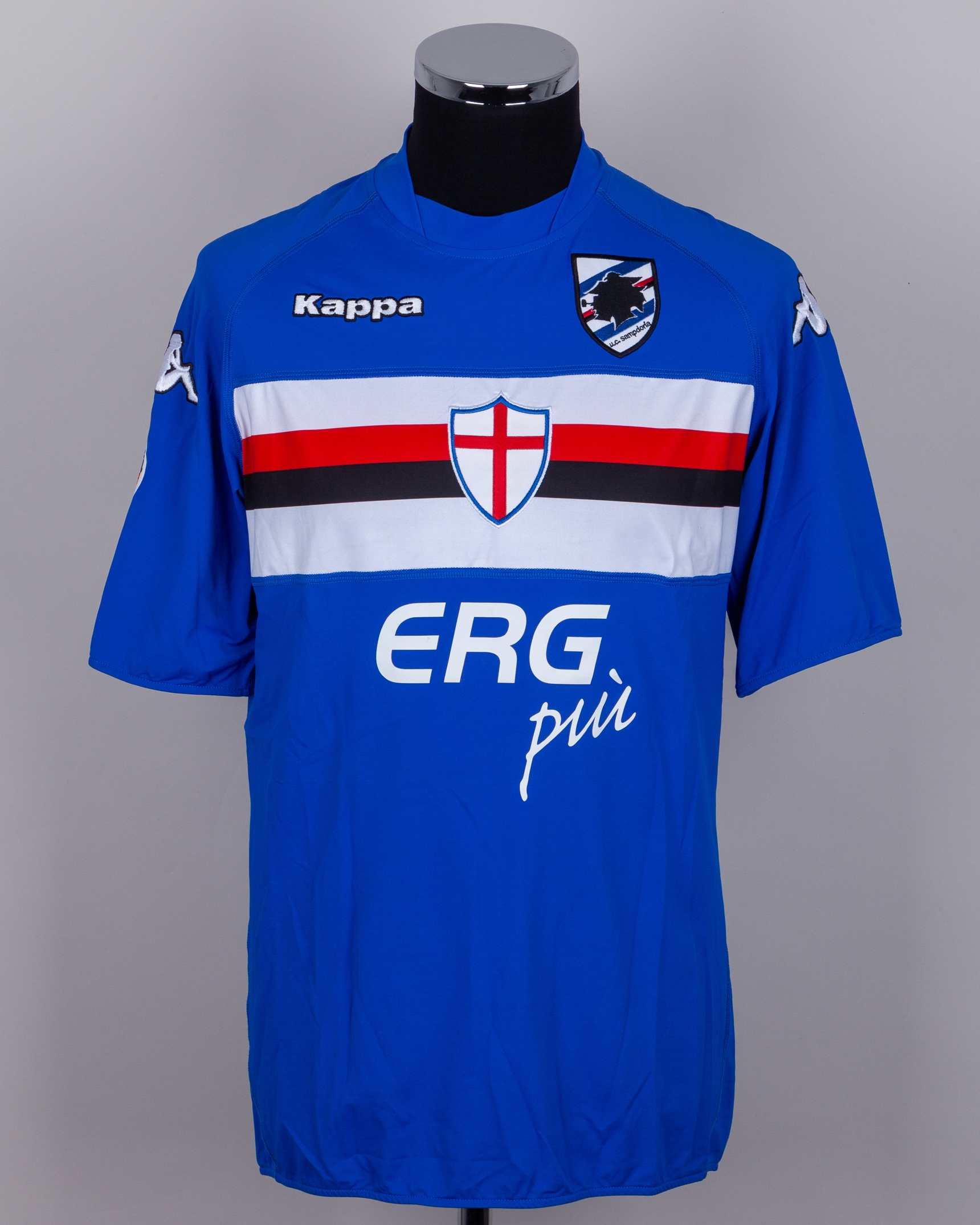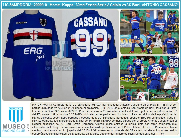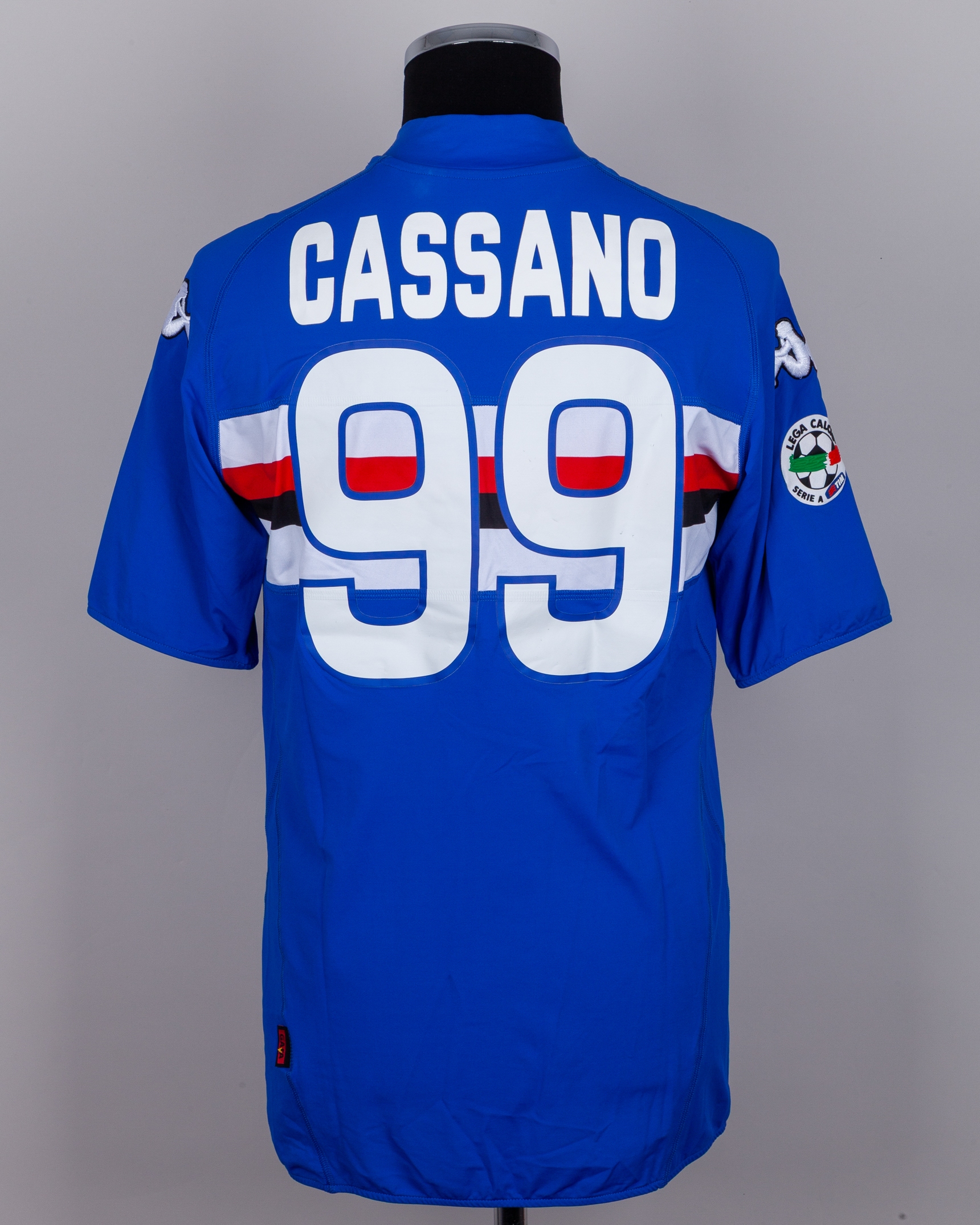 Antonio Cassano blue, white and red No.99 Sampdoria v. Bari match worn sshort-sleeved shirt, 2010, Kappa, with crew-neck collar and embroidered cloth badge inscribed U.C. Sampdoria, the reverse lettered CASSANO, the right sleeve with La Liga flash, with digital COA from Racing Club Museum