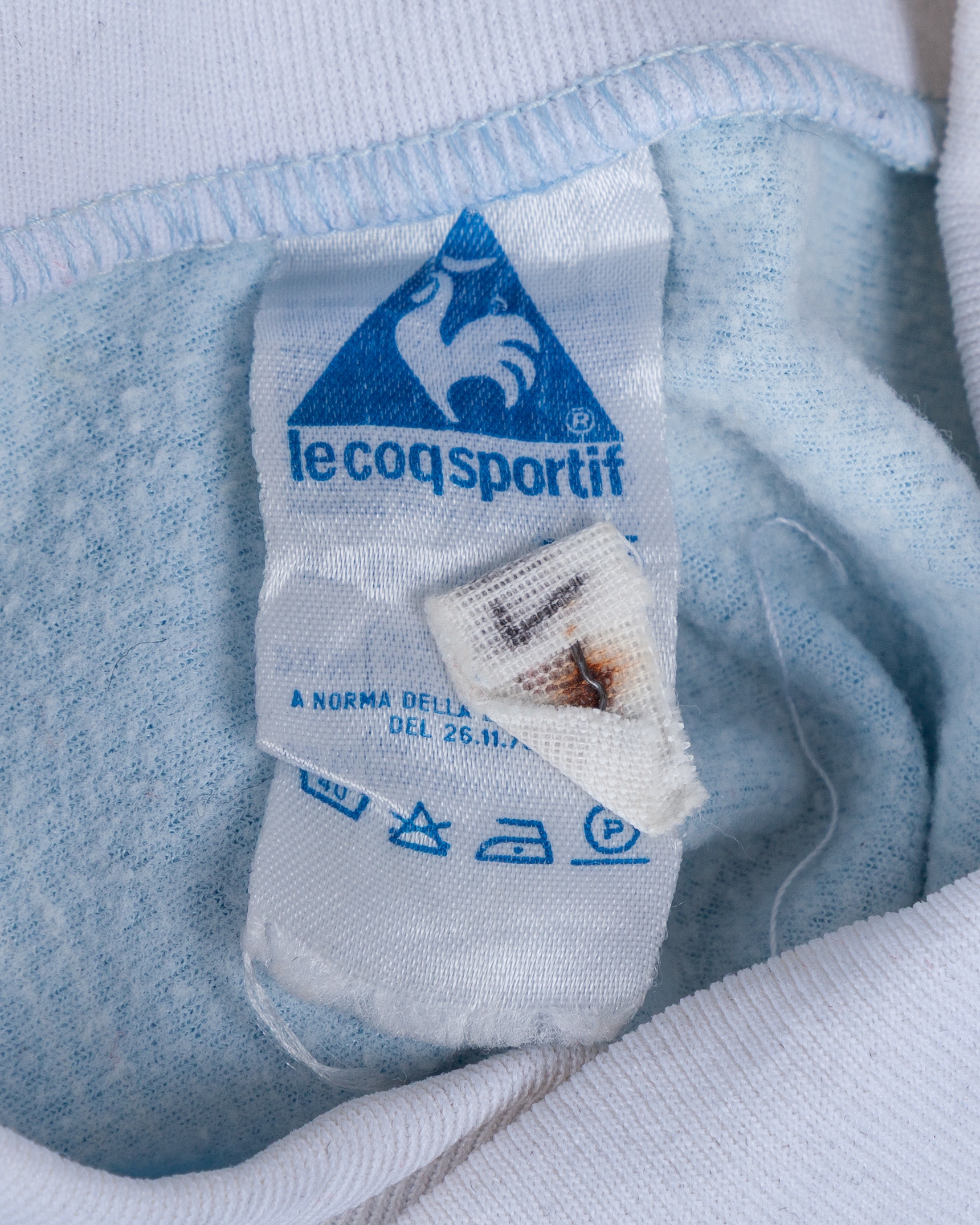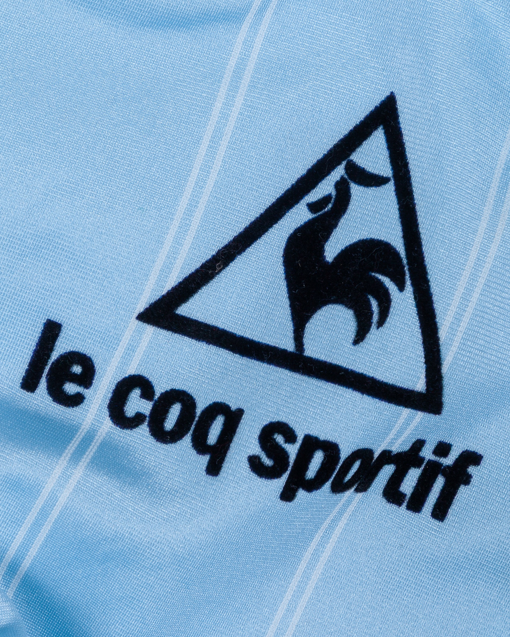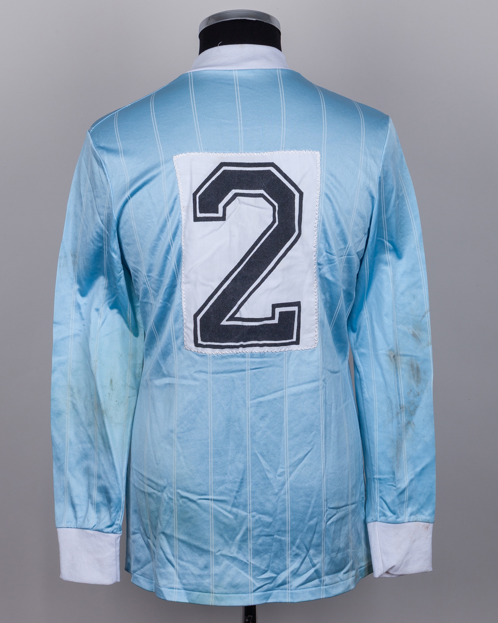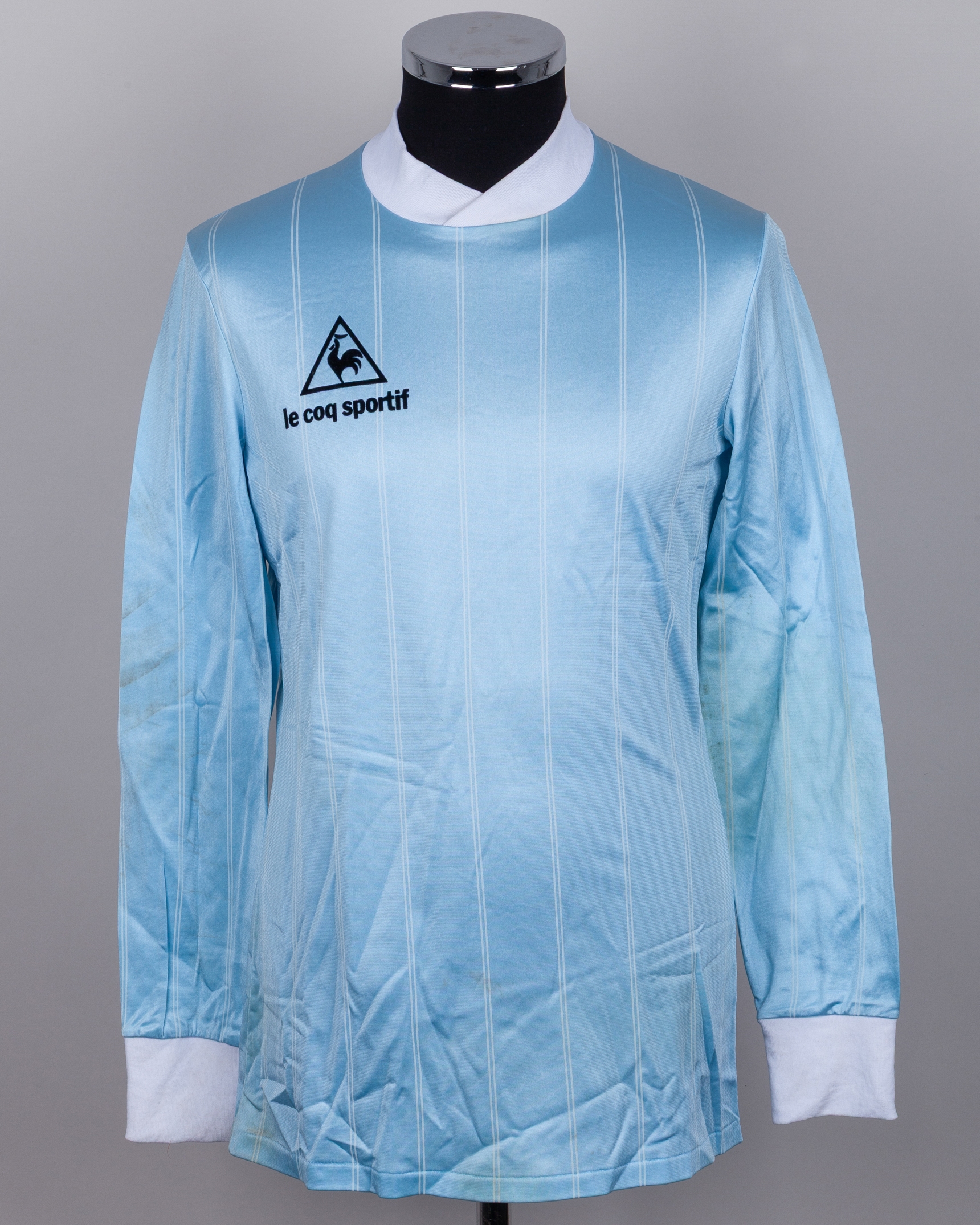 Nelson Gutierrez sky-blue No.2 Uruguay v. England match worn long-sleeved shirt, 1984, Le Coq Sportif, with crew-neck collar, staining, with signed COA from Kenny Sansom