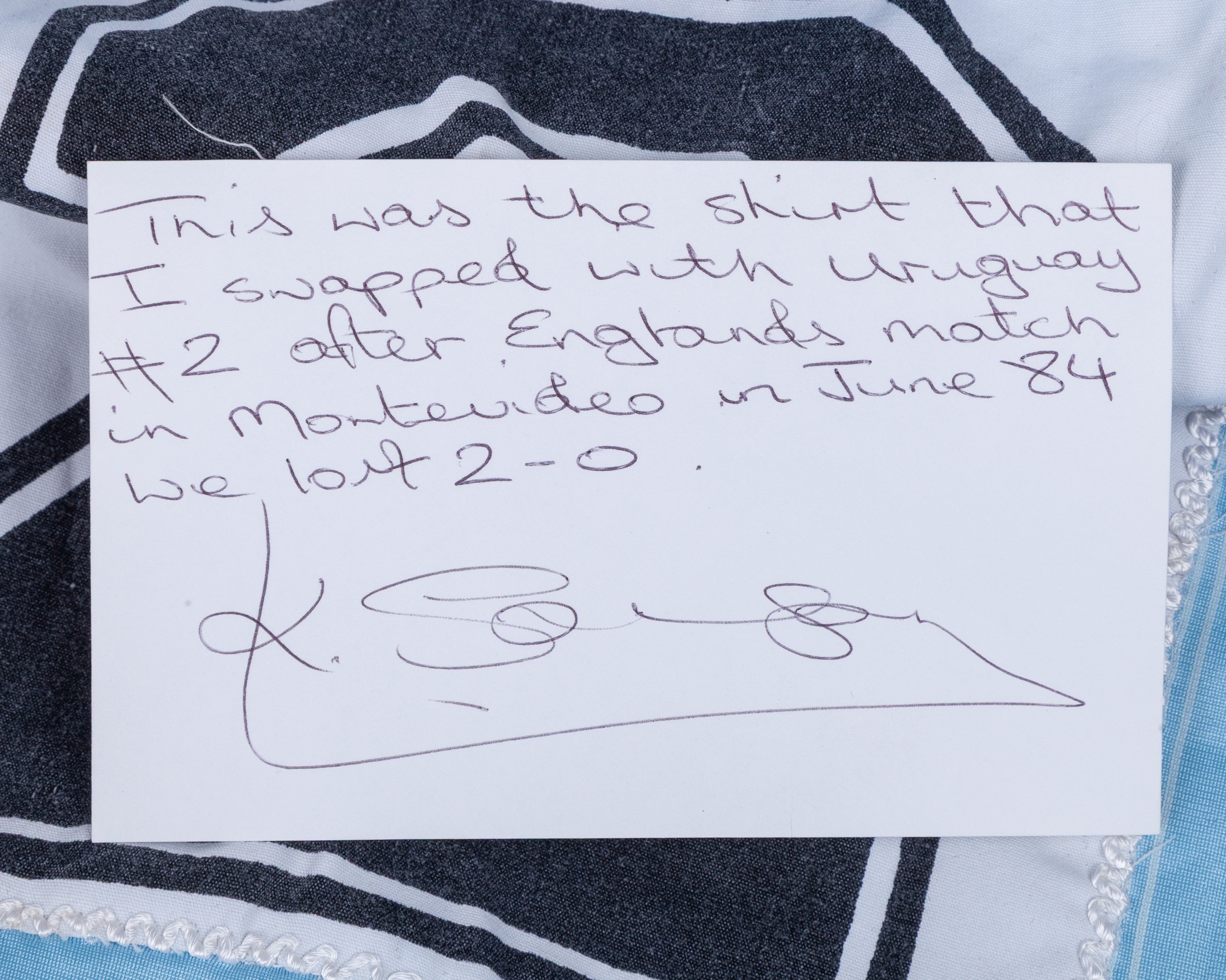 The above shirt was worn by Gutierrez and gained by Kenny Sansom as a swap after the Tour of South America match played on 13th June 1984 in Montevideo, Uruguay defeating England 2-0