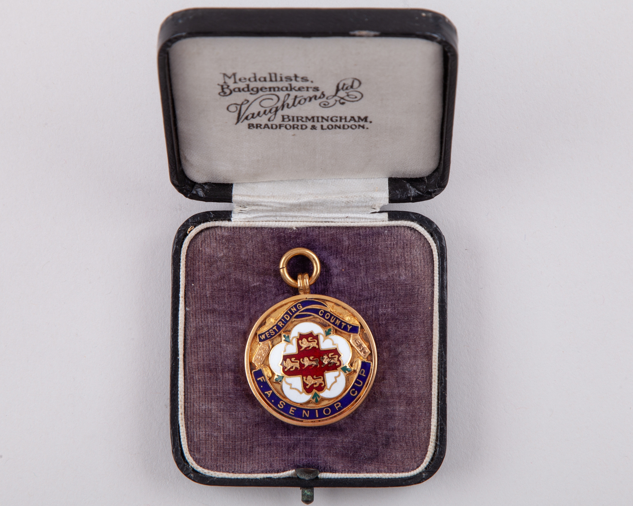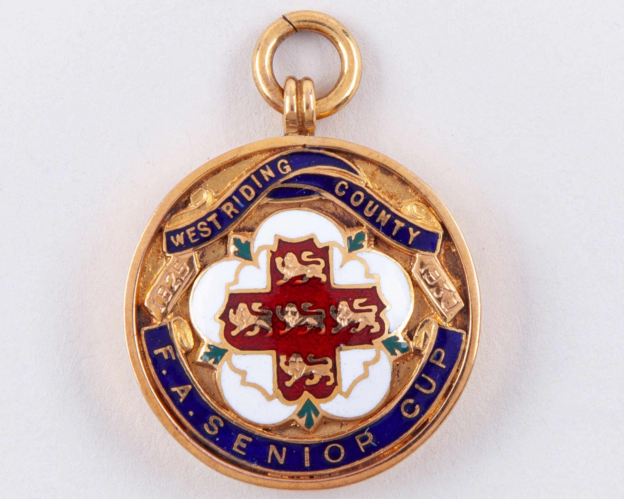 Willis Edwards 9ct gold and enamel West Riding County Senior Cup medal, 1929-30, the obverse inscribed WEST RIDING COUNTY F.A. SENIOR CUP, in original fitted case, 20grms