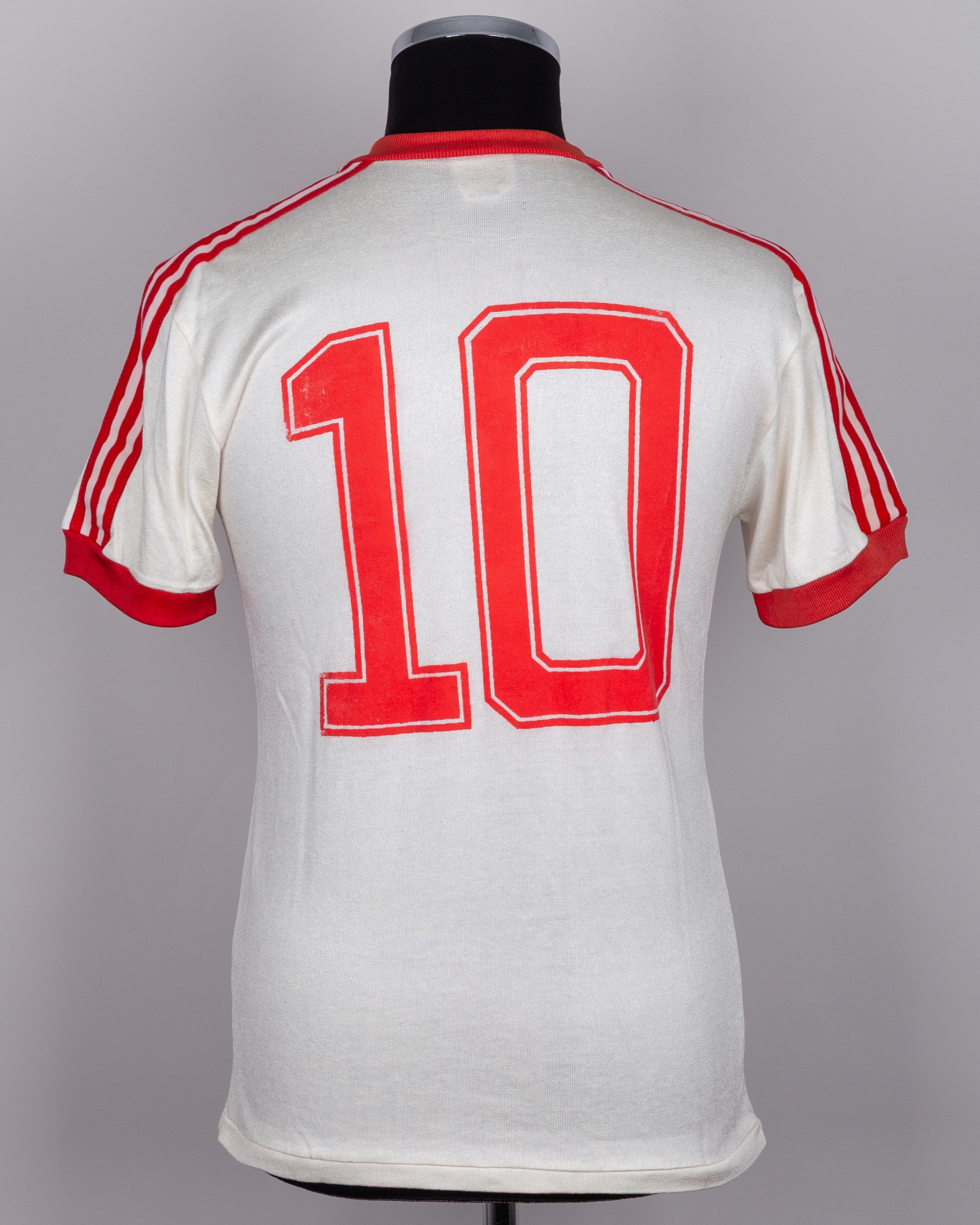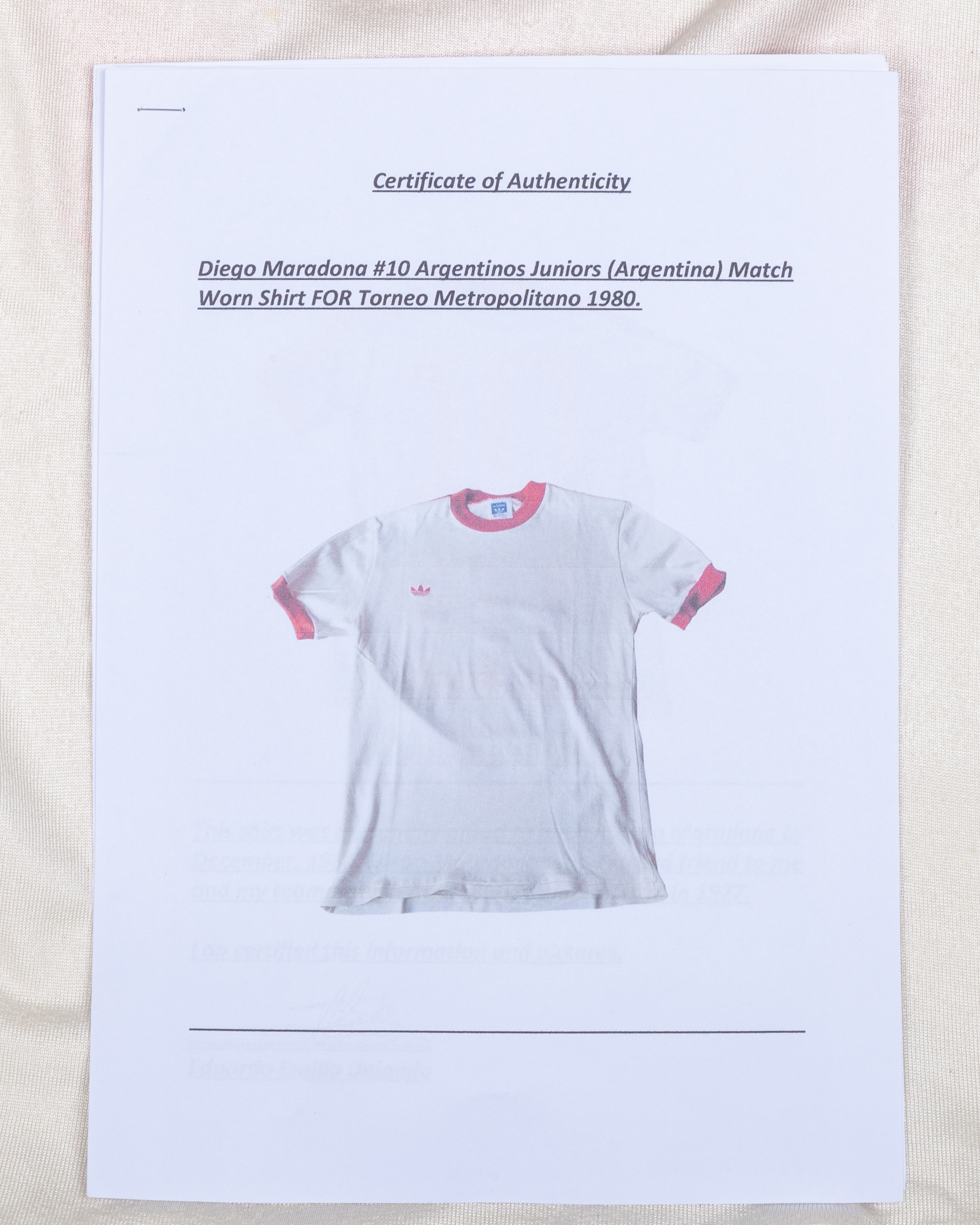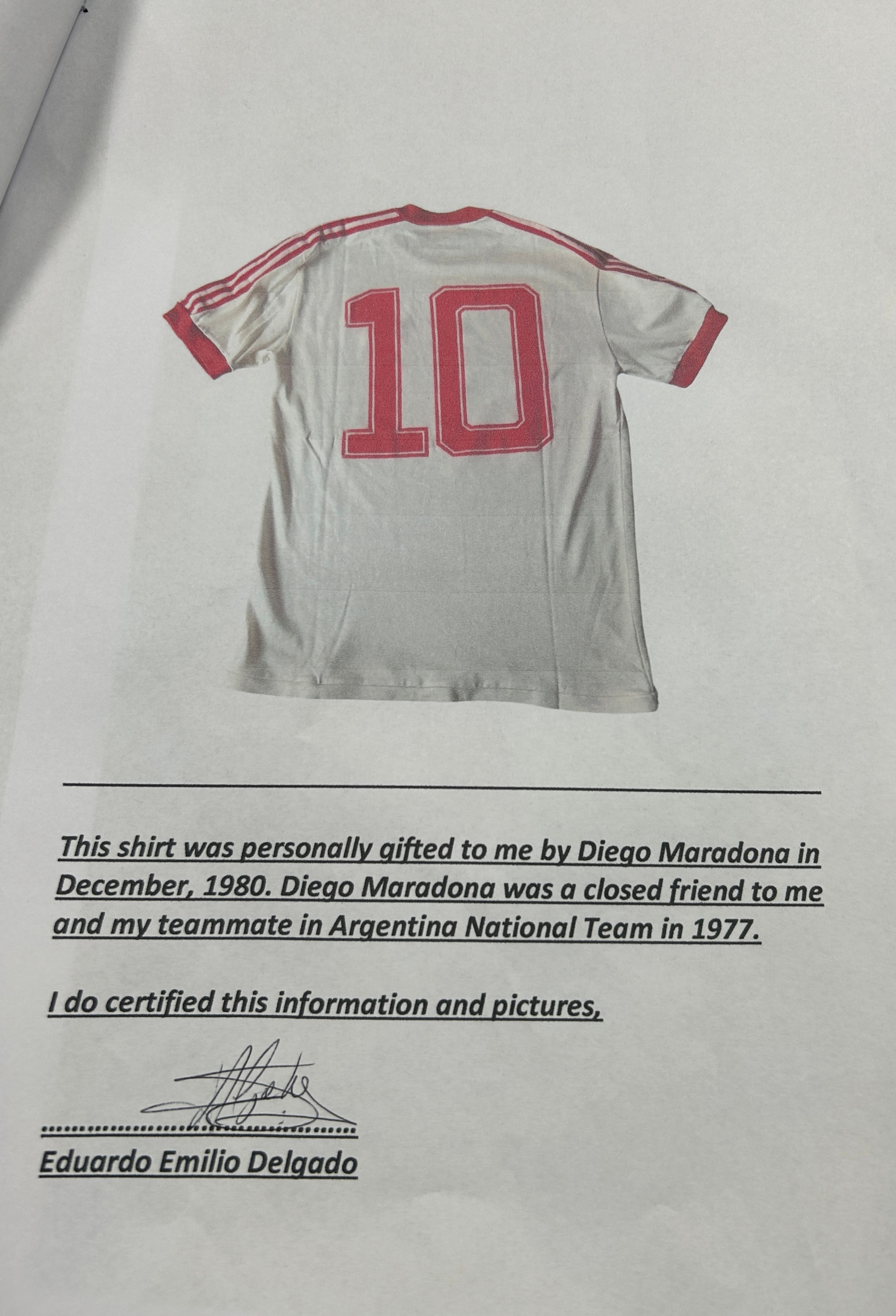 Maradona white and red No.10 Argentinos Juniors match worn short-sleeved shirt, Adidas, Talle, with crew-neck collar, certificate of authenticity from Eduardo Emilio Delgado