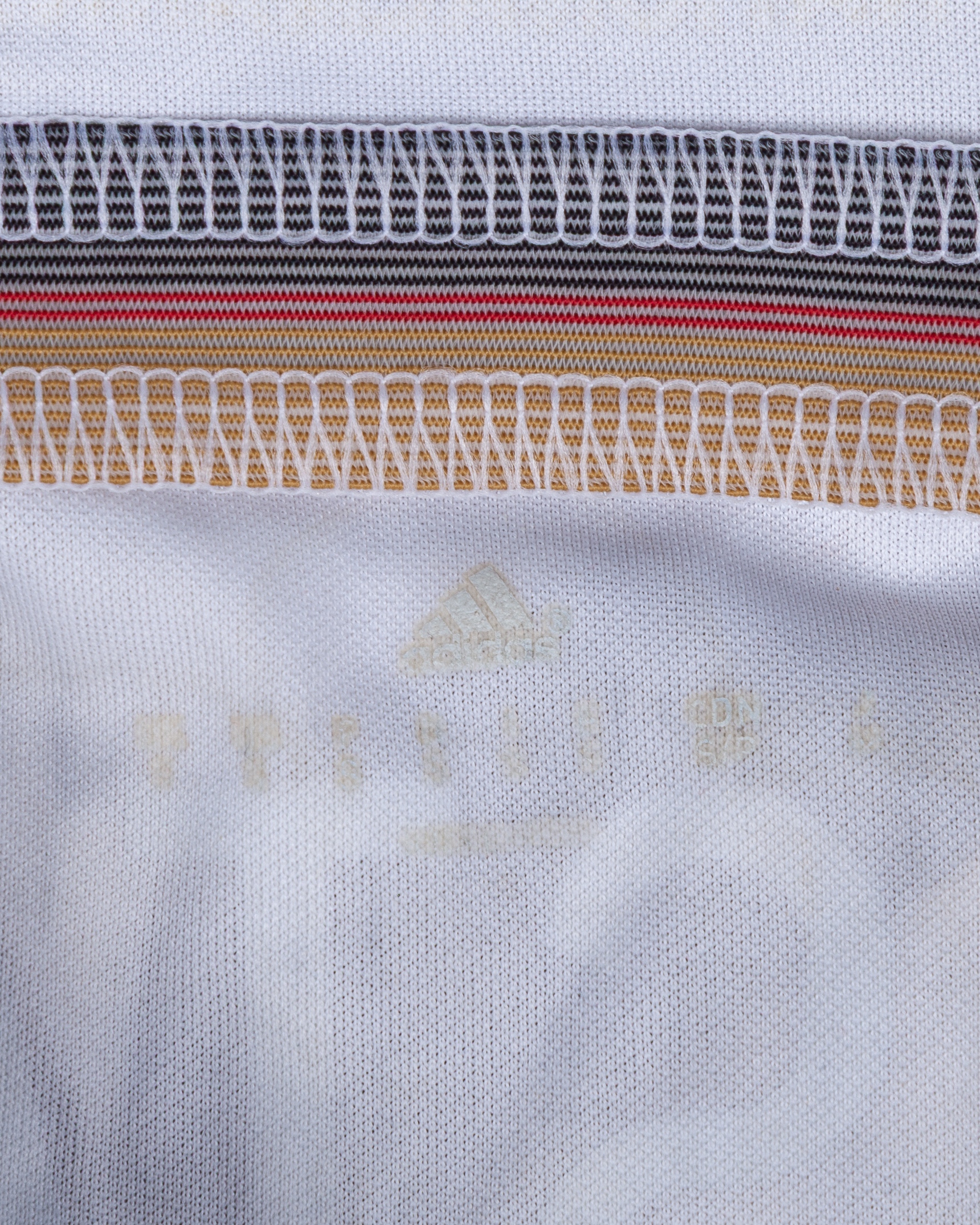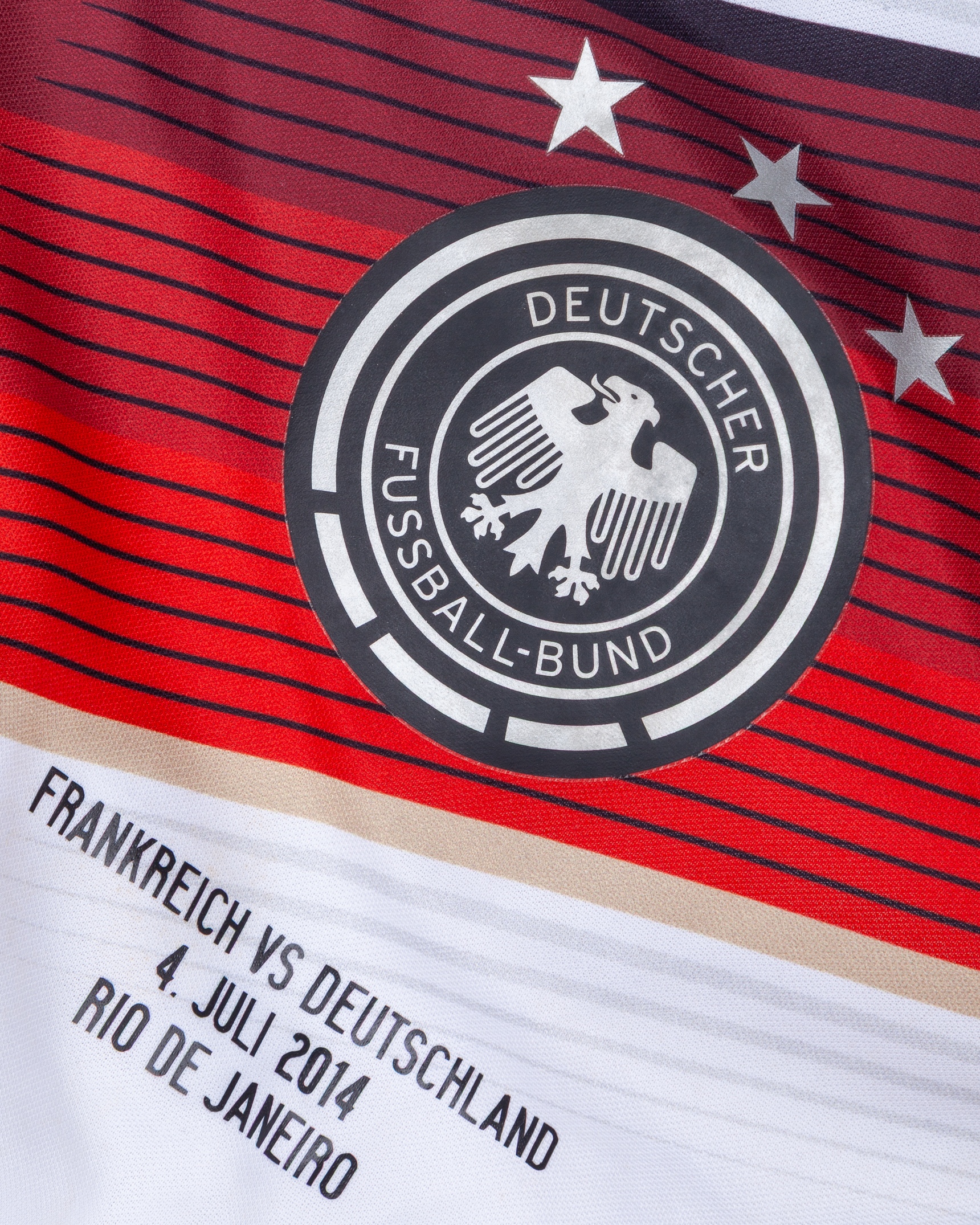 Shkodran Mustafi white No.21 Germany v. France short-sleeved shirt, 2014, Adidas, S, with v-neck collar and printed badge, with FRANKREICH VS DEUTSCHLAND 4. JULI 2014 RIO DE JANEIRO decal, the reverse lettered MUSTAFI, the right sleeve with FIFA World Cup Brazil flash and the left sleeve with football for hope flash