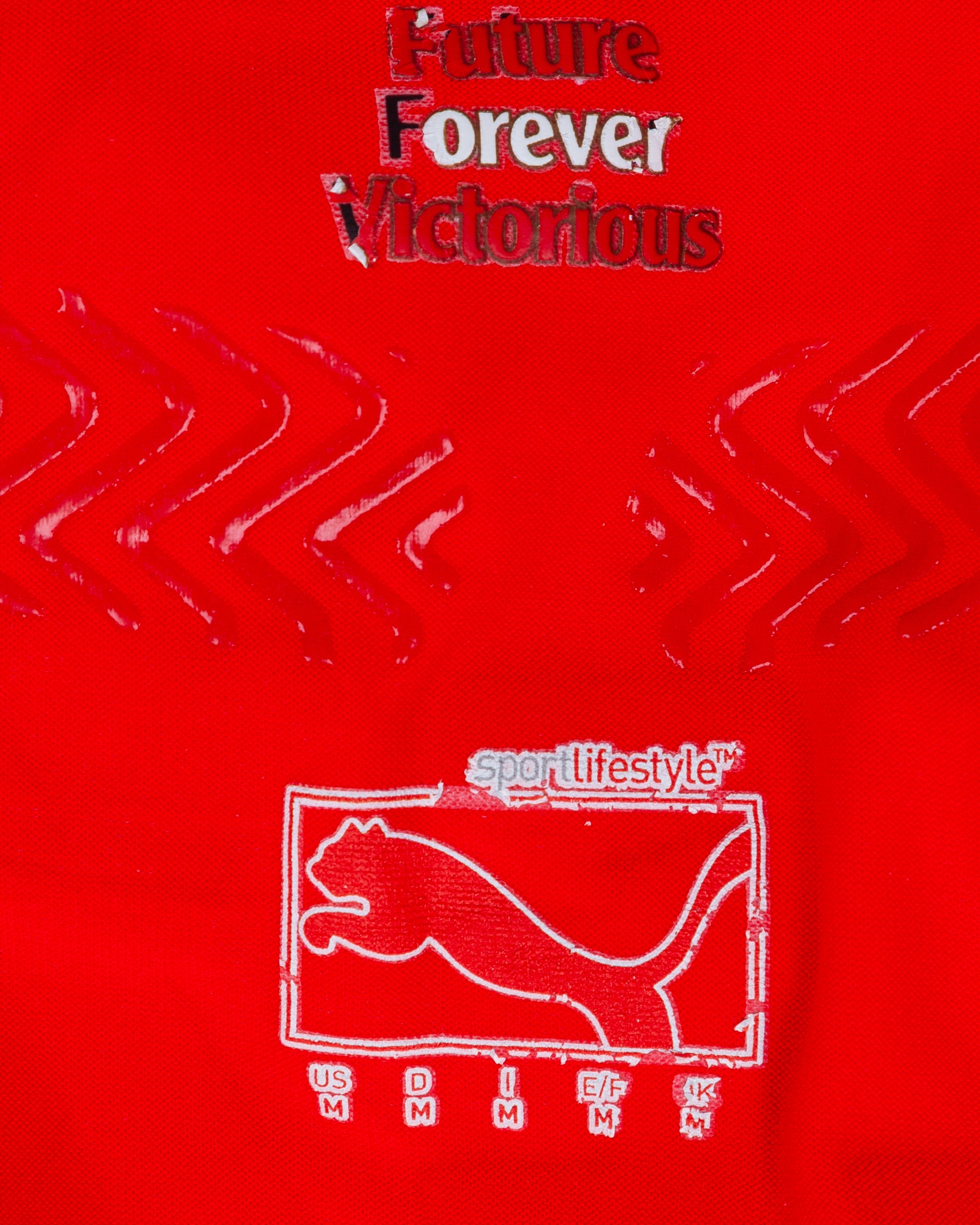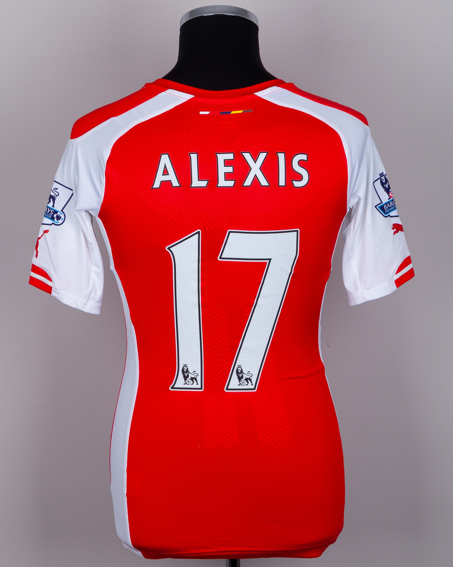 Alexis Sanchez red and white No.17 Arsenal short-sleeved shirt, 2014-15, Puma, M, with crew-neck collar and printed badge, the reverse lettered ALEXIS, the sleeves with Barclays Premier League flashes, with print worn