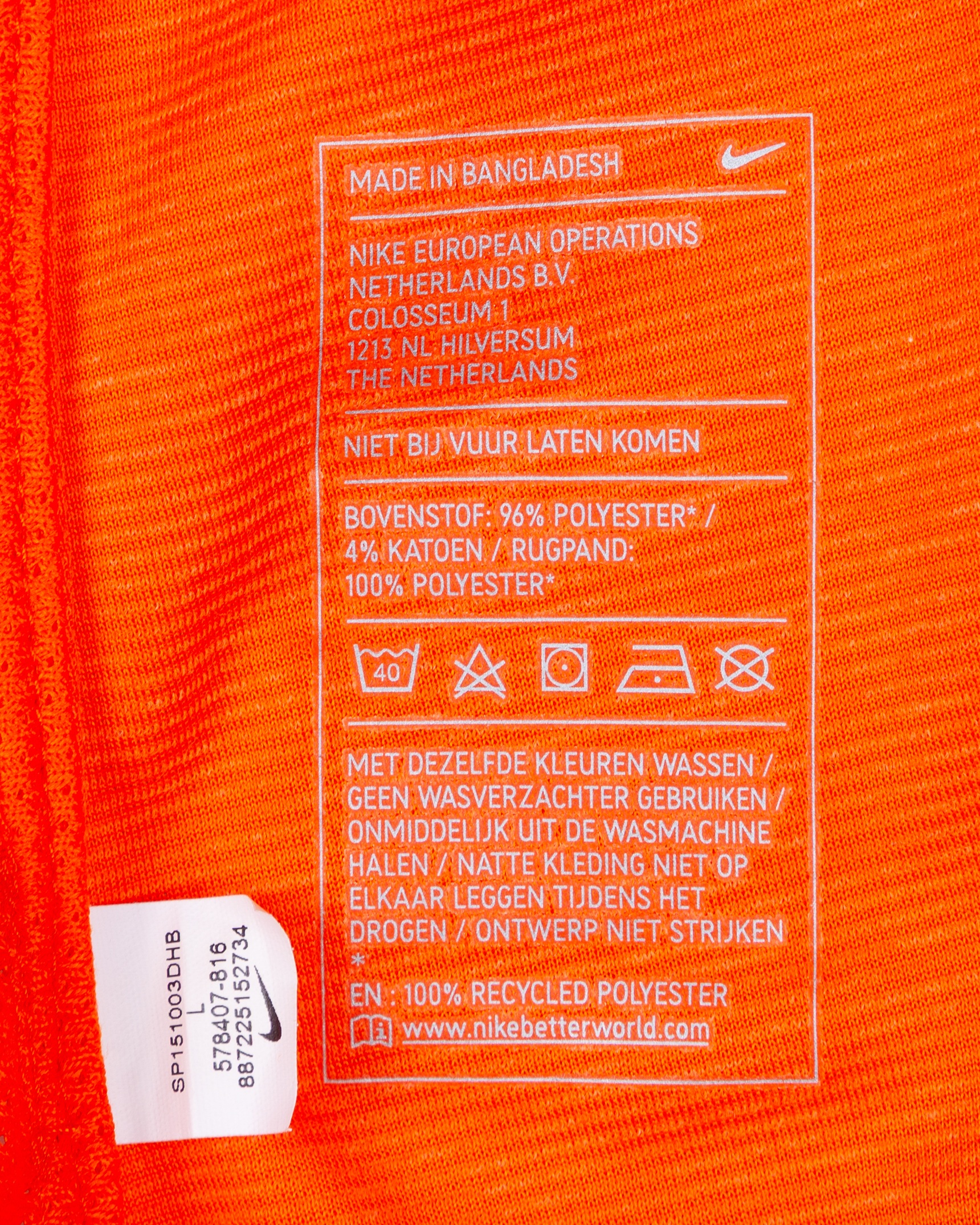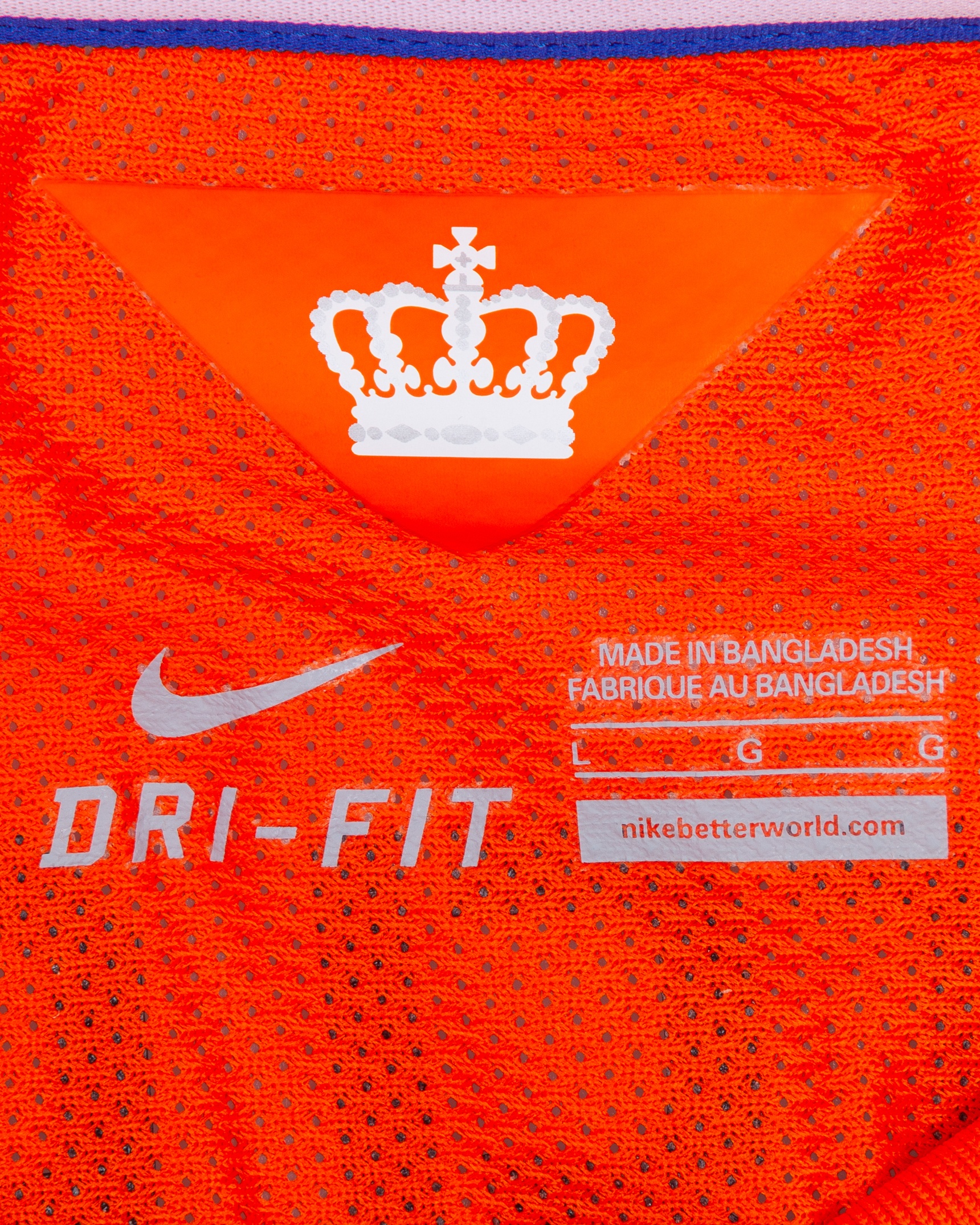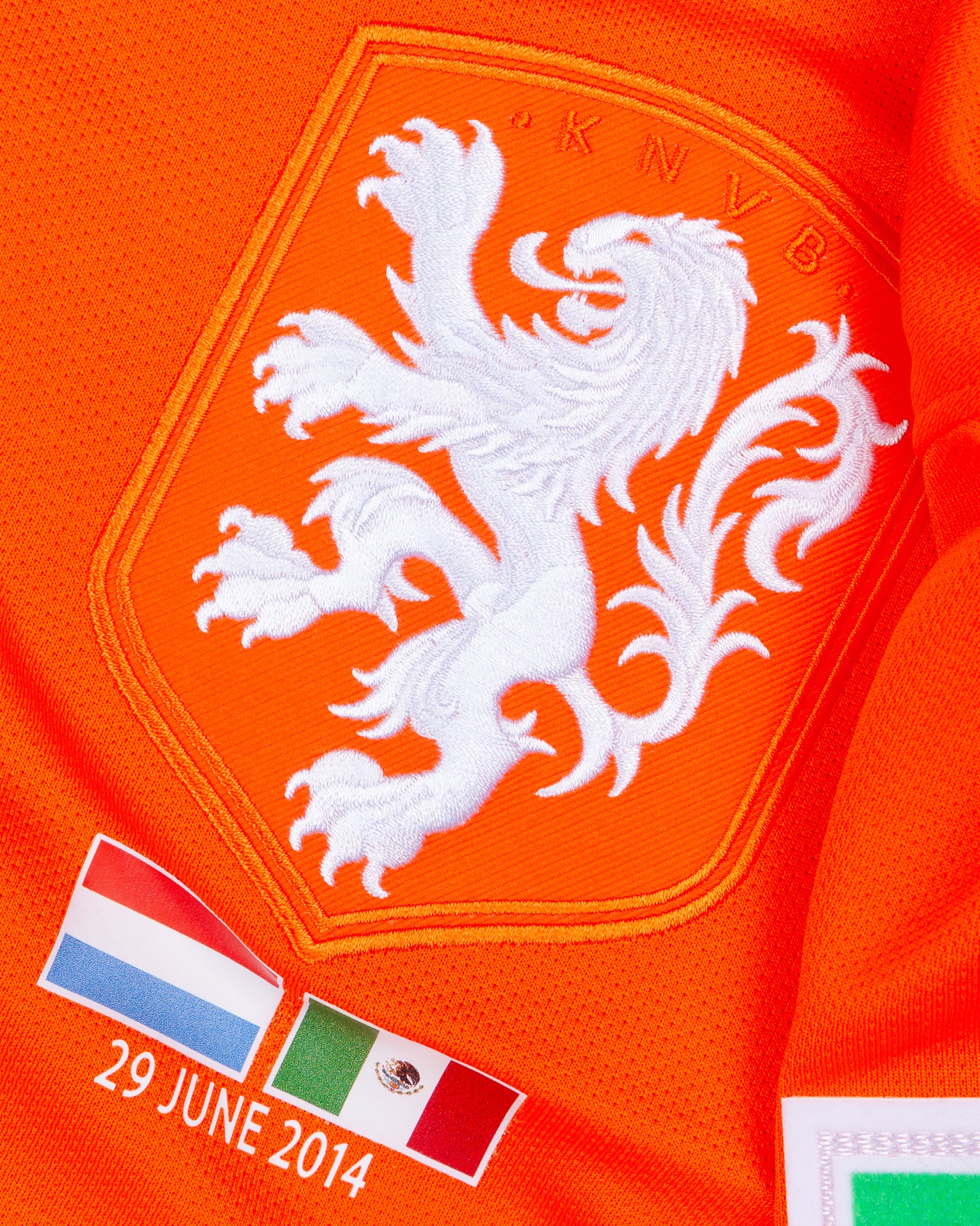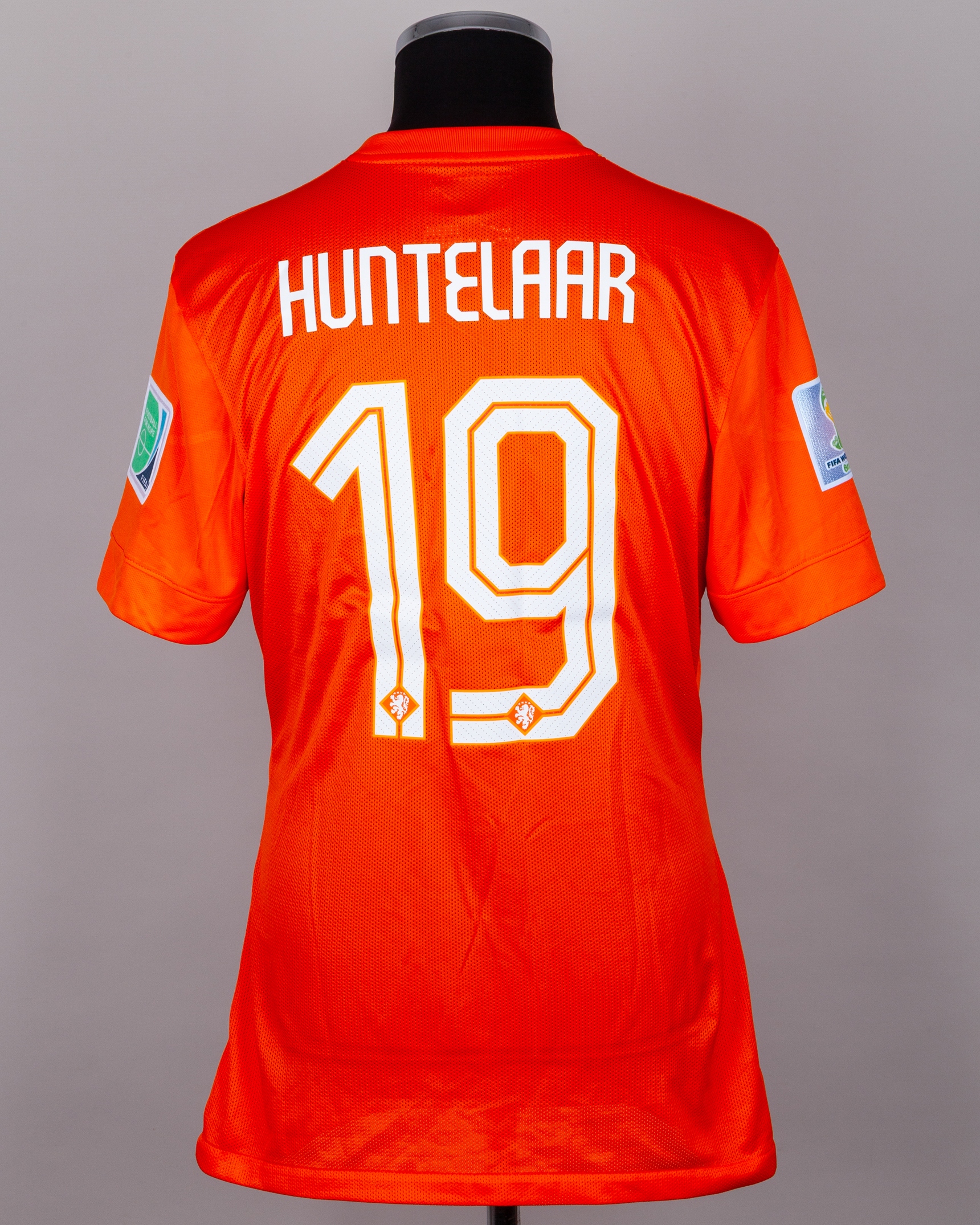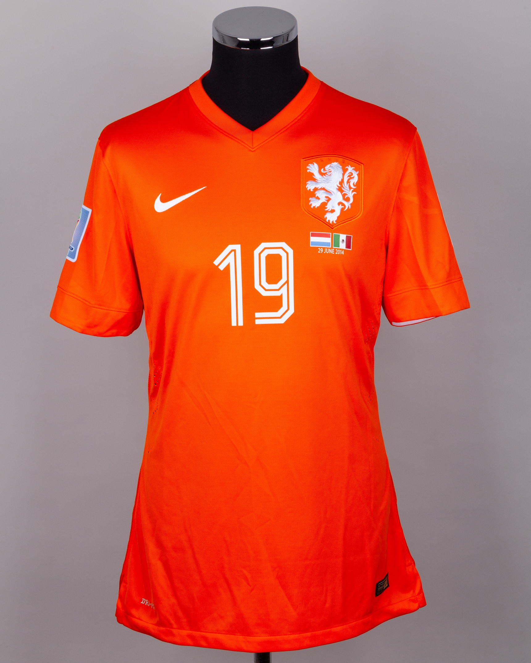 Klaas-Jan Huntelaar orange No.19 Netherlands v. Mexico short-sleeved shirt, 2014, Nike, L, with v-neck collar and embroidered cloth badge inscribed K N V B, with 29 JUNE 2014 decal, the reverse lettered HUNTELAAR, the right sleeve with FIFA World Cup Brazil flash and the left sleeve with football for hope flash