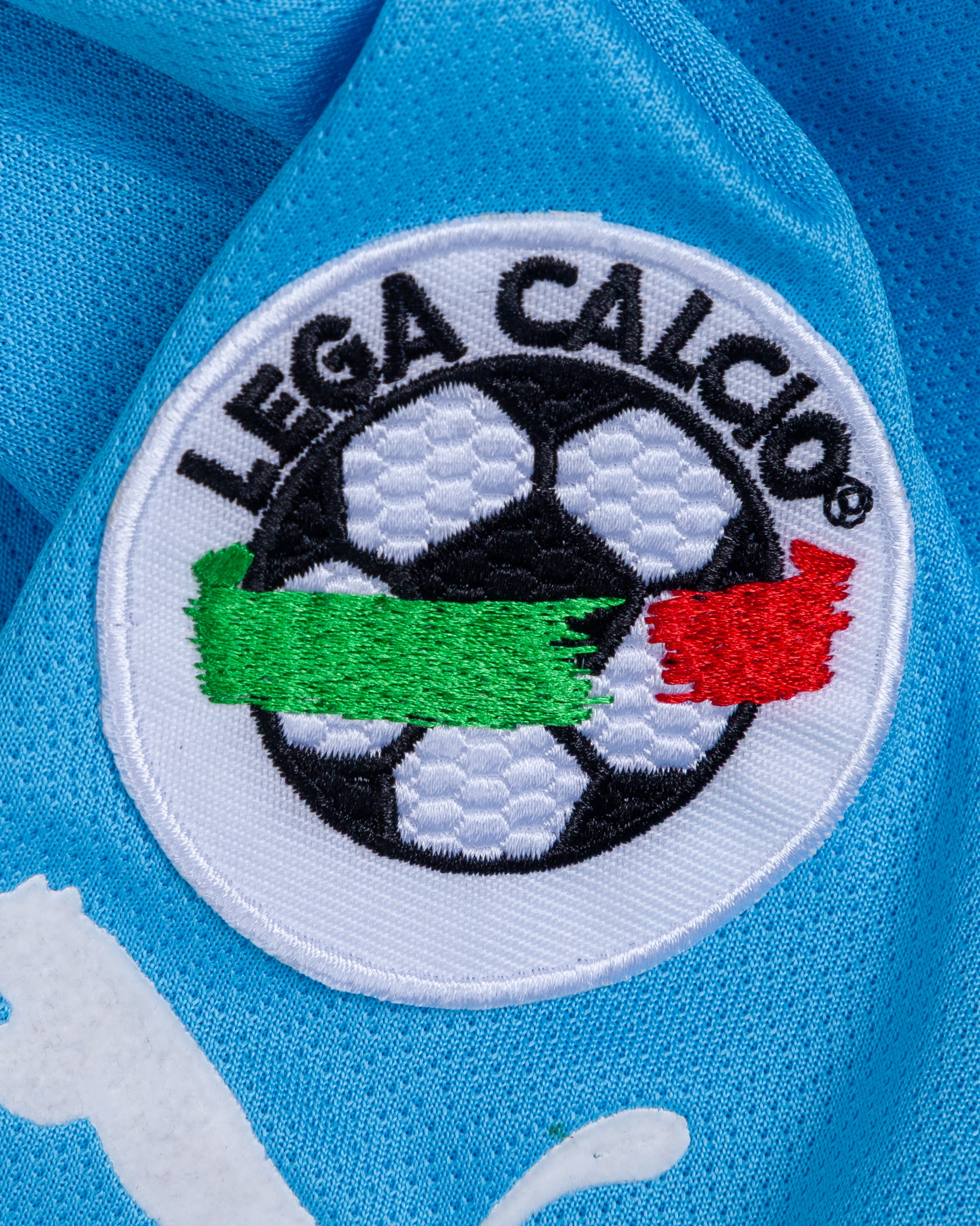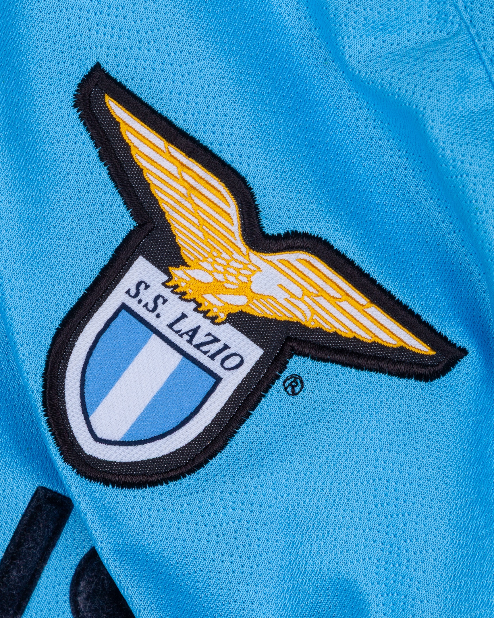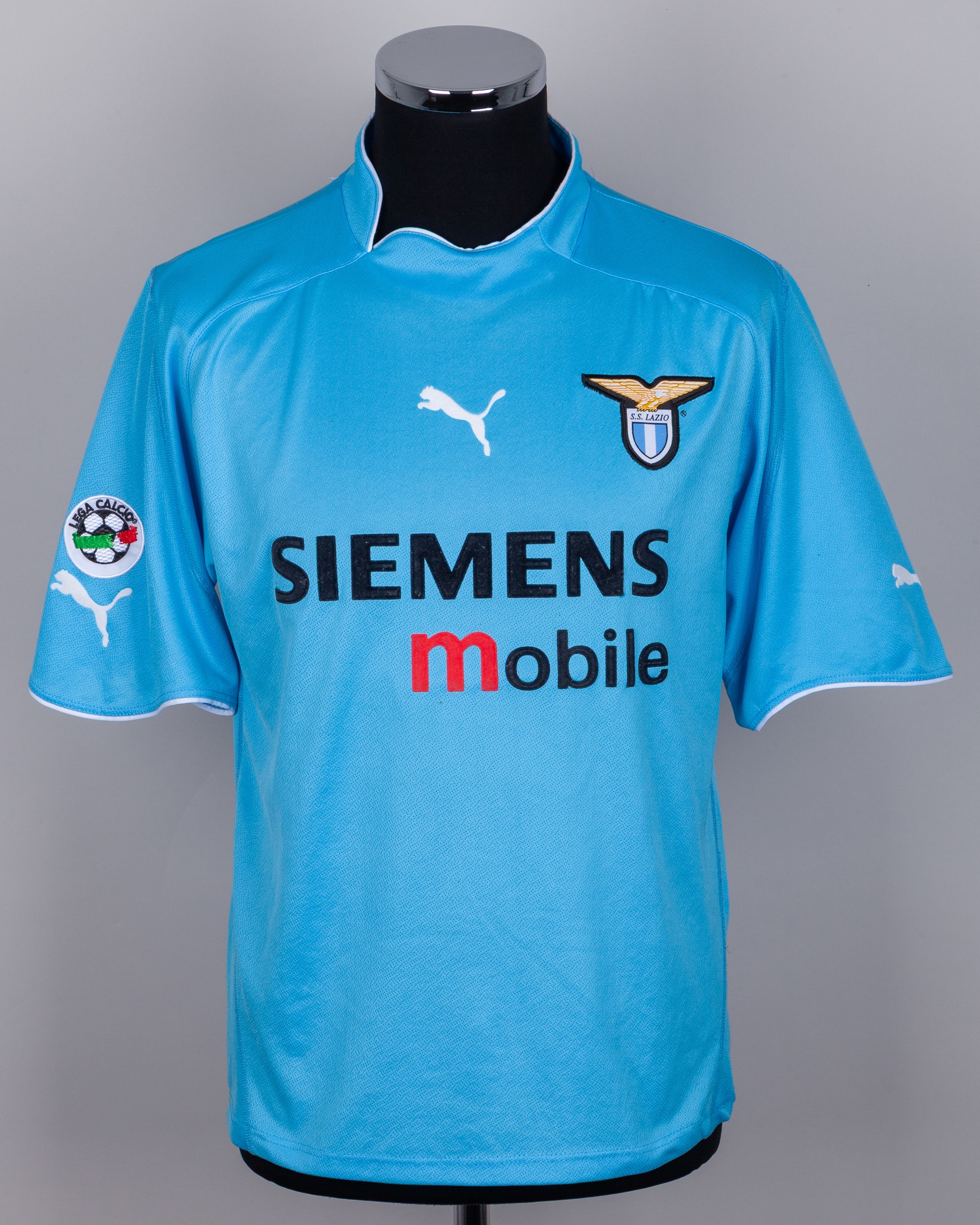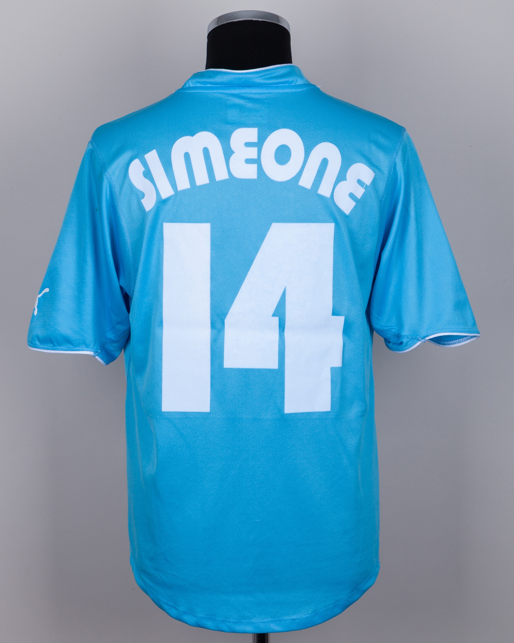 Diego Simeone blue No.14 Lazio short-sleeved shirt, 2002-03, Puma, XL, with v-neck style collar and embroidered cloth badge inscribed S.S. LAZIO, the reverse lettered SIMEONE, the right sleeve with Lega Calcio flash
