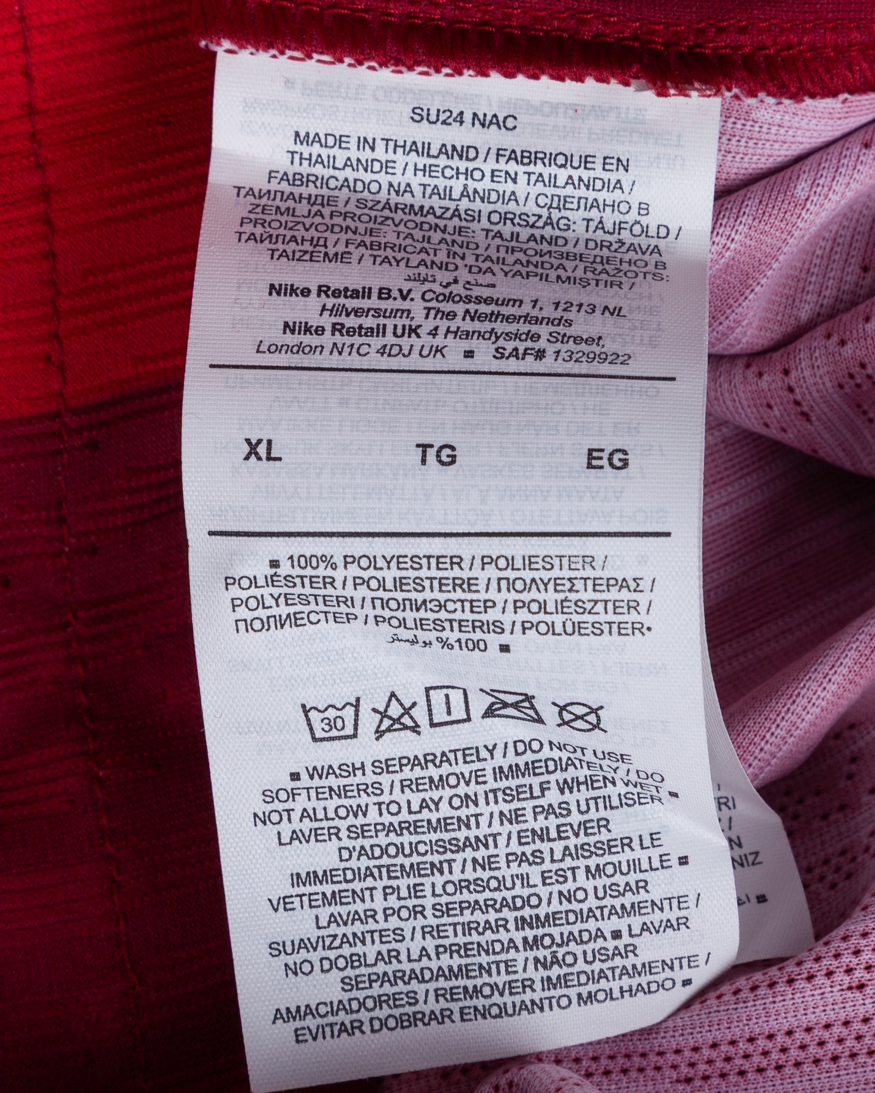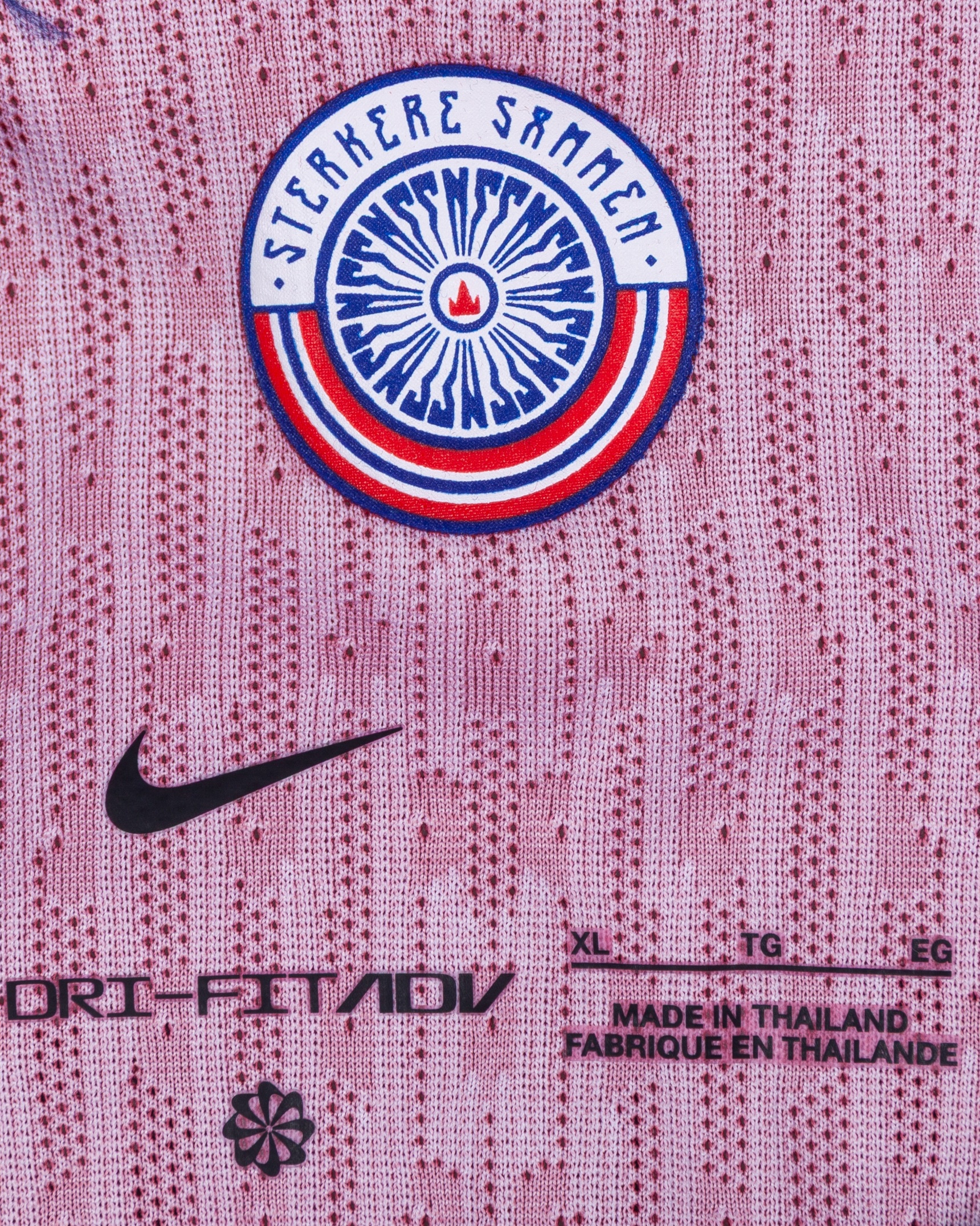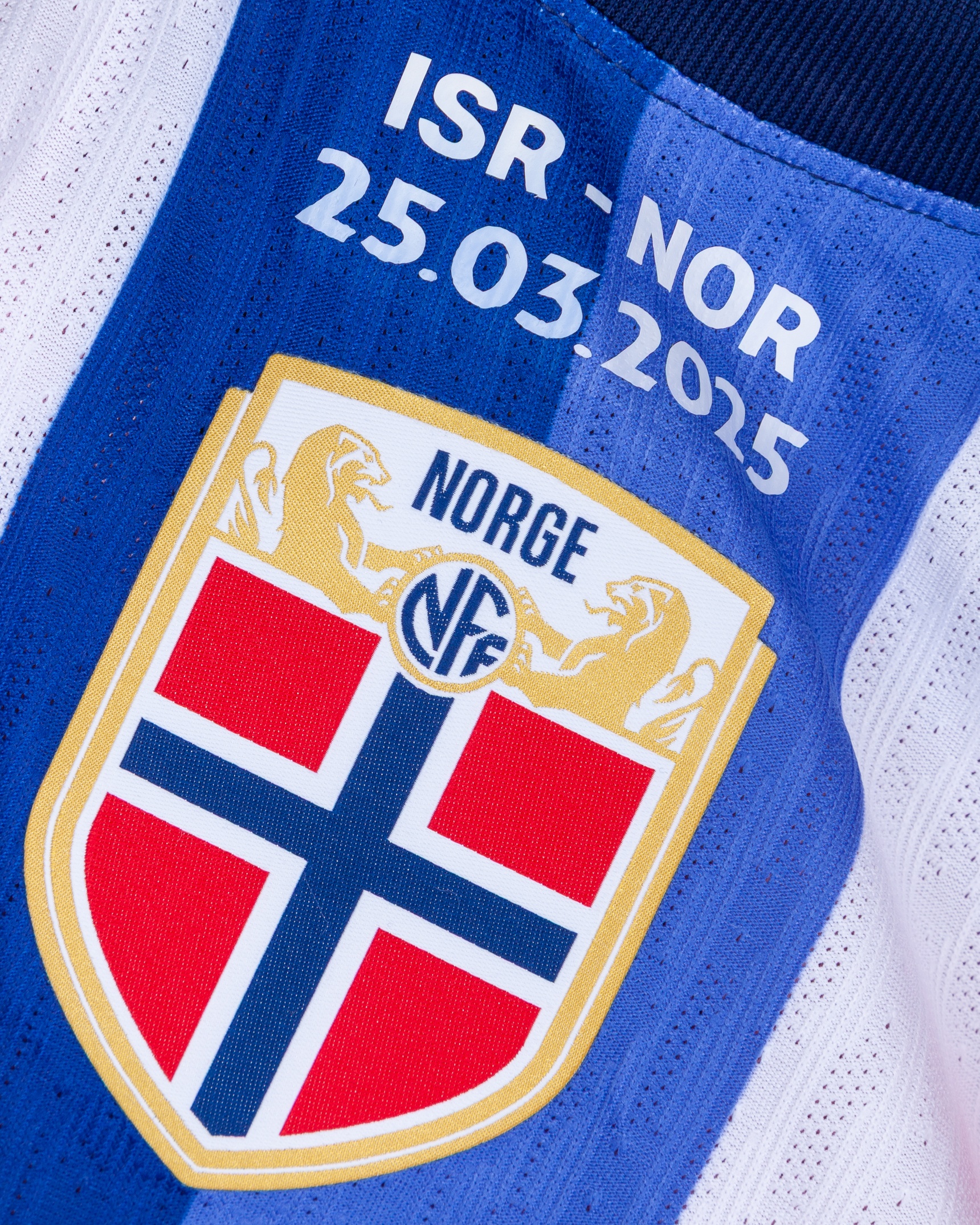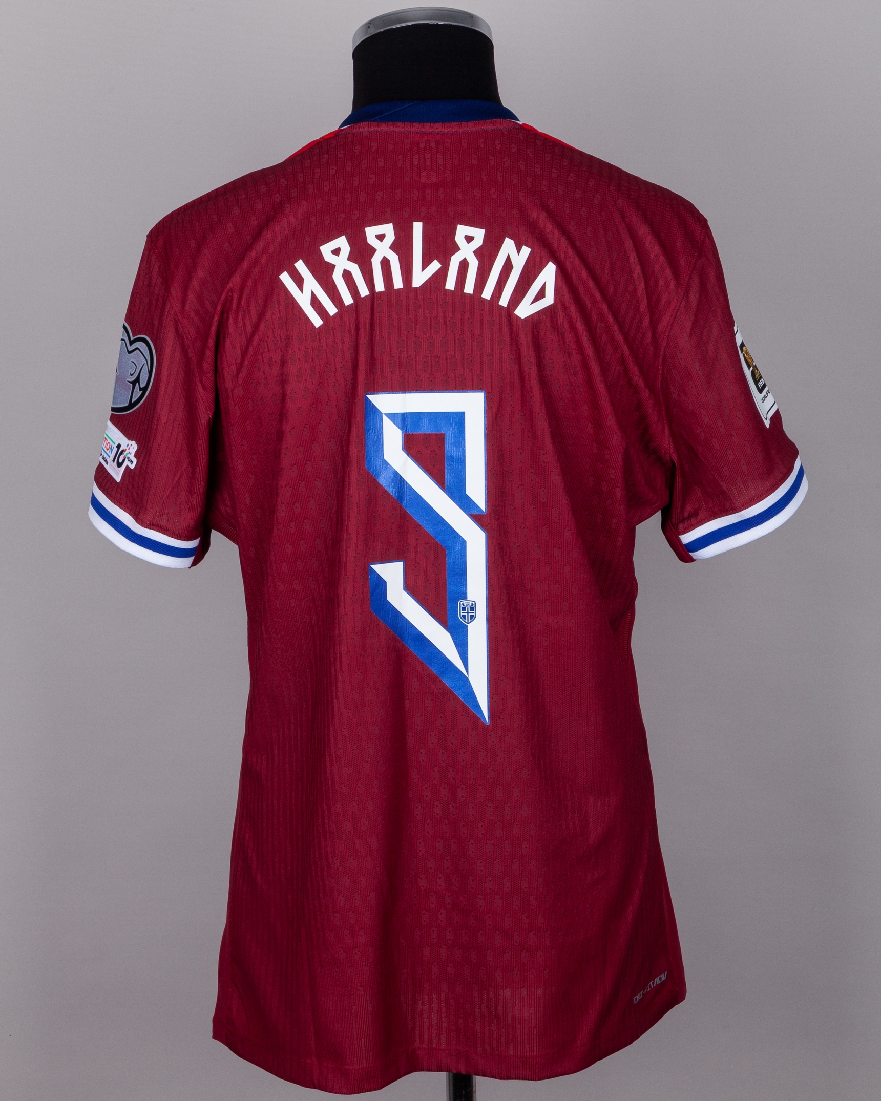 Erling Haaland red, blue and white No.9 Norway v. Israel short-sleeved shirt, 2025, Nike, XL, with crew-neck collar and printed badge, with ISR - NOR 25.03.2025 decal, the reverse lettered HAALAND, the right sleeve with FIFA qualifiers flash and the left sleeve with play with heart and UEFA foundation flash
