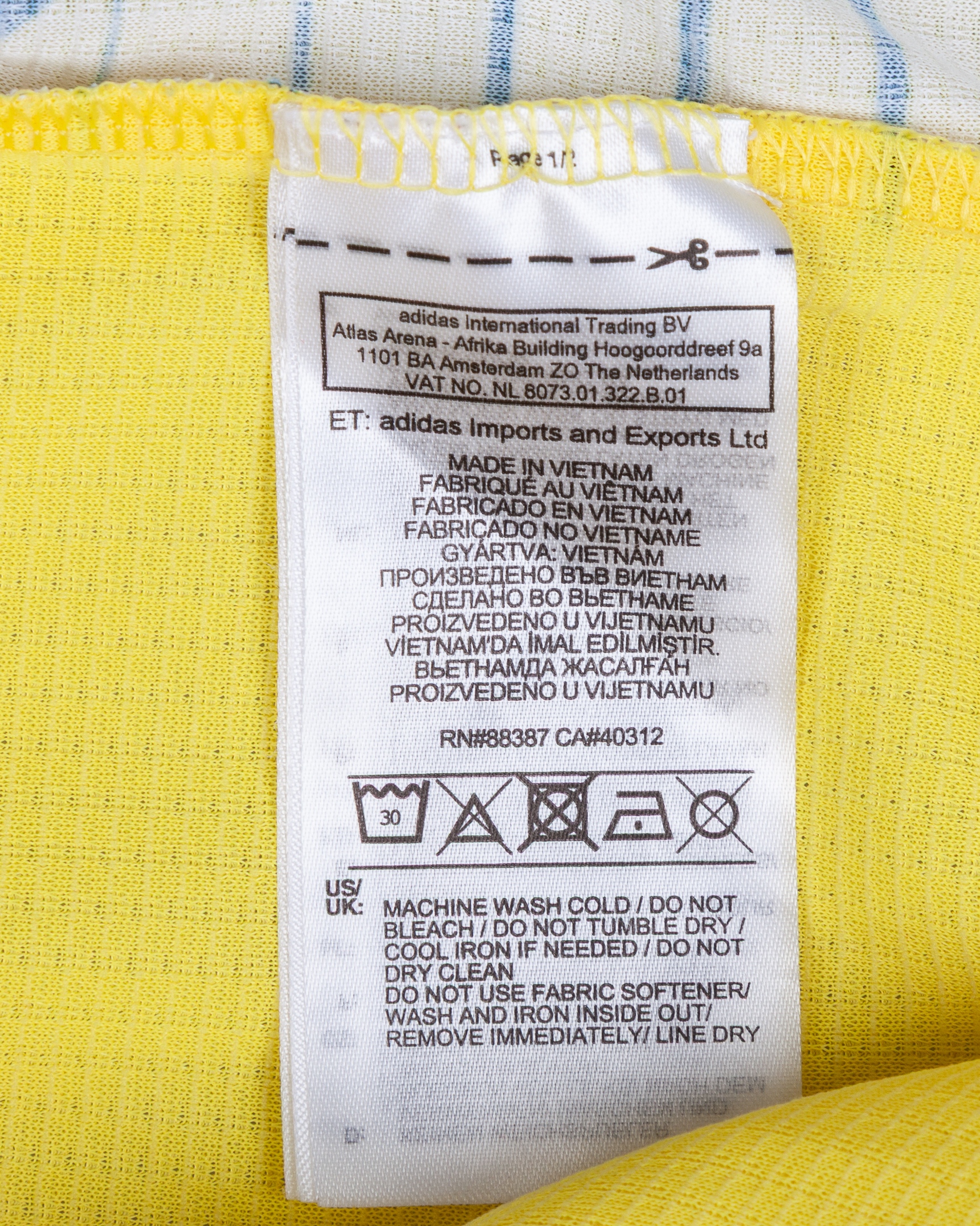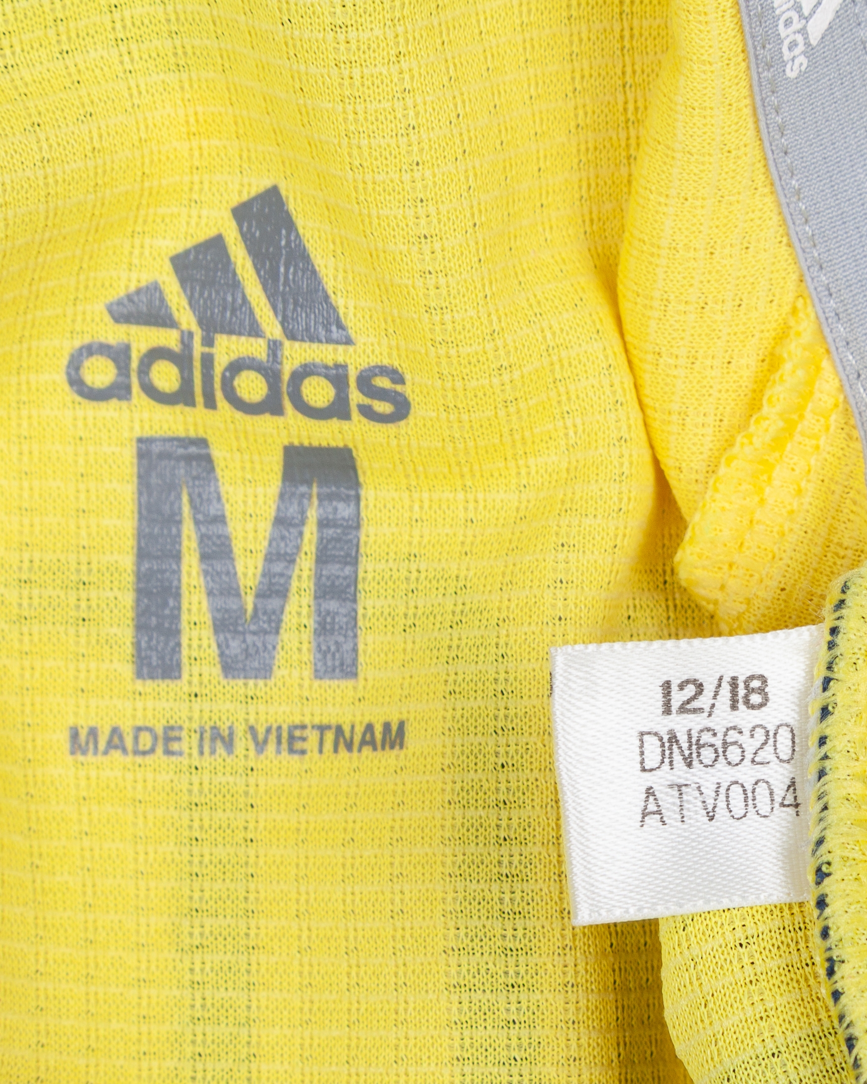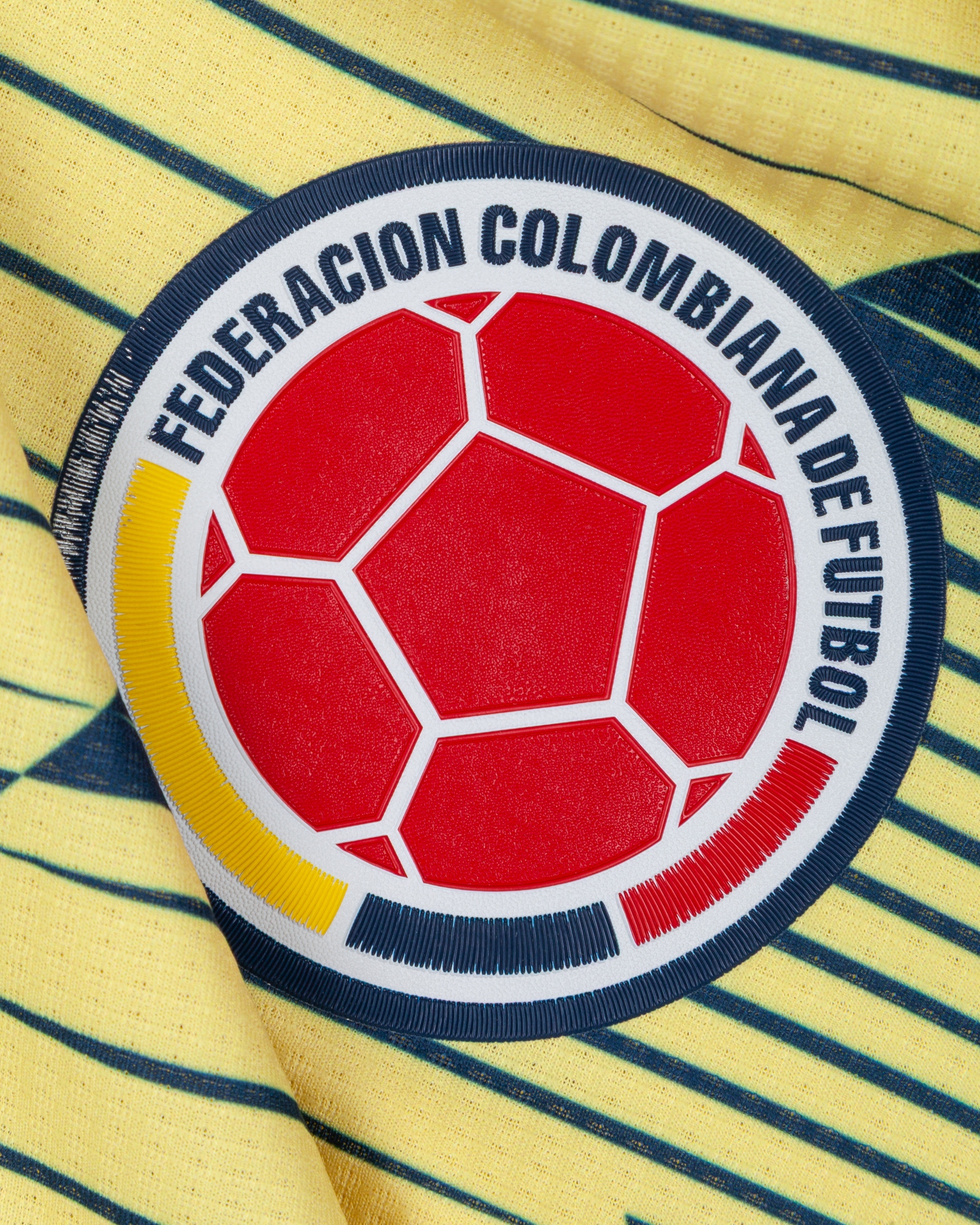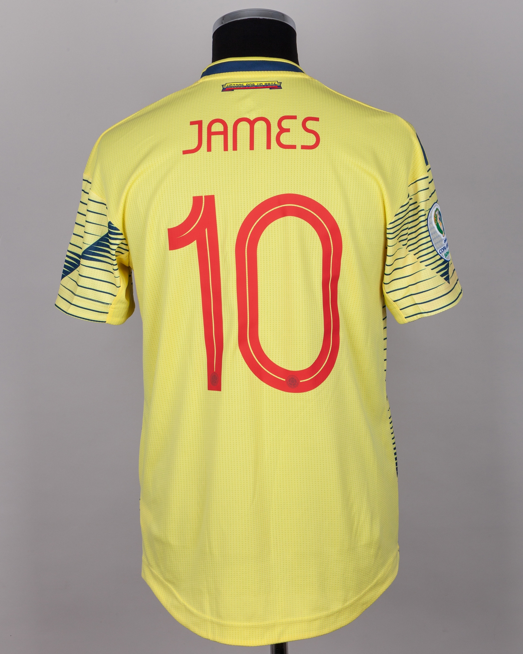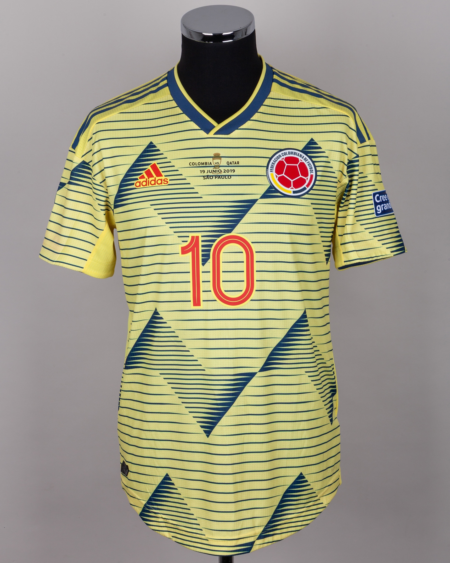 James Rodrigues yellow and blue No.10 Colombia v. Qatar short-sleeved shirt, 2019, Adidas, M, with v-neck collar and printed badge, with COLOMNIA VS QATAR 19 JUNIO 2019 SAO PAULO decal, the reverse lettered JAMES, the right sleeve with Conmebol Copa America Brasil 2019 flash