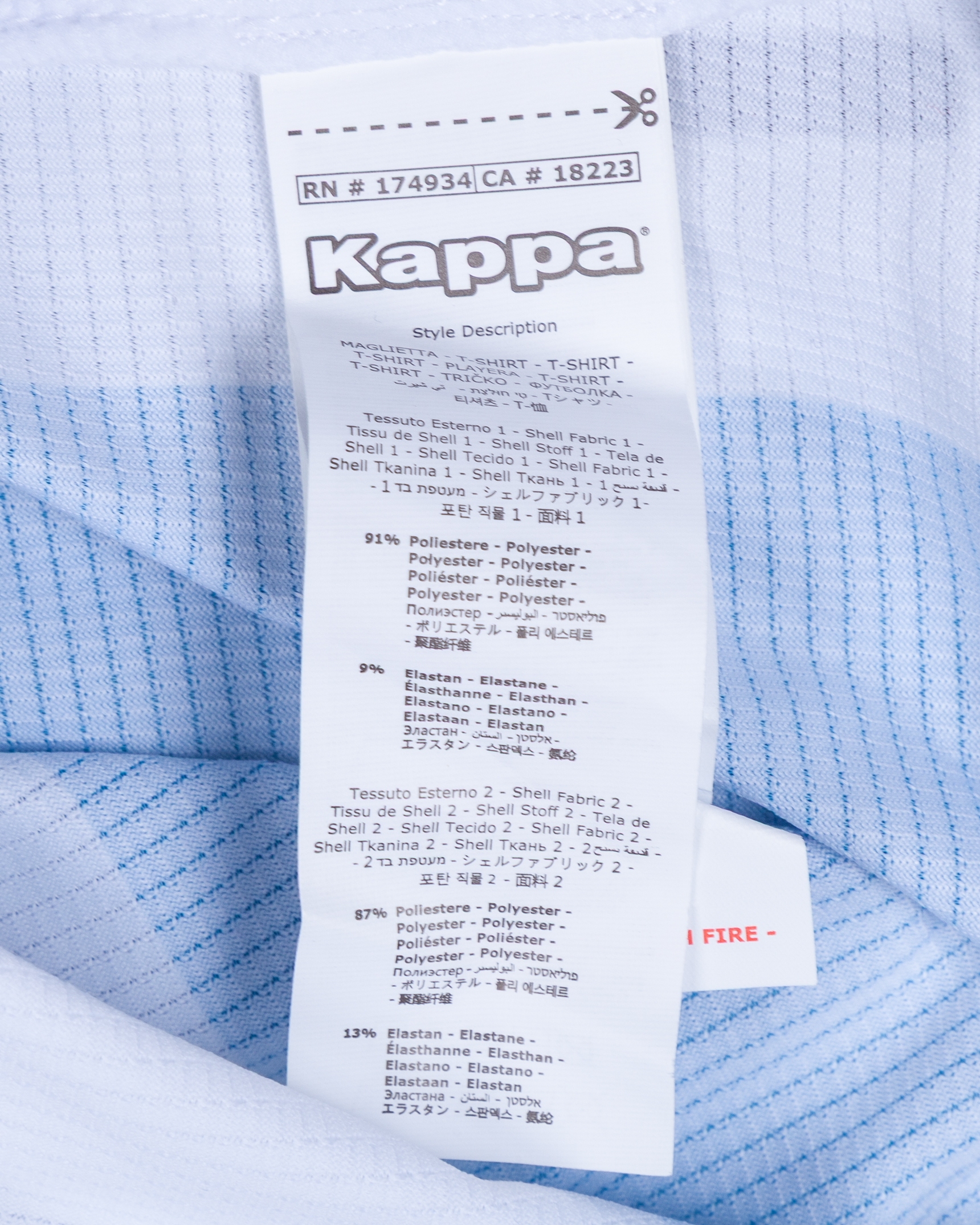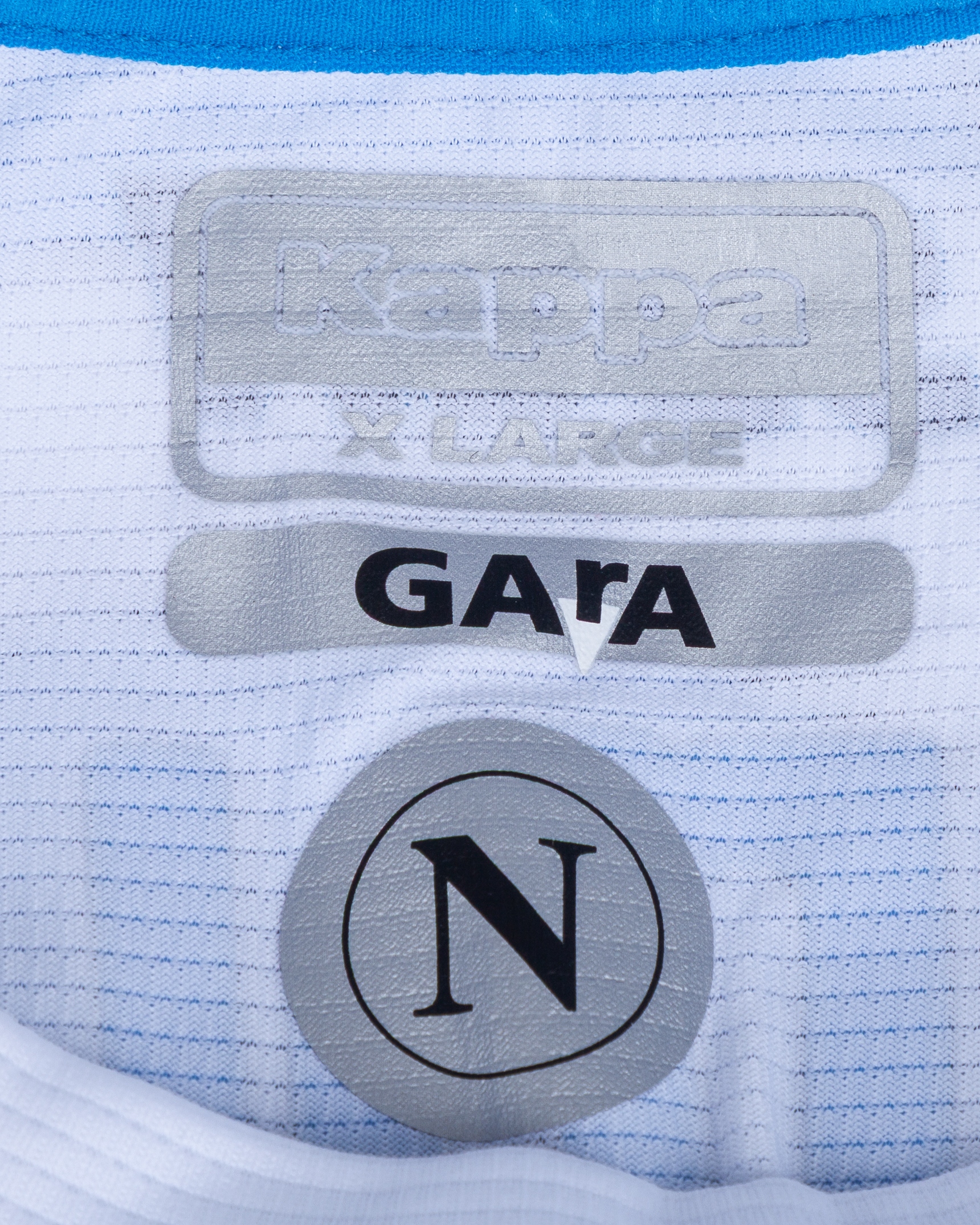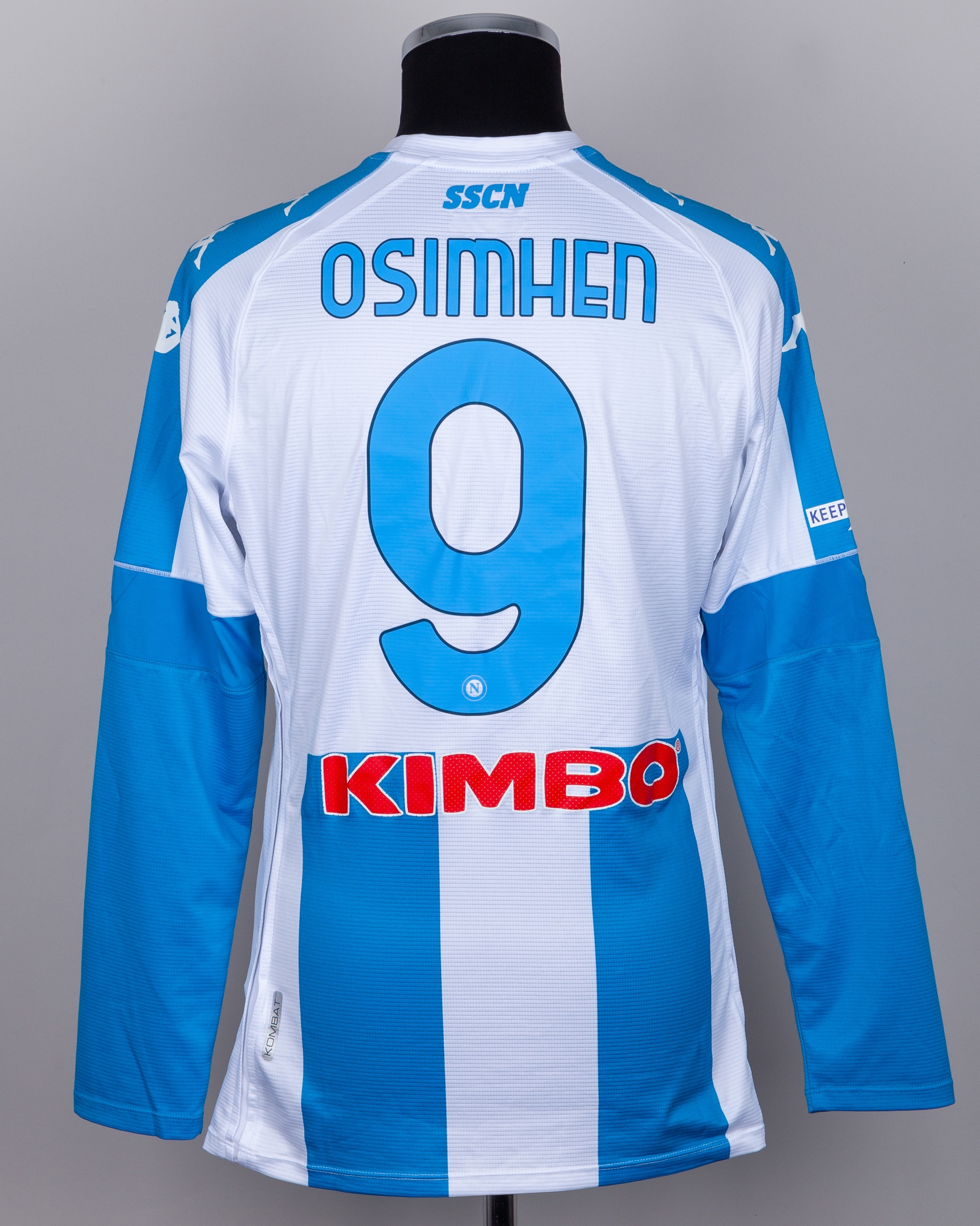 Victor Osimhen blue and white No.9 Napoli v. Roma long-sleeved shirt, 2021, Kappa, X LARGE, with crew-neck collar and printed badge, the reverse lettered OSIMHEN, the right sleeve with 2020-2021 Serie A flash