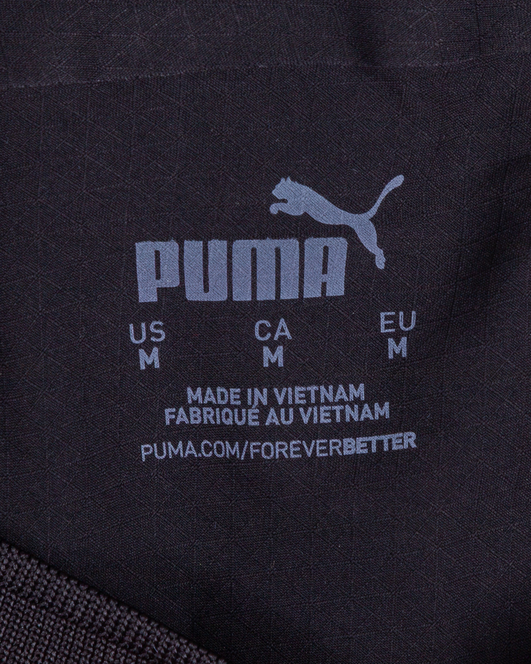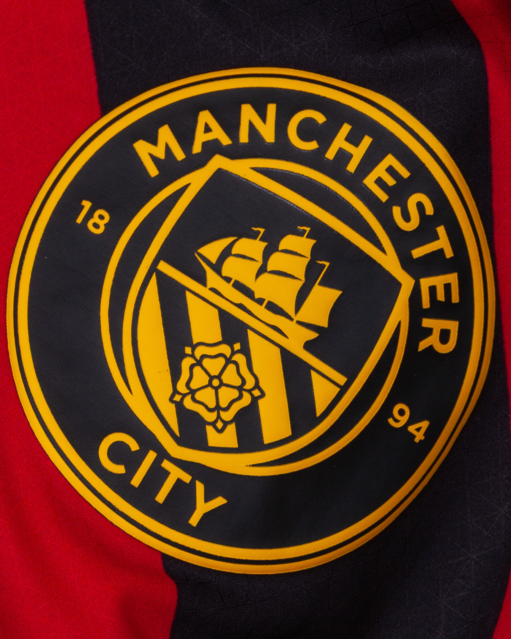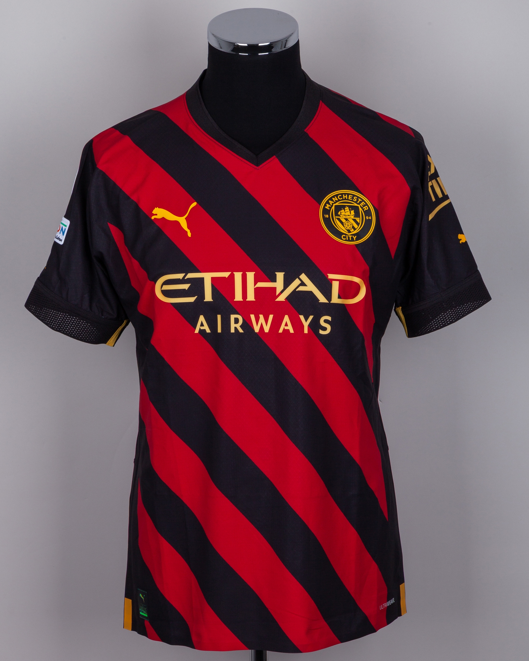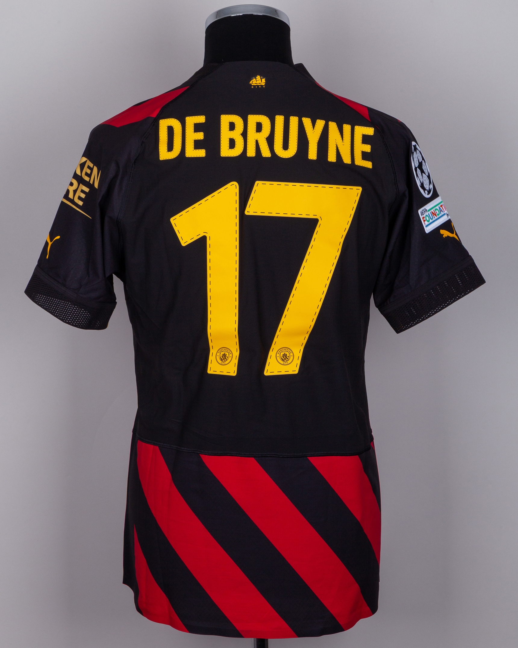 Kevin De Bruyne black and red No.17 Manchester City short-sleeved shirt, 2022-23, Puma, M, with v-neck collar and printed badge, the reverse lettered DE BRUYNE, the right sleeve with Champions League and UEFA foundation flashes, with flashes loose