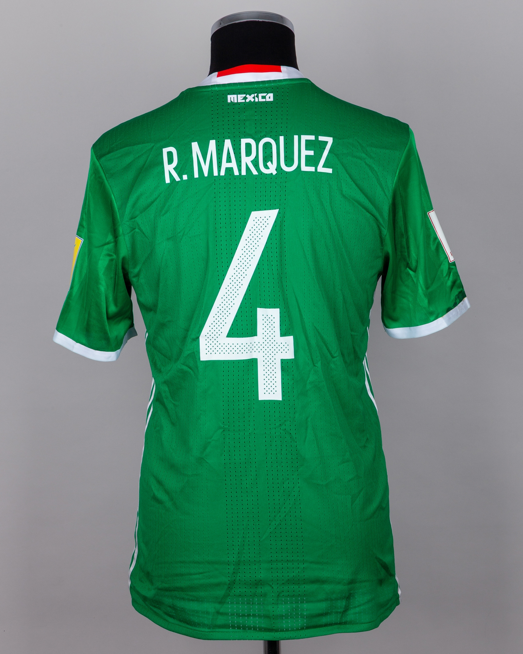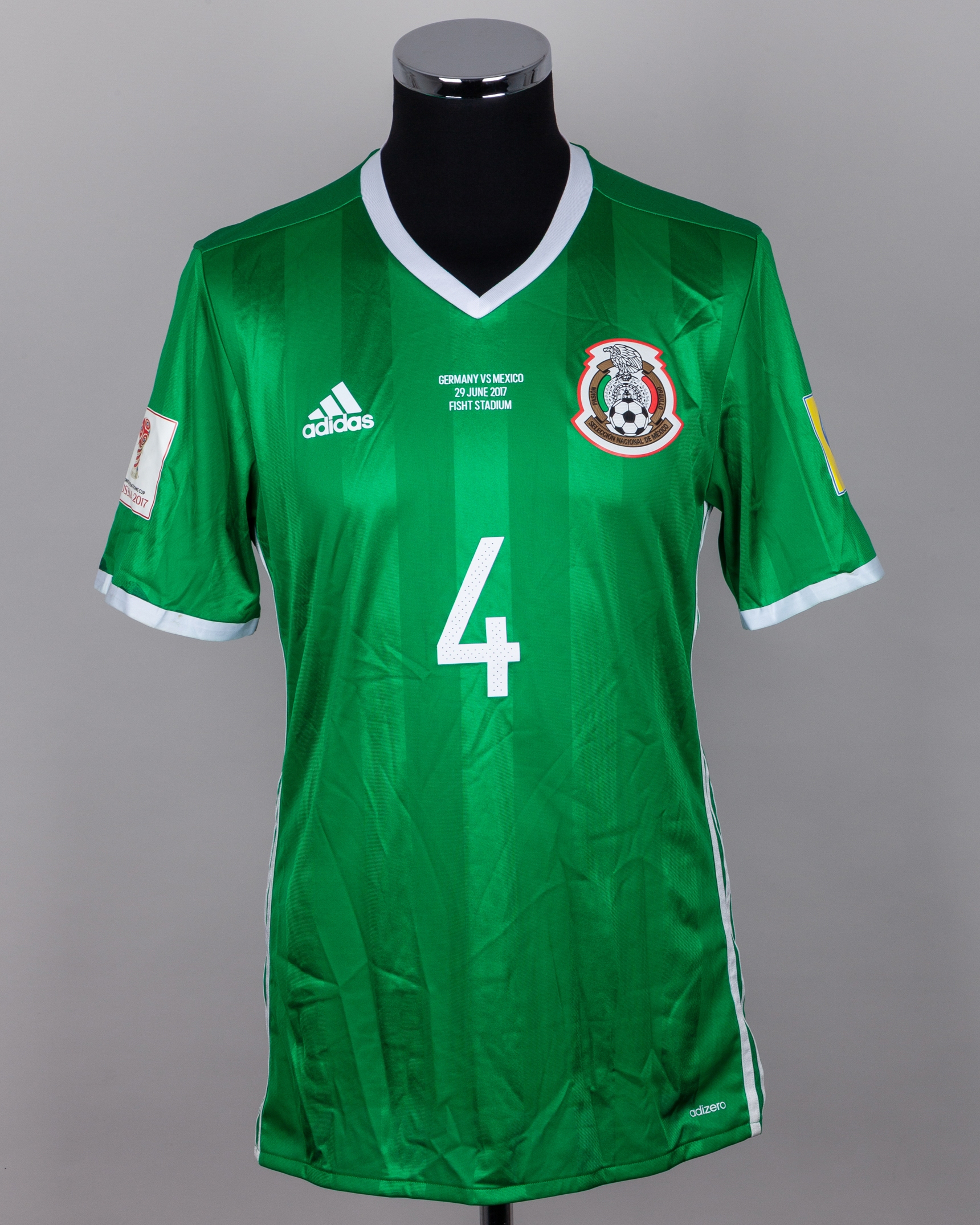 Rafael Marquez green No.4 Mexico v. Germany short-sleeved shirt, 2017, Adidas, 8, with v-neck collar and printed badge, with GERMANY VS MEXICO 29 JUNE 2017 FISHT STADIUM decal, the reverse lettered R. MARQUEZ, the right sleeve with Confederations Cup Russia 2017 flash and the left sleeve with fair play flash