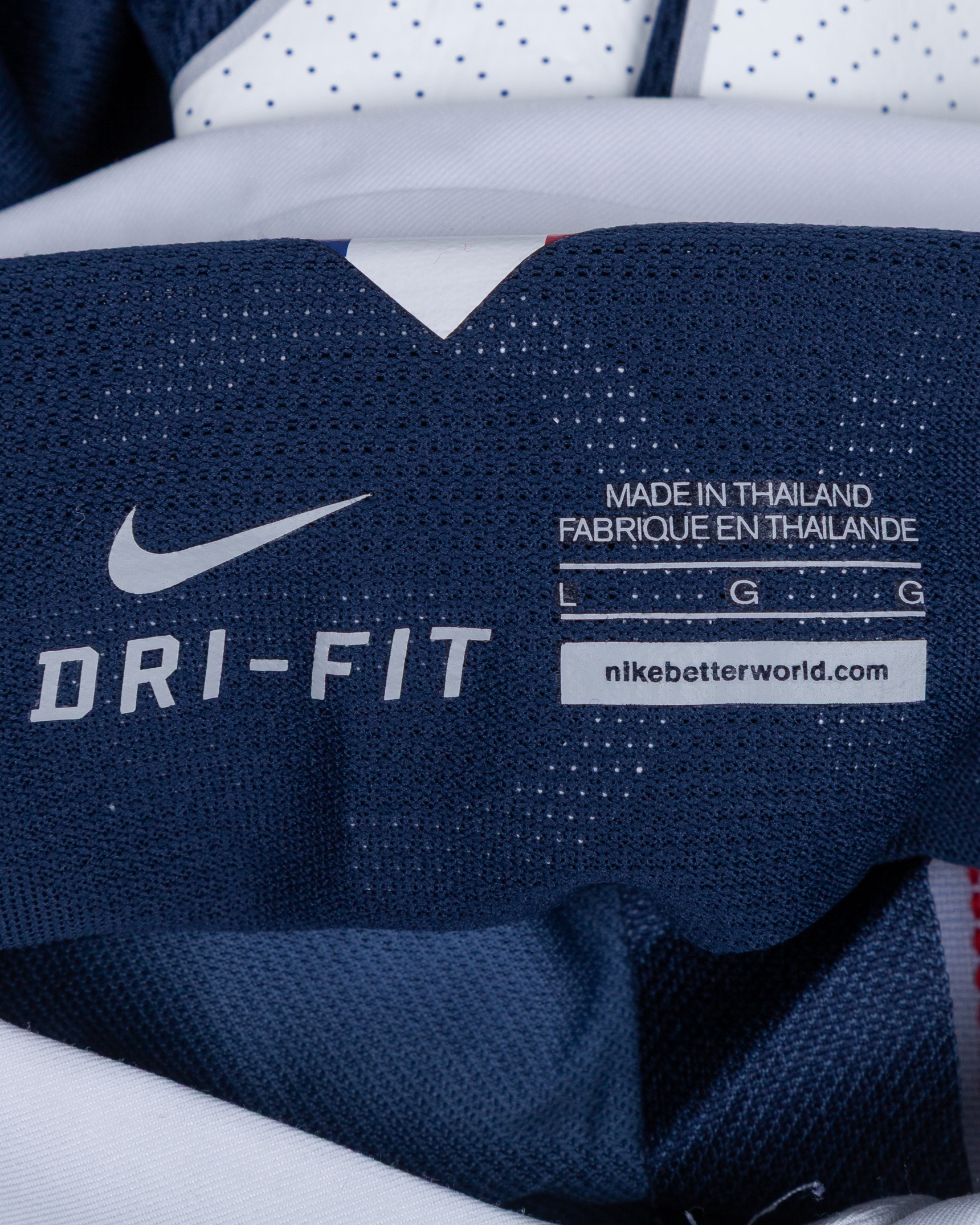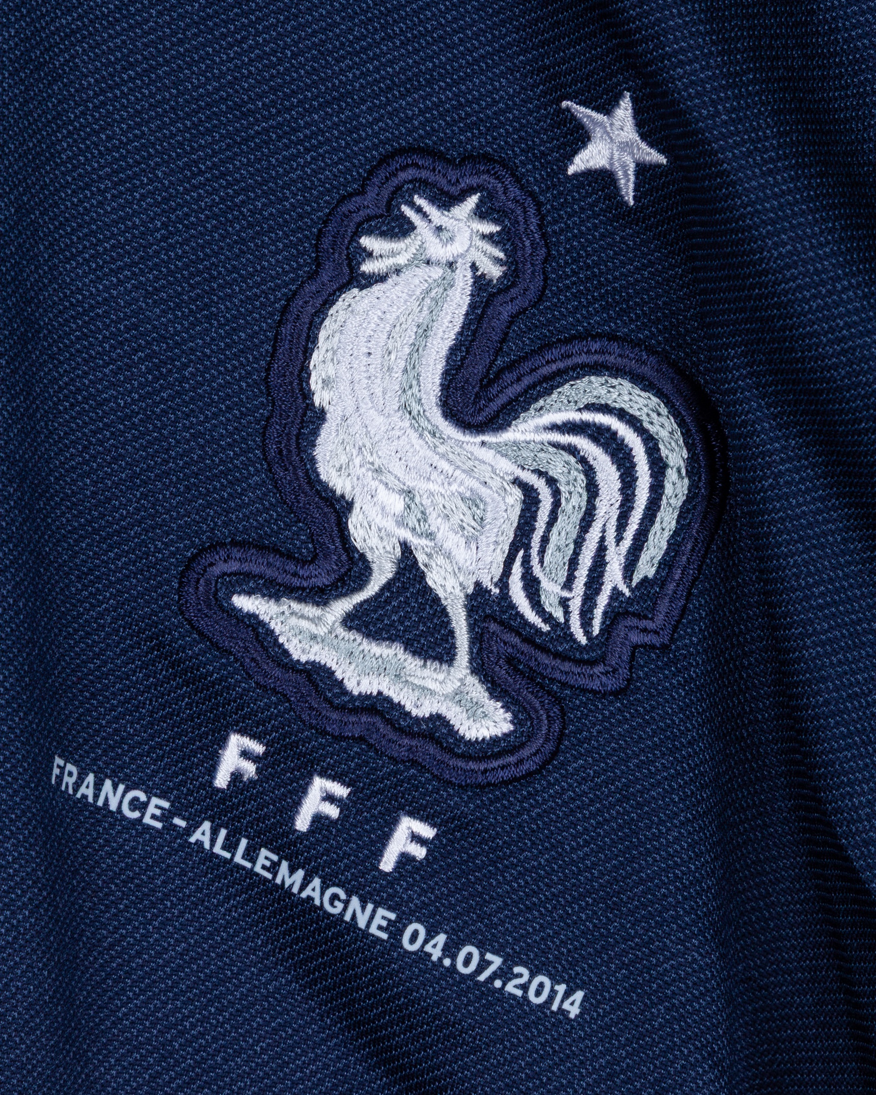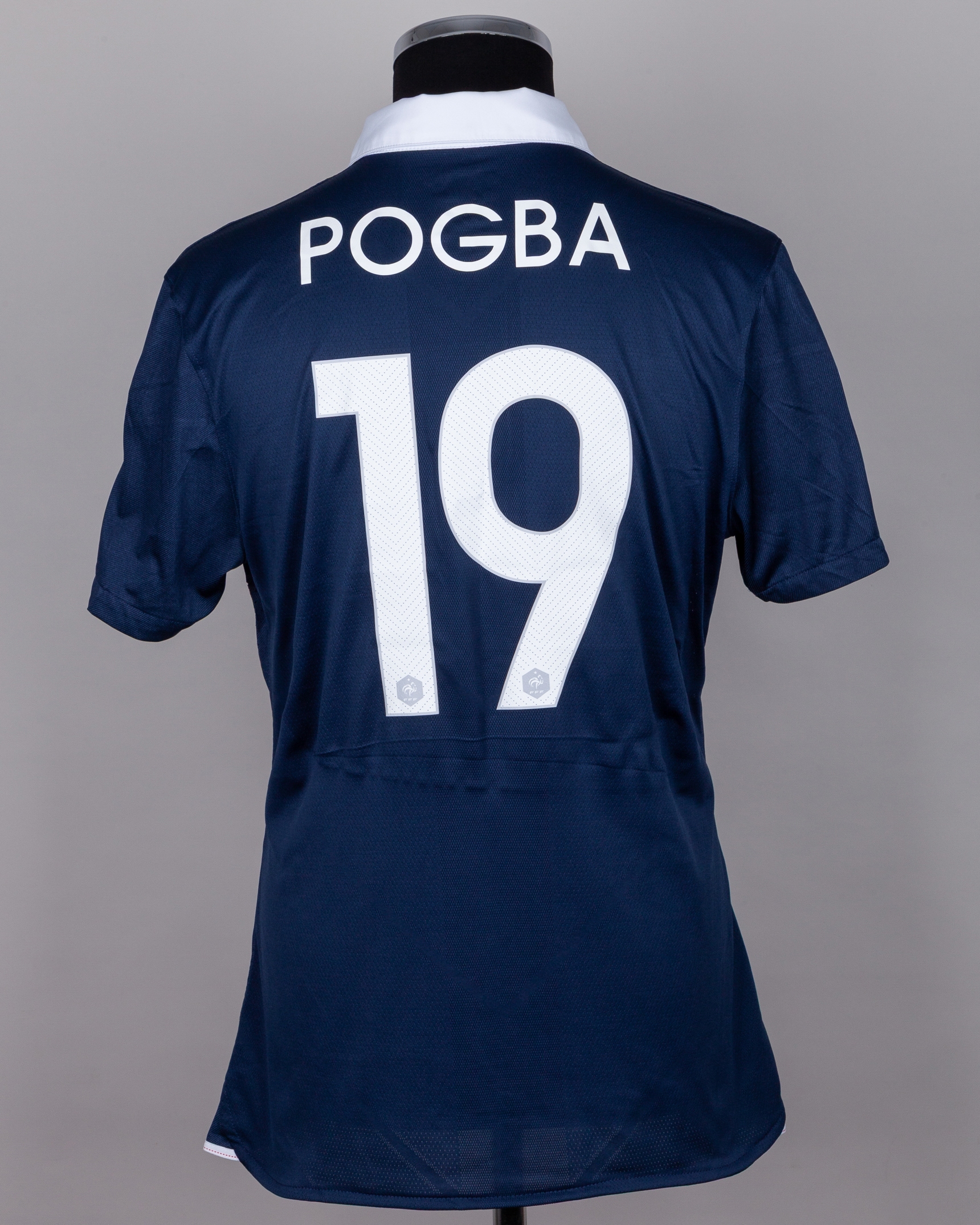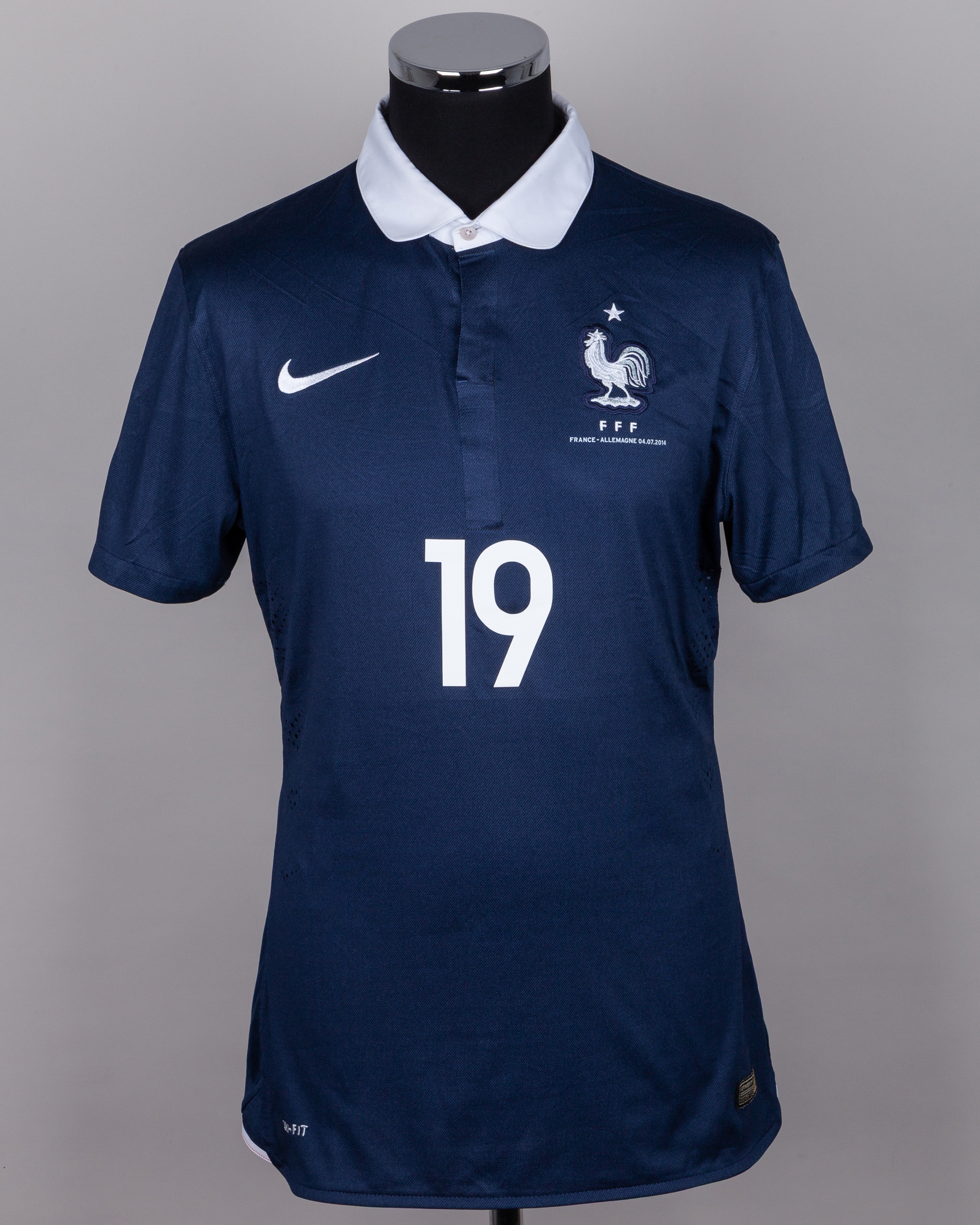 Paul Pogba blue No.19 France v. Germany short-sleeved shirt, 2014, Nike, L, with button-up collar and embroidered cloth badge inscribed F F F, with FRANCE - ALLEMAGNE 04.07.2014 decal, the reverse lettered POGBA, the right sleeve with FIFA World Cup Brasil flash and the left sleeve with football for hope flash