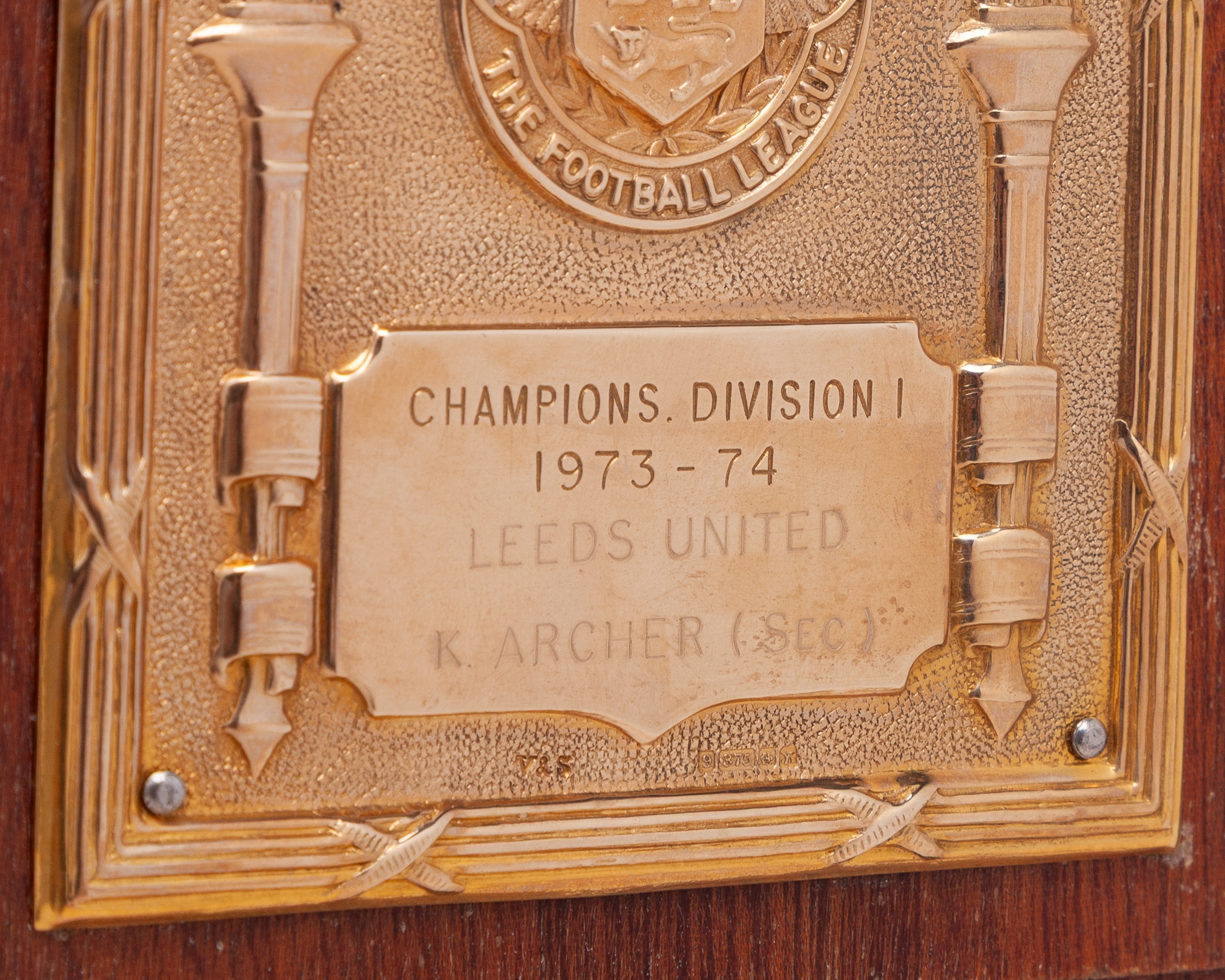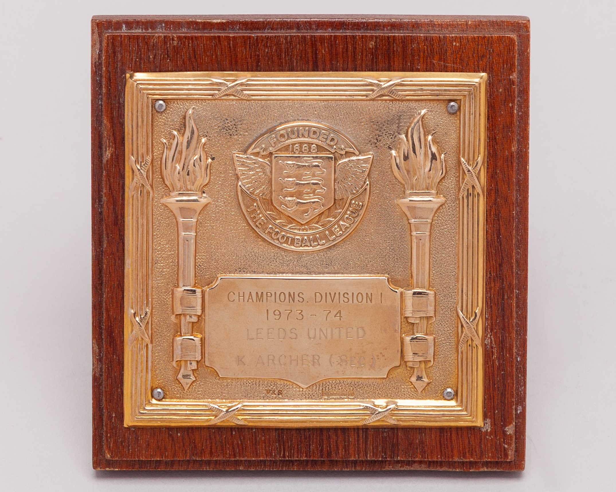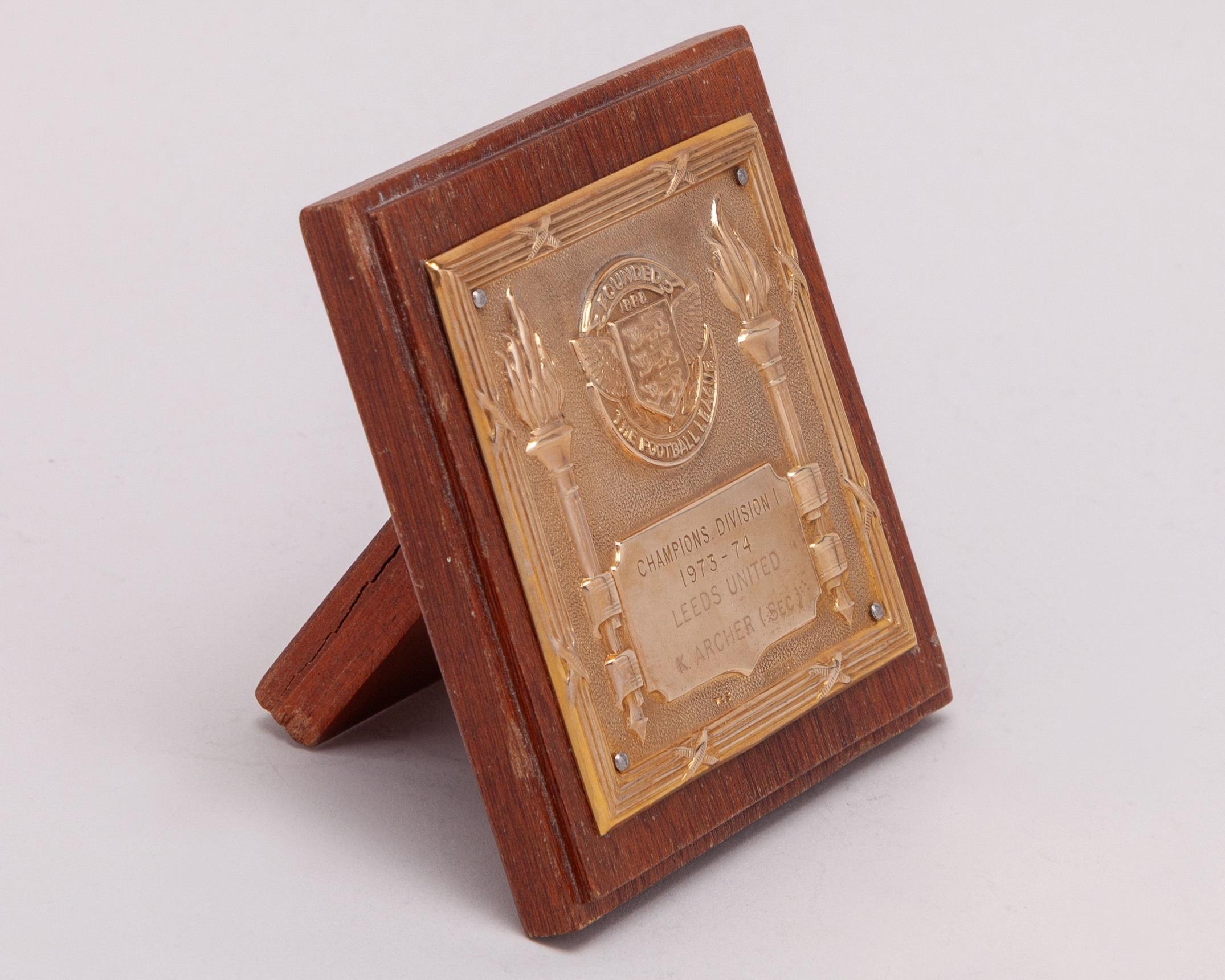 Keith Archer (Sec) 9ct gold Leeds United 1973-74 Division I League Championship winners plaque inscribed CHAMPIONS DIVISION I, 1973-74, LEEDS UNITED K. ARCHER (SEC), mounted on teak with easel stand