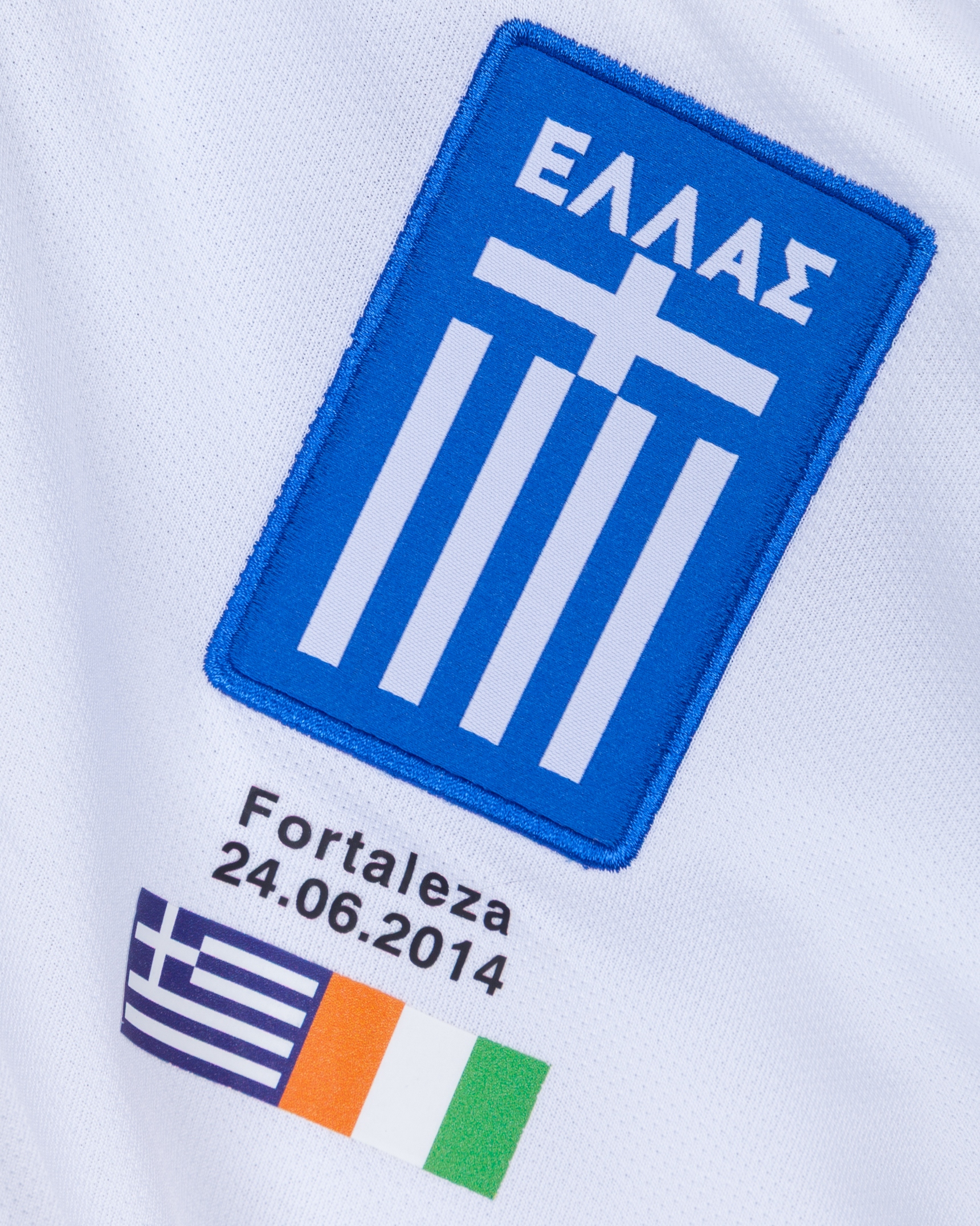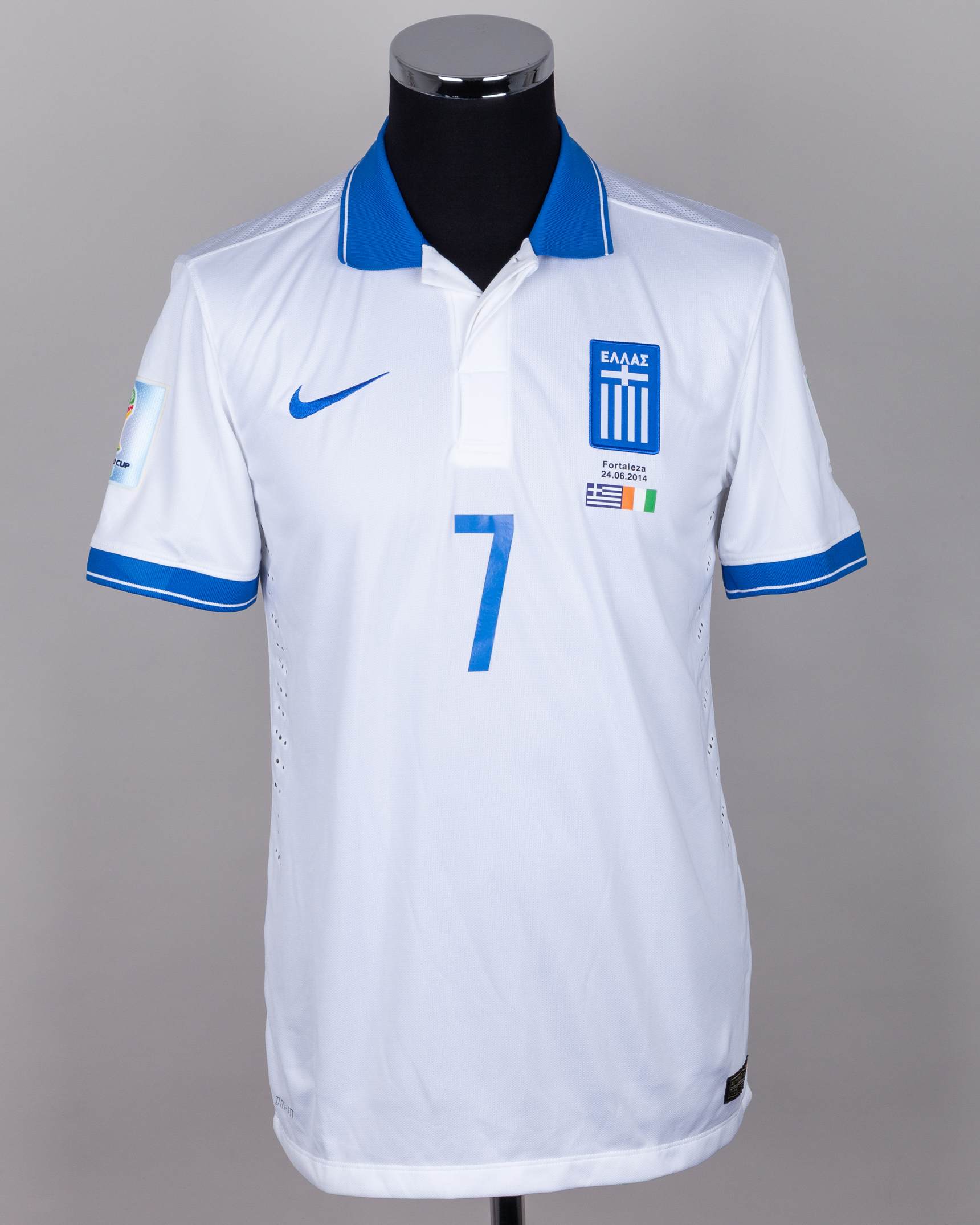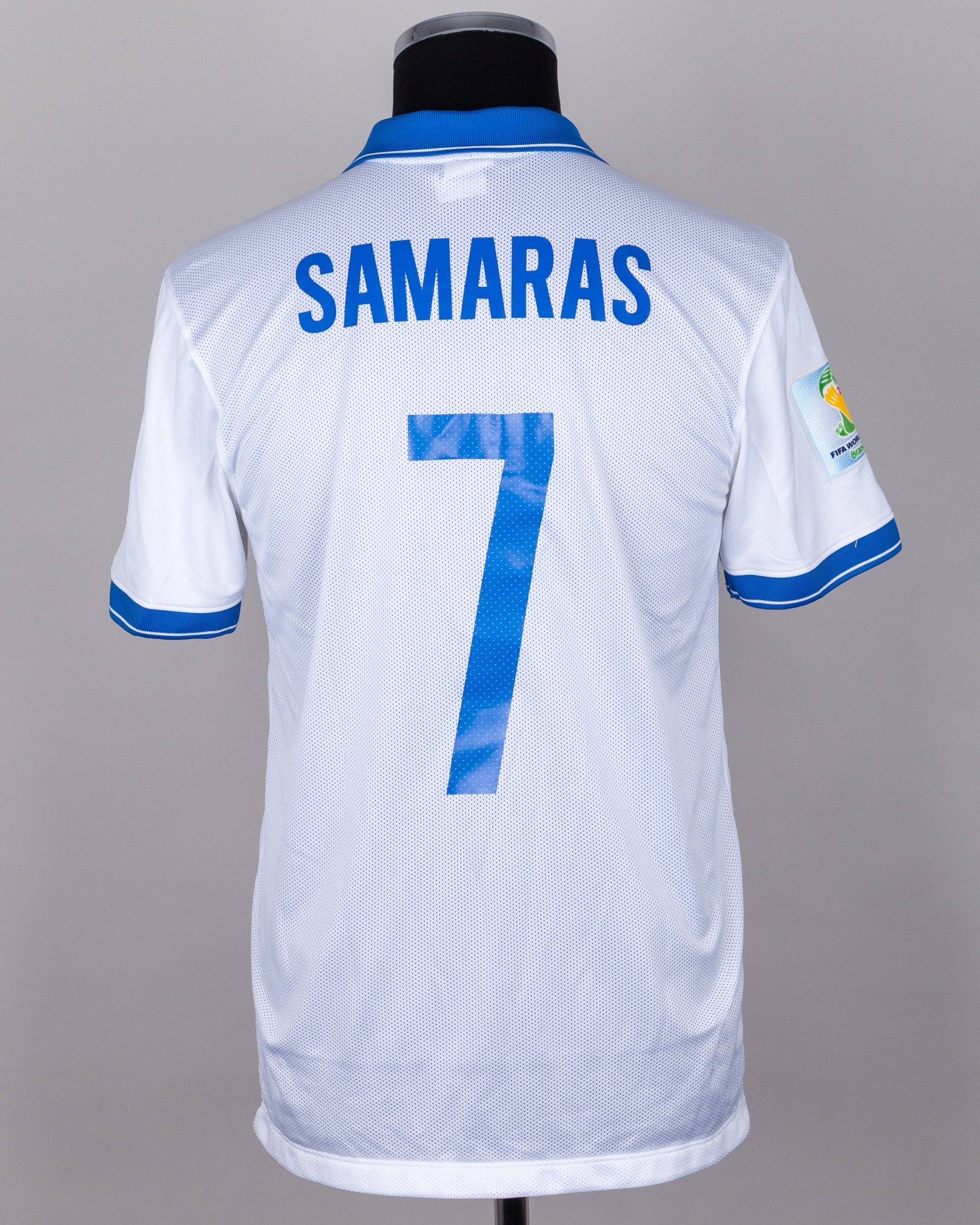 Georgios Samaras white and blue No,7 Greece v. Ivory Coast short-sleeved shirt, 2014, Nike, M, with button-up collar and embroidered cloth badge, with FORTALEZA 24.06.2014 decal, the reverse lettered SAMARAS, the right sleeve with FIFA World Cup Brasil flash and the left sleeve with football for hope flash