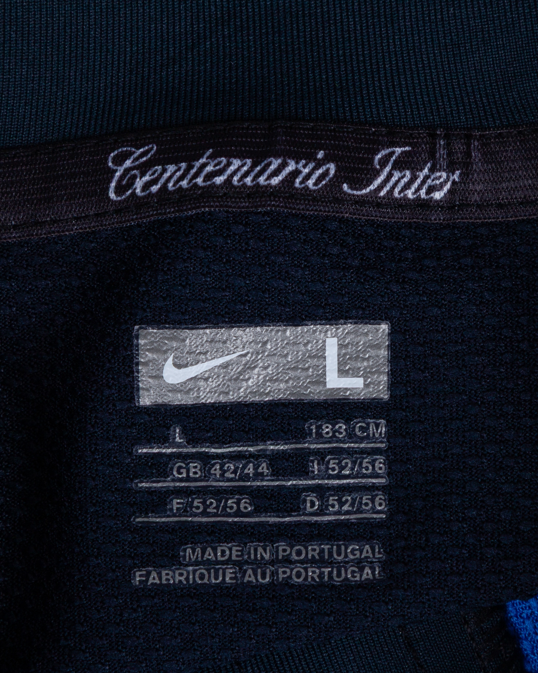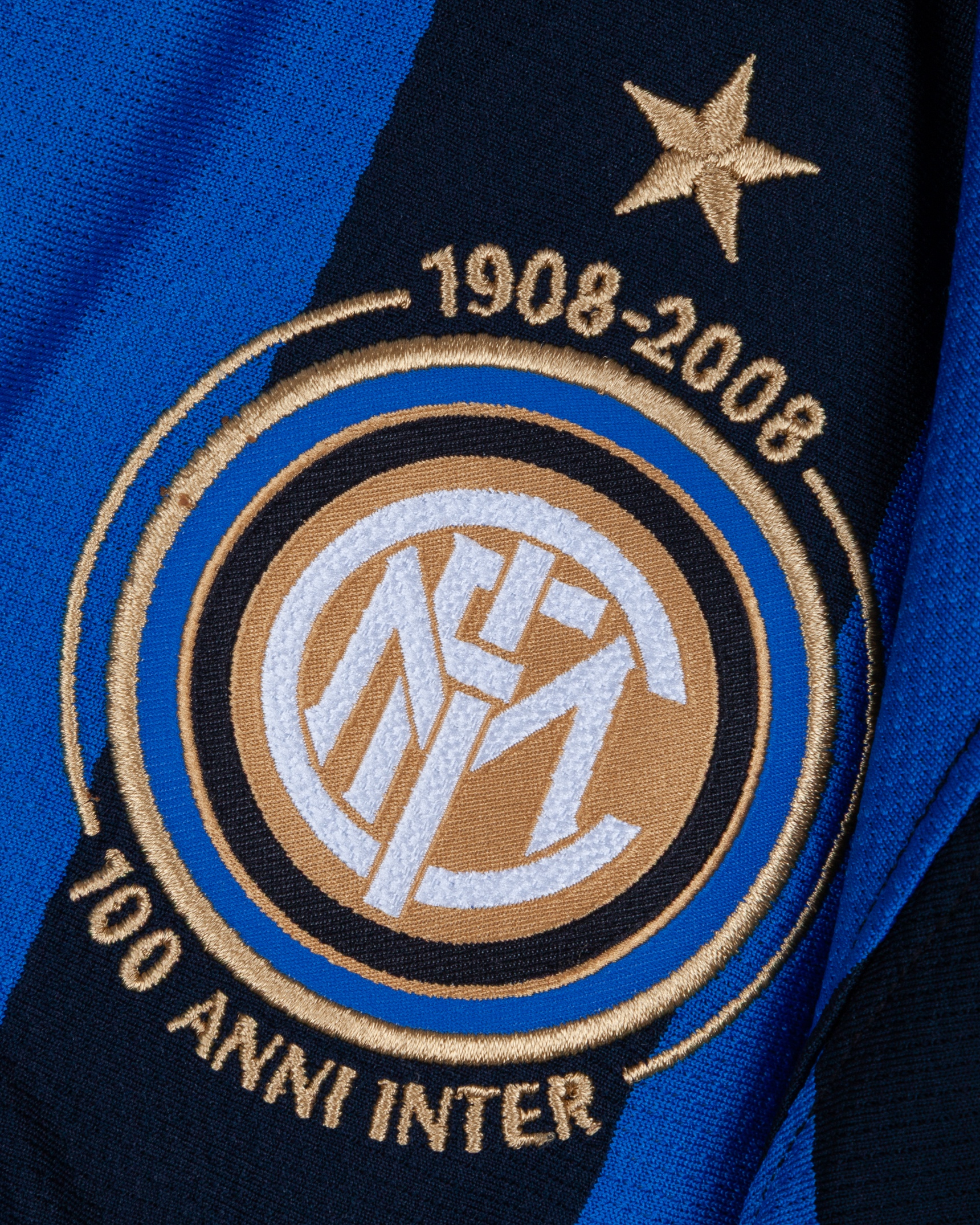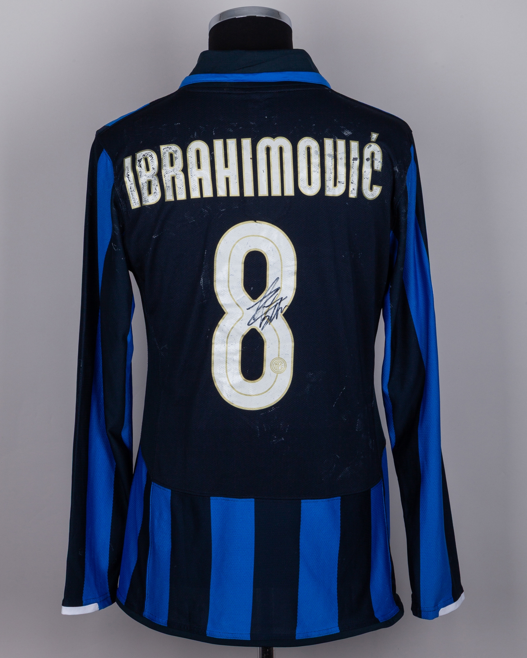 Zlatan Ibrahimovic blue and black No.8 Inter Milan autographed long-sleeved shirt, 2007-08, Nike, L, with v-neck style collar and embroidered cloth badge inscribed 1908-2008 100 ANNI INTER, the reverse lettered IBRAHIMOVIC, the right sleeve with Champions League flash, autographed on the back, with number rubbing and staining