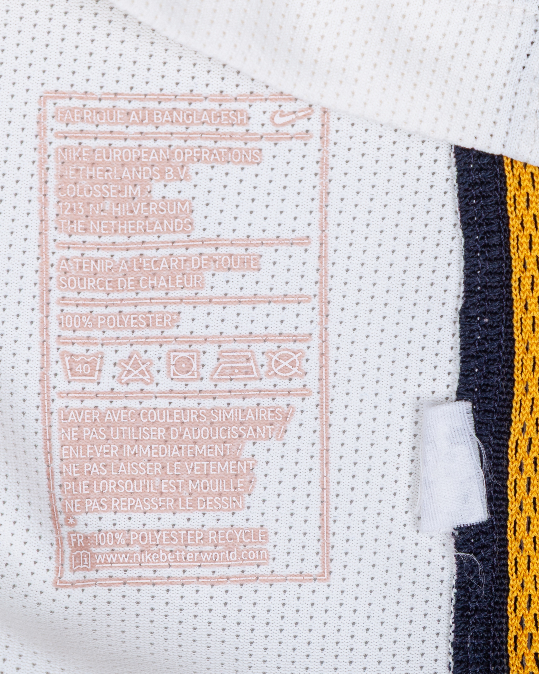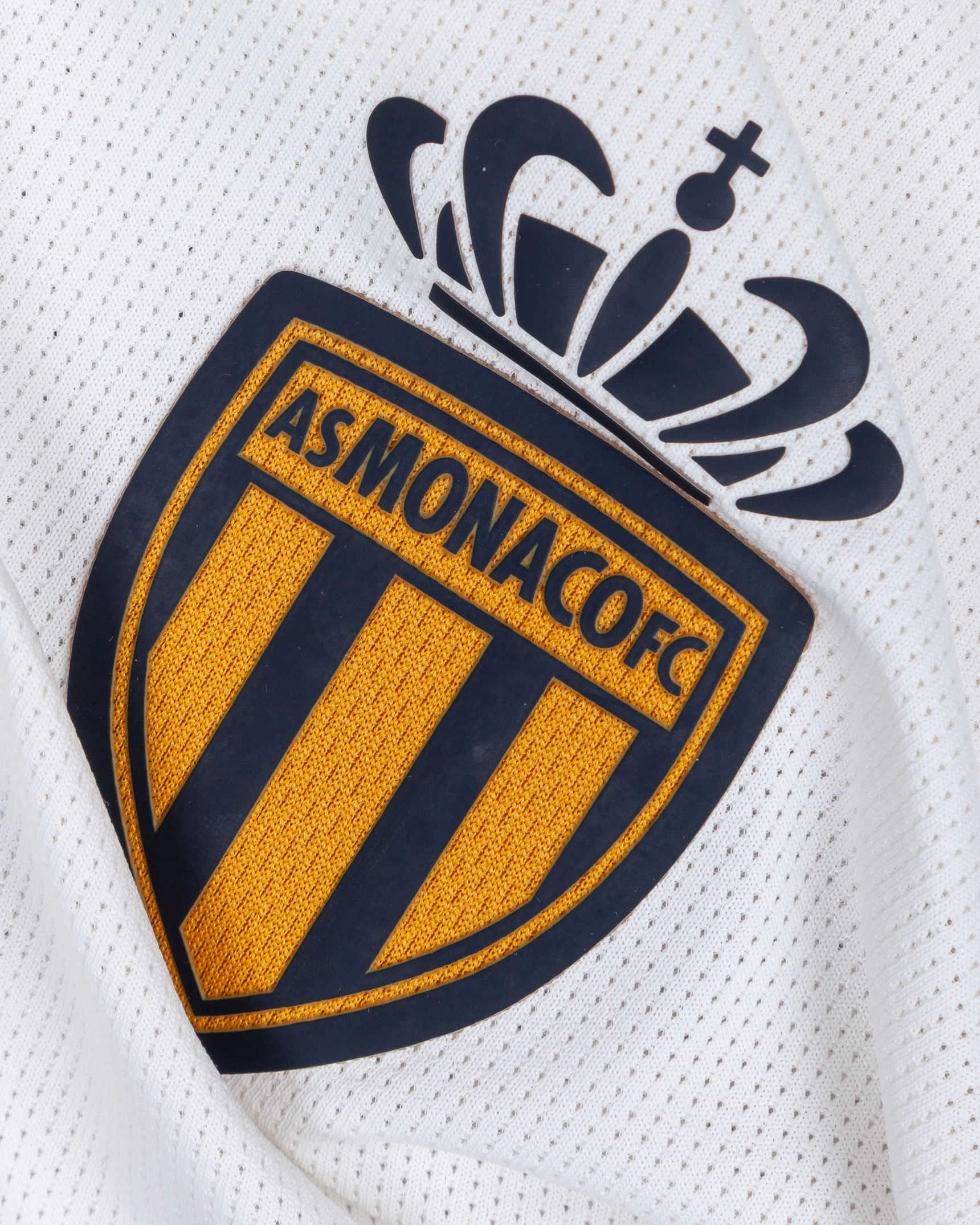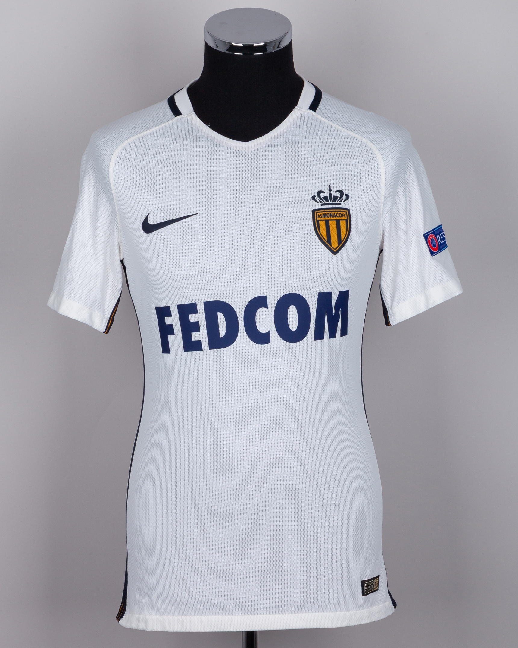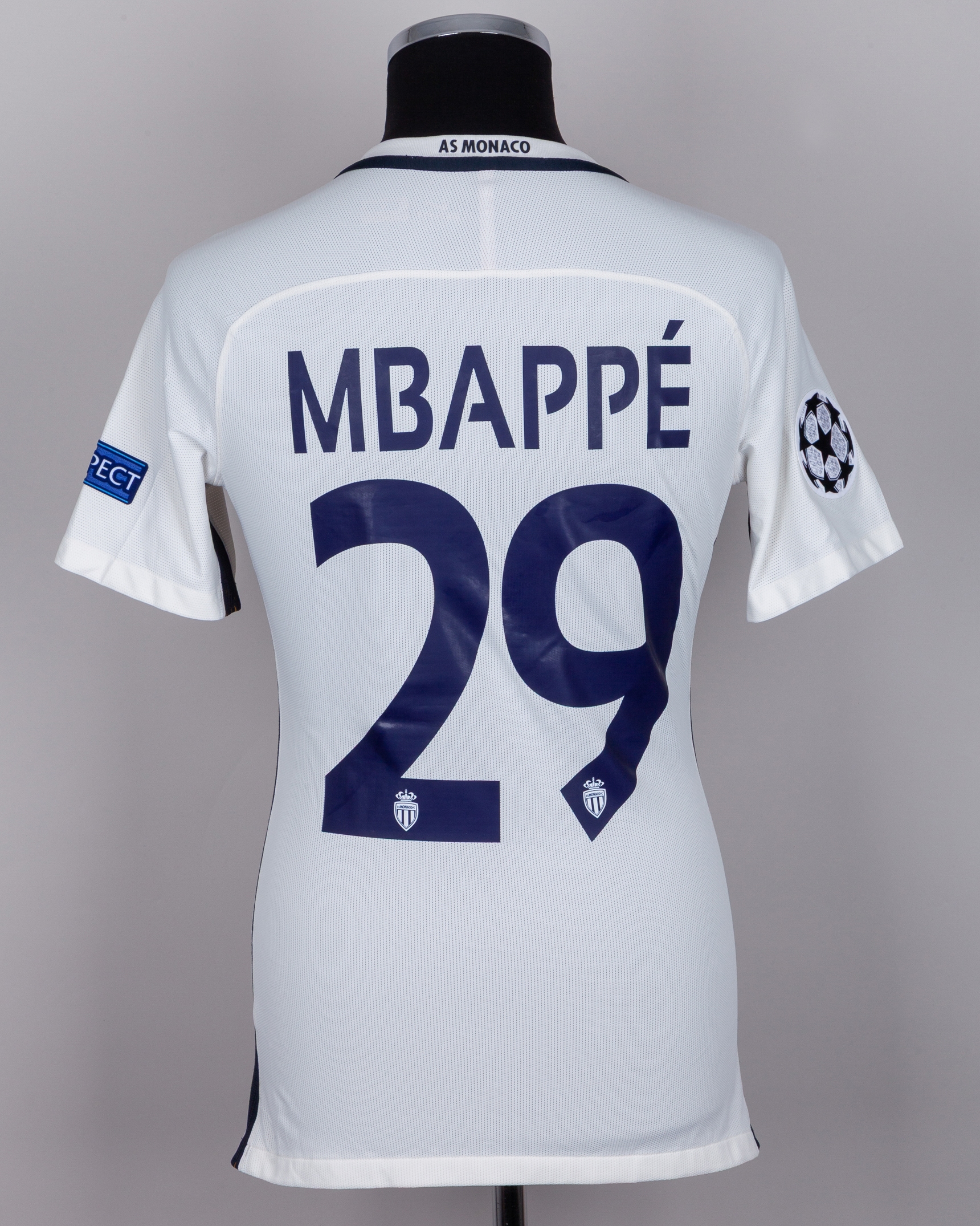 Kylian Mbappe white No.29 Monaco short-sleeved shirt, 2016-17, Nike, M, with v-neck collar and printed badge, the reverse lettered MBAPPE, the right sleeve with Champions League flash and the left sleeve with respect flash, with some staining