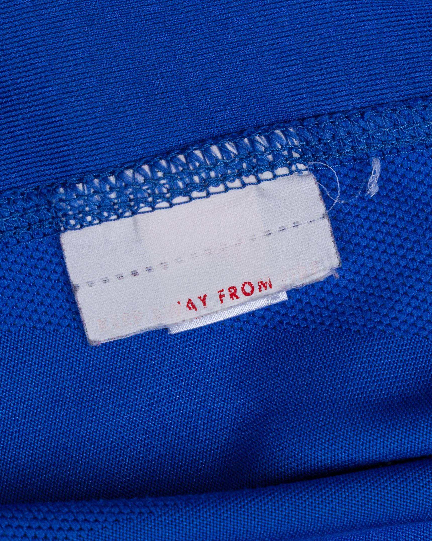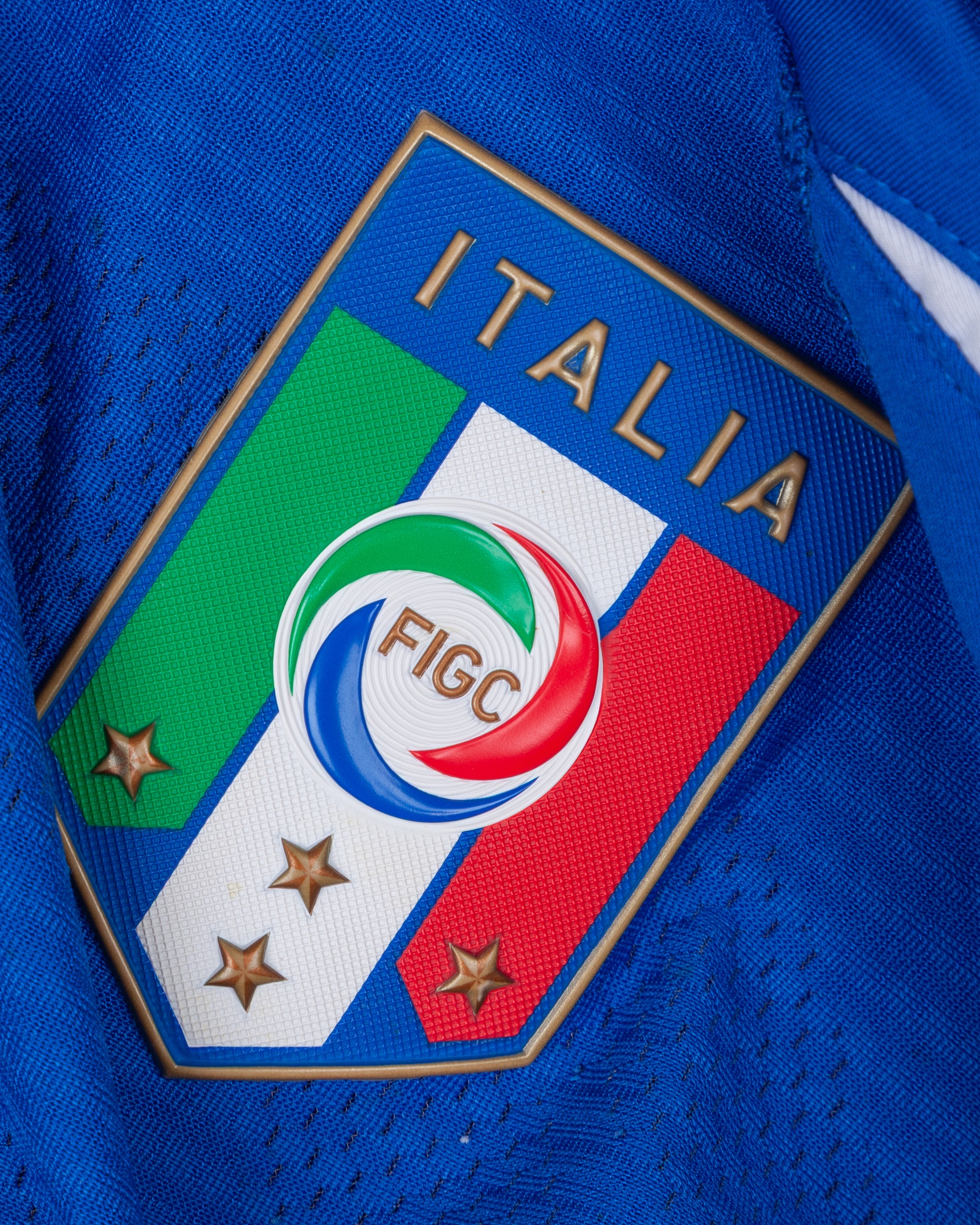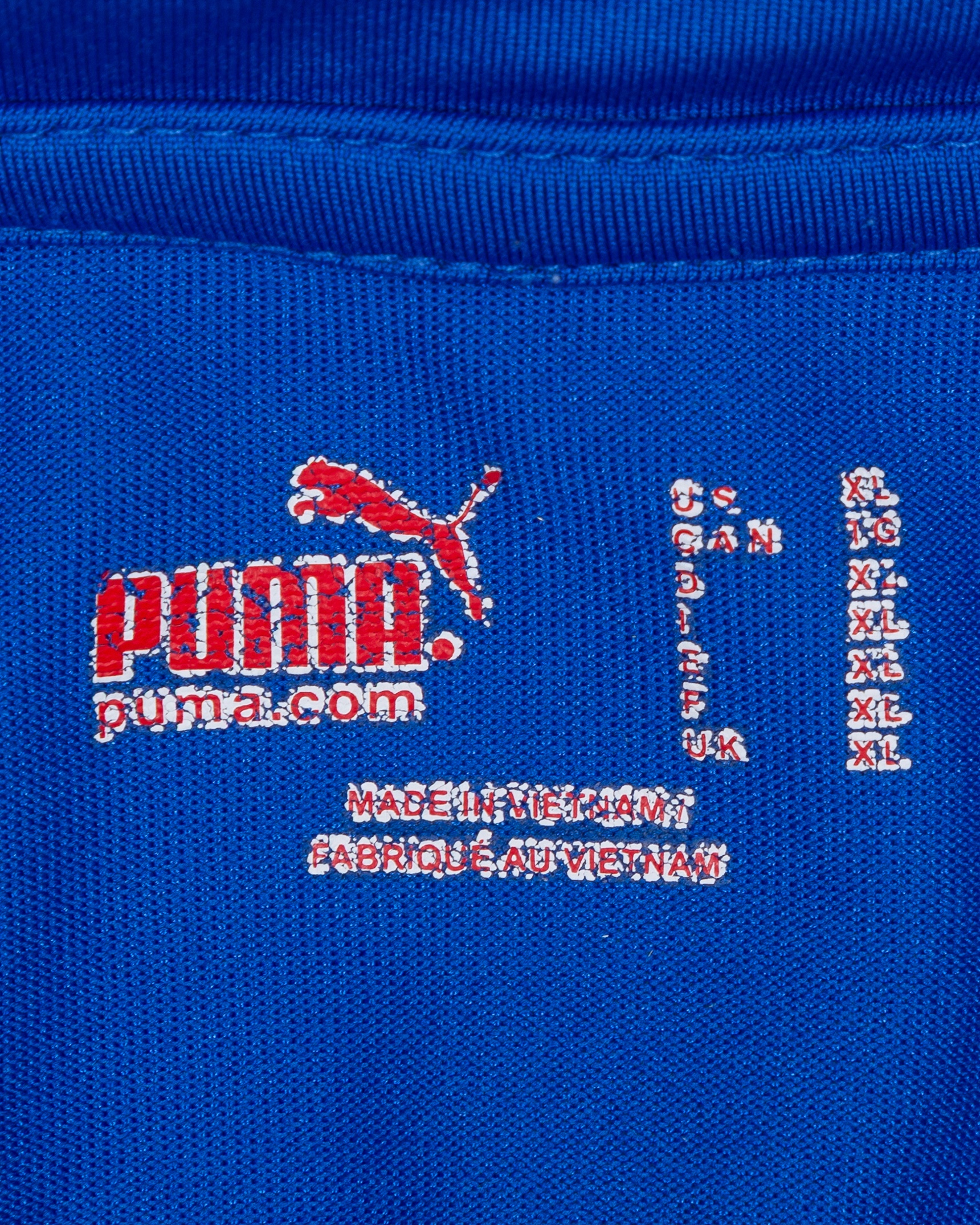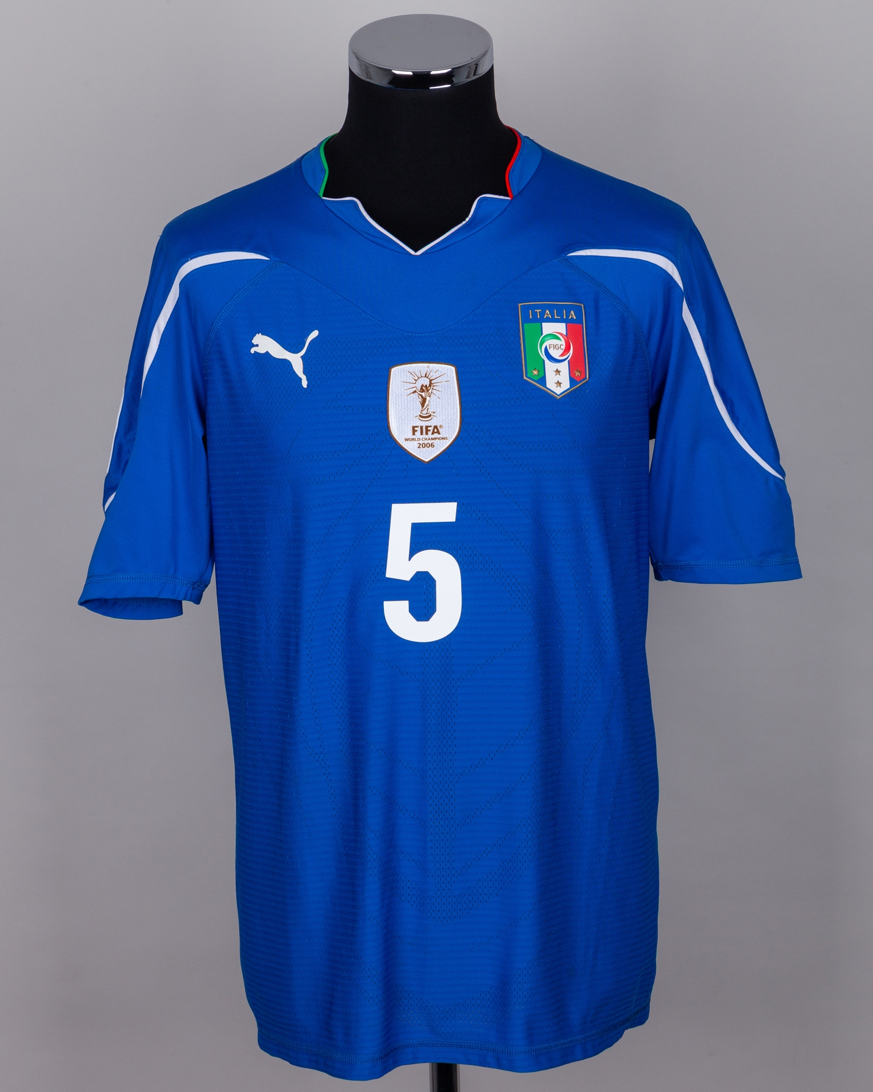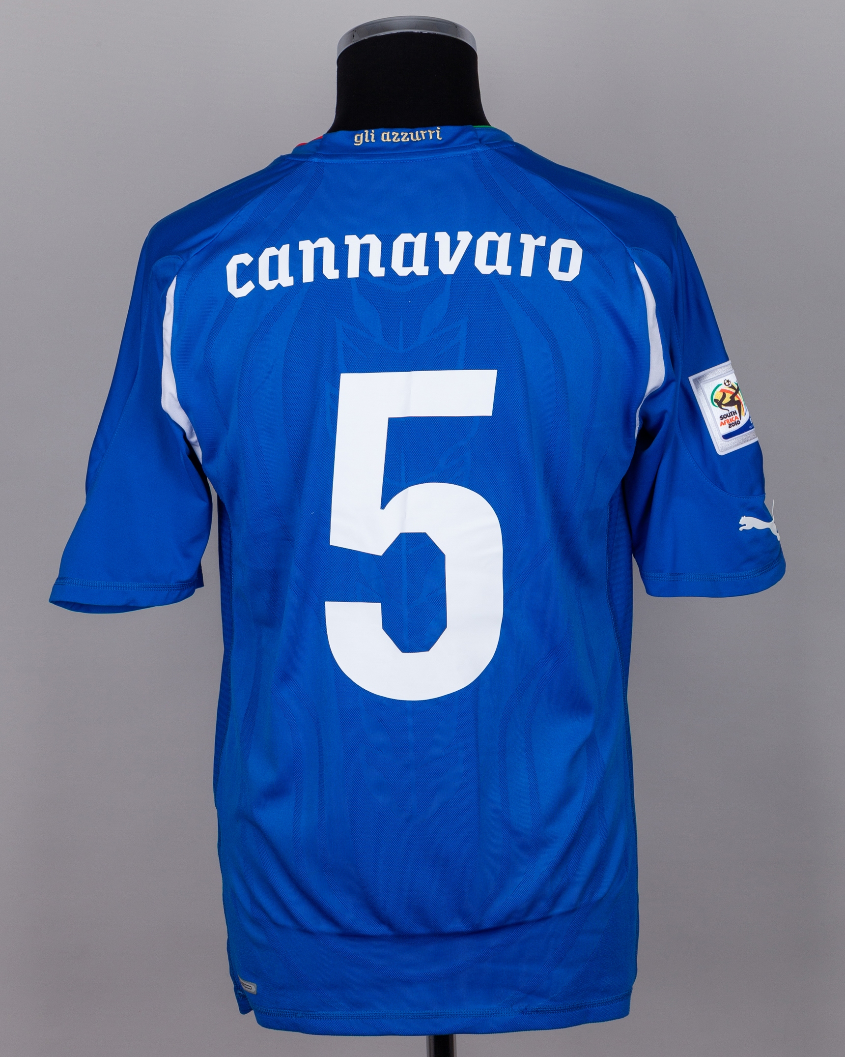 Fabio Cannavaro blue No.5 Italy short-sleeved shirt, 2010, Puma, XL, with v-neck style collar and printed badge, with FIFA World Champions 2006 printed badge, the reverse lettered cannavaro, the right sleeve with South Africa 2010 FIFA World Cup flash
