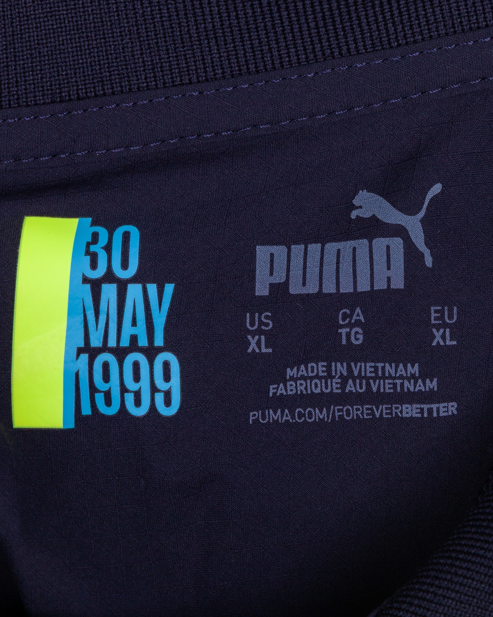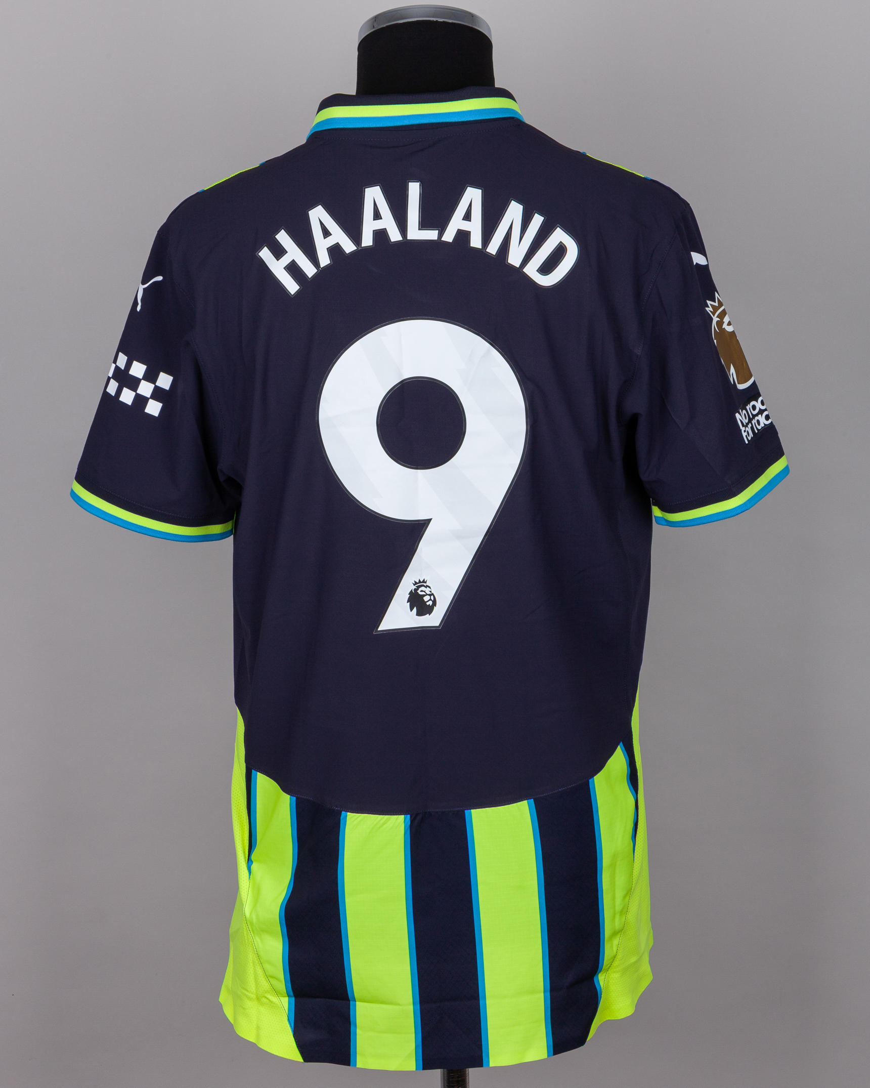 Erling Haaland dark blue and yellow No.9 Manchester City short-sleeved shirt, 2024-25, Puma, XL, with crew-neck collar and printed badge, with FIFA World Champions 2023 printed badge, the reverse lettered HAALAND, the right sleeve with Premier League flash