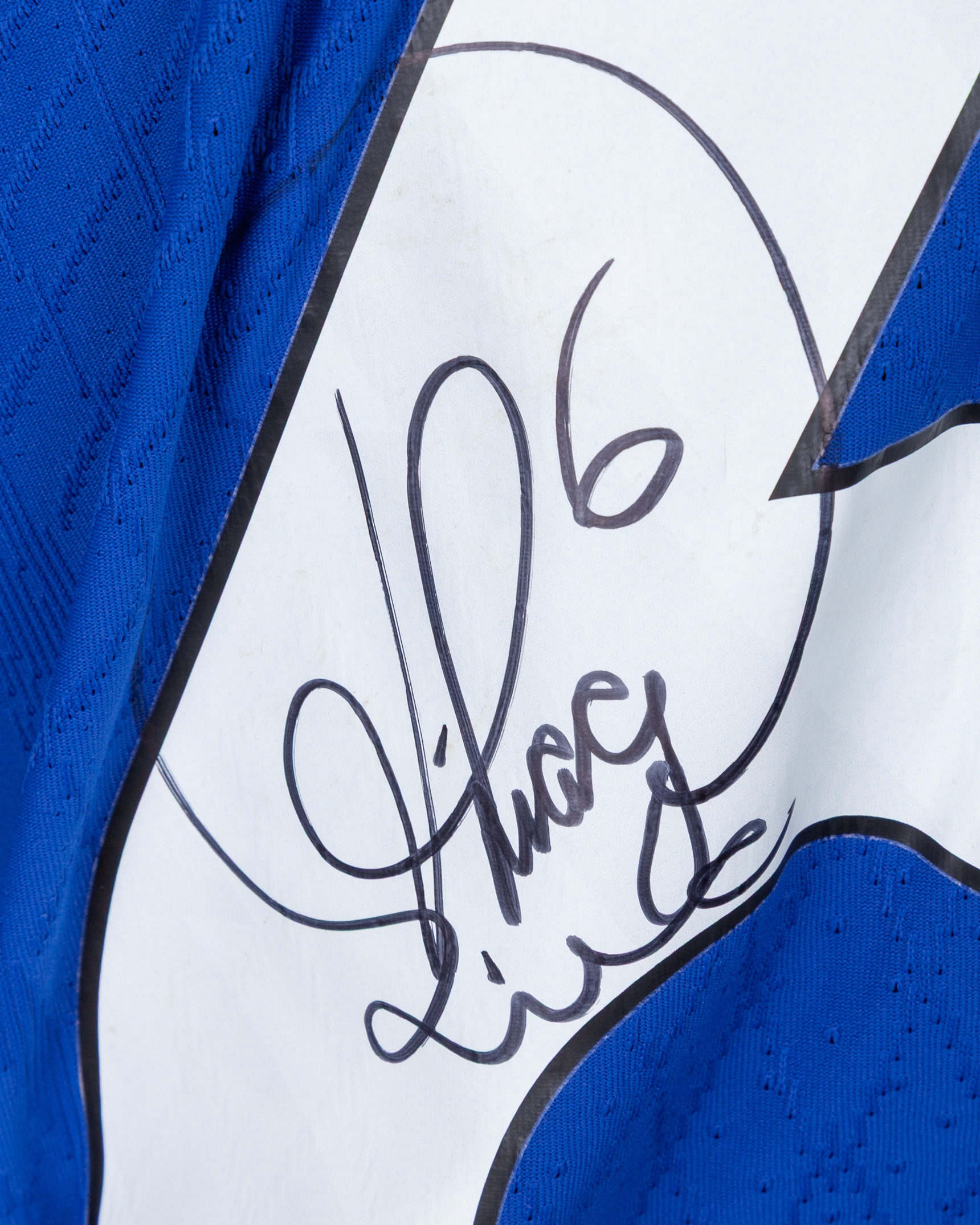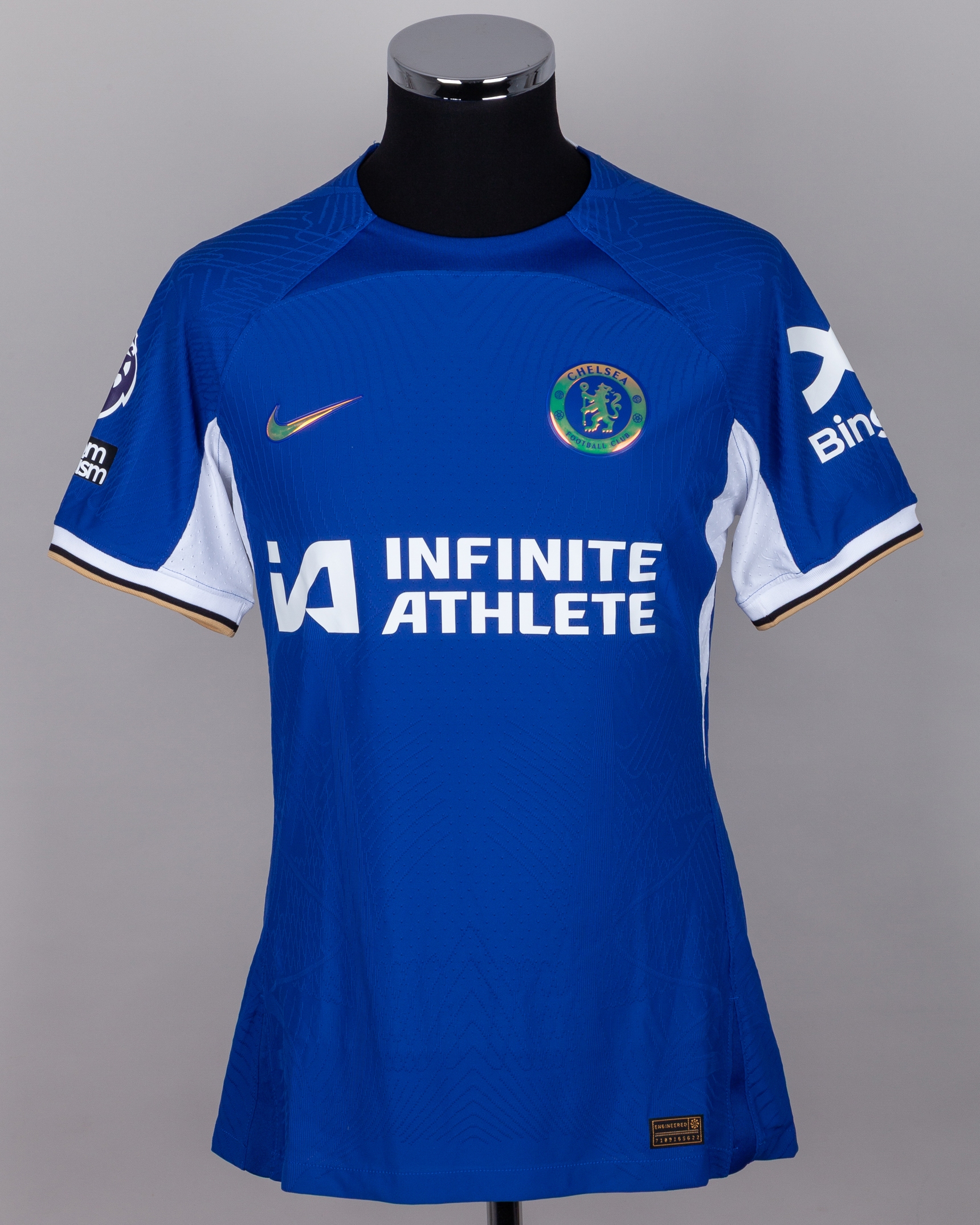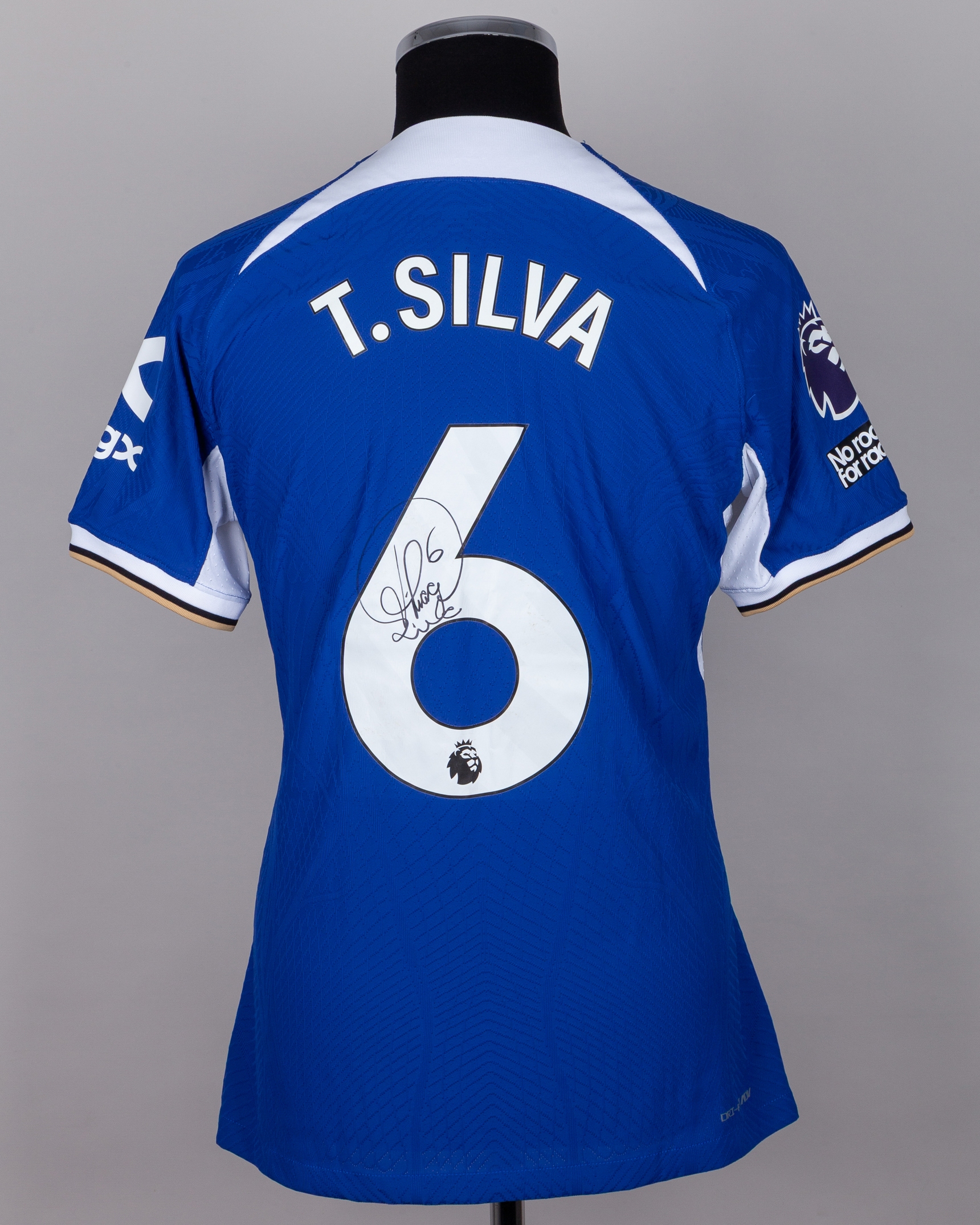 Thiago Silva blue No.6 Chelsea autographed short-sleeved shirt, 2023-24, Nike, L, with crew-neck collar and printed badge, the reverse lettered T. SILVA, the right sleeve with Premier League flash, autographed on the number