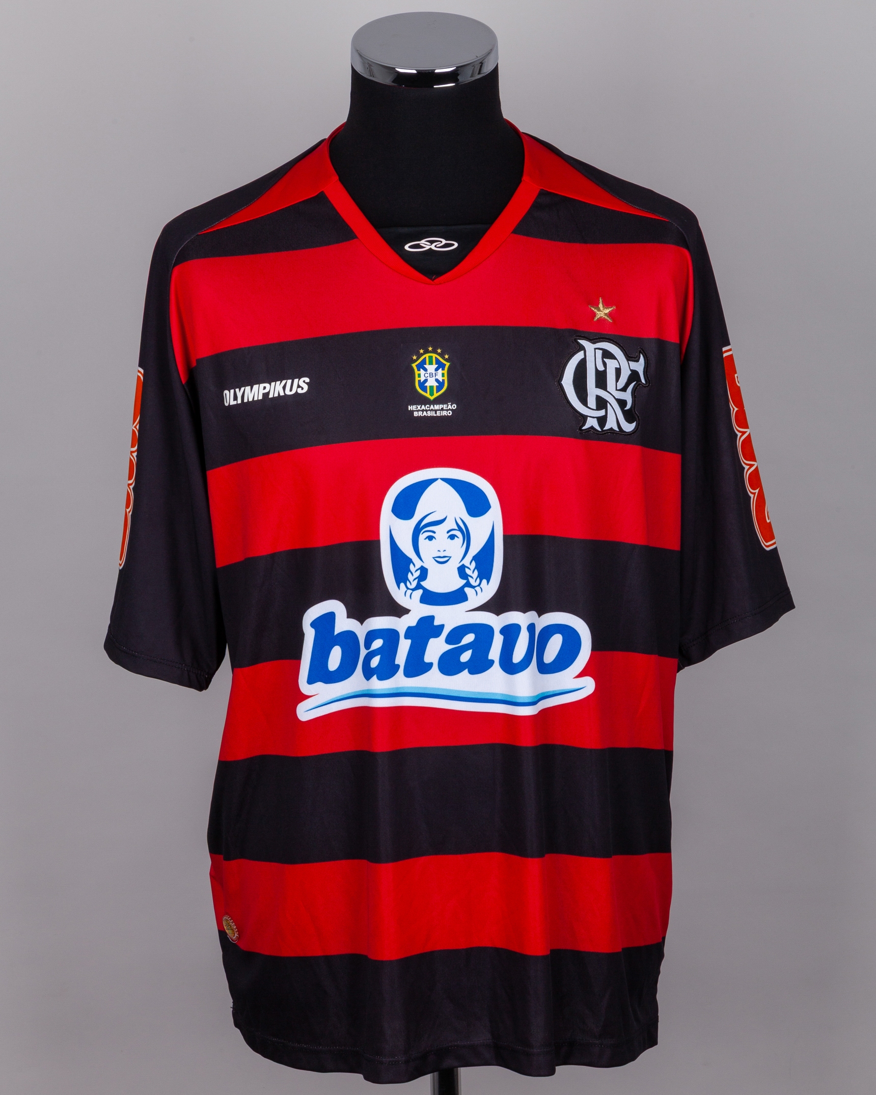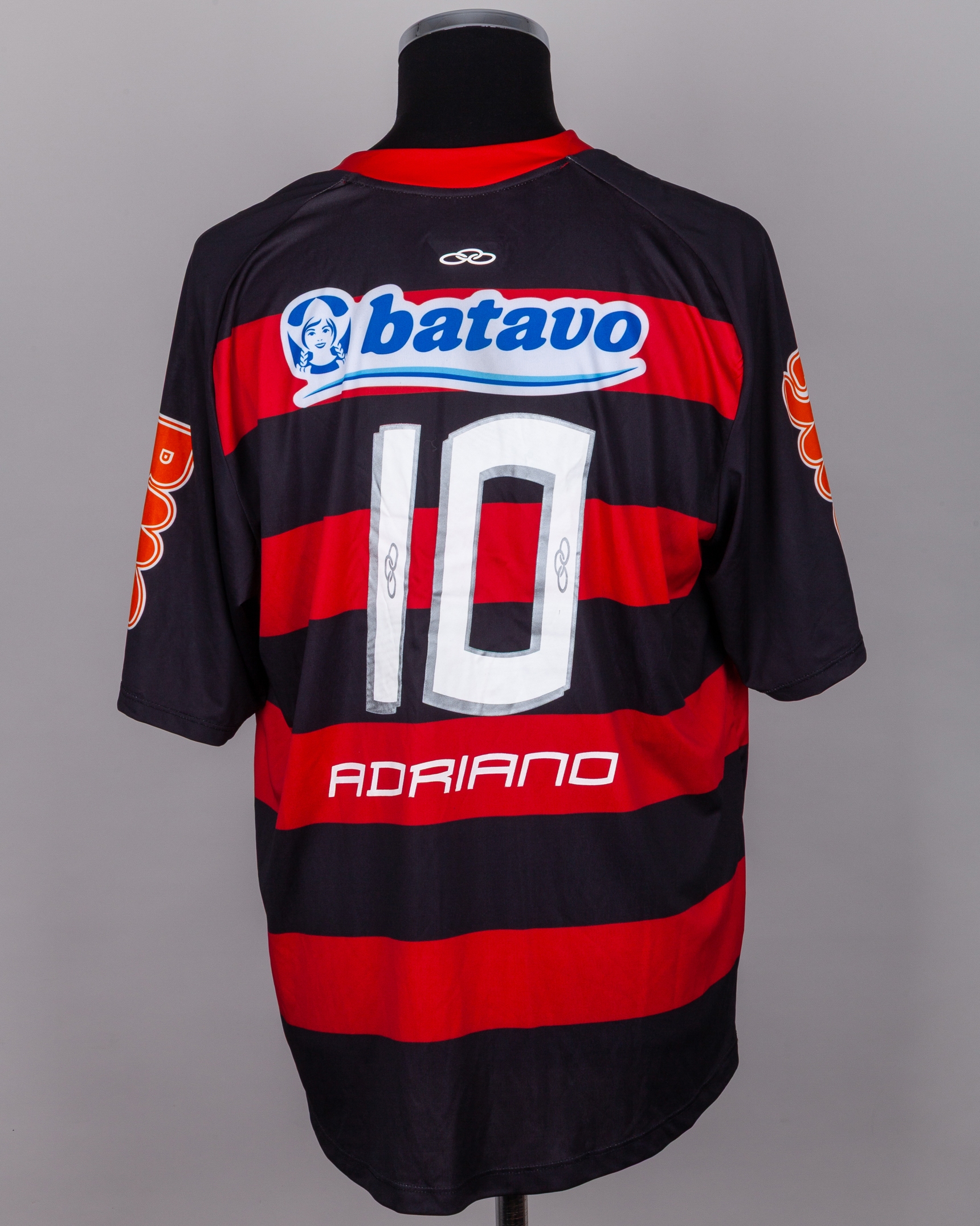 Adriano red and black No.10 Flamengo short-sleeved shirt, 2010, Olympikus, EL, with crew-neck collar and embroidered cloth badge, the reverse lettered ADRIANO