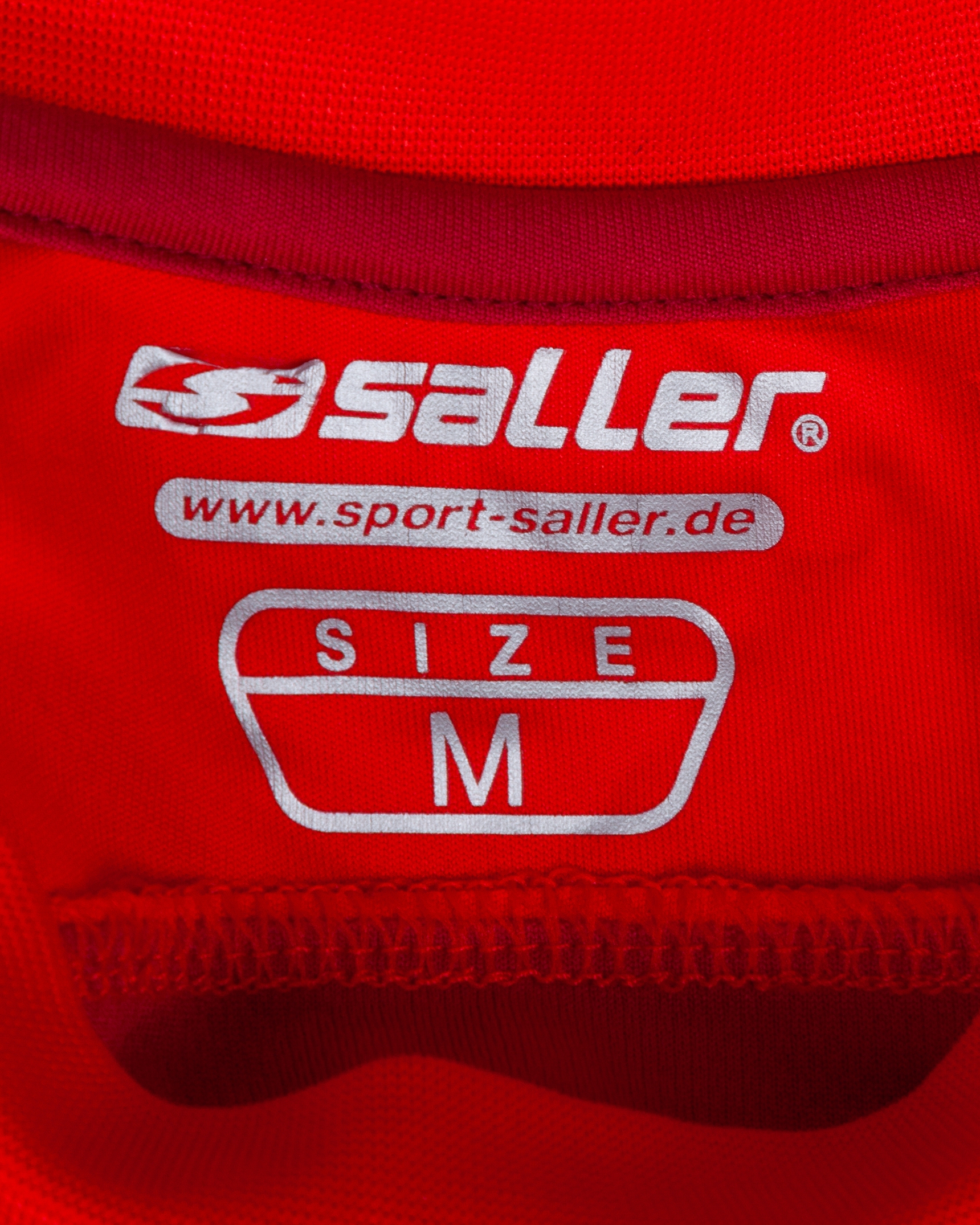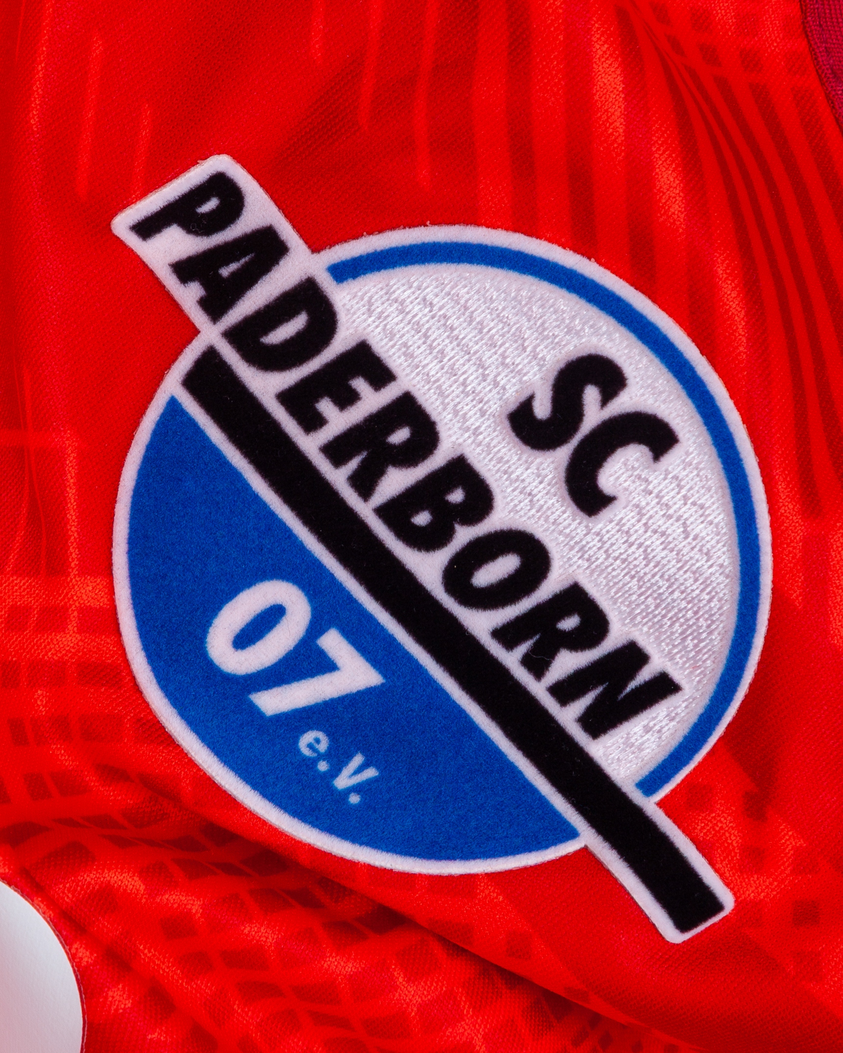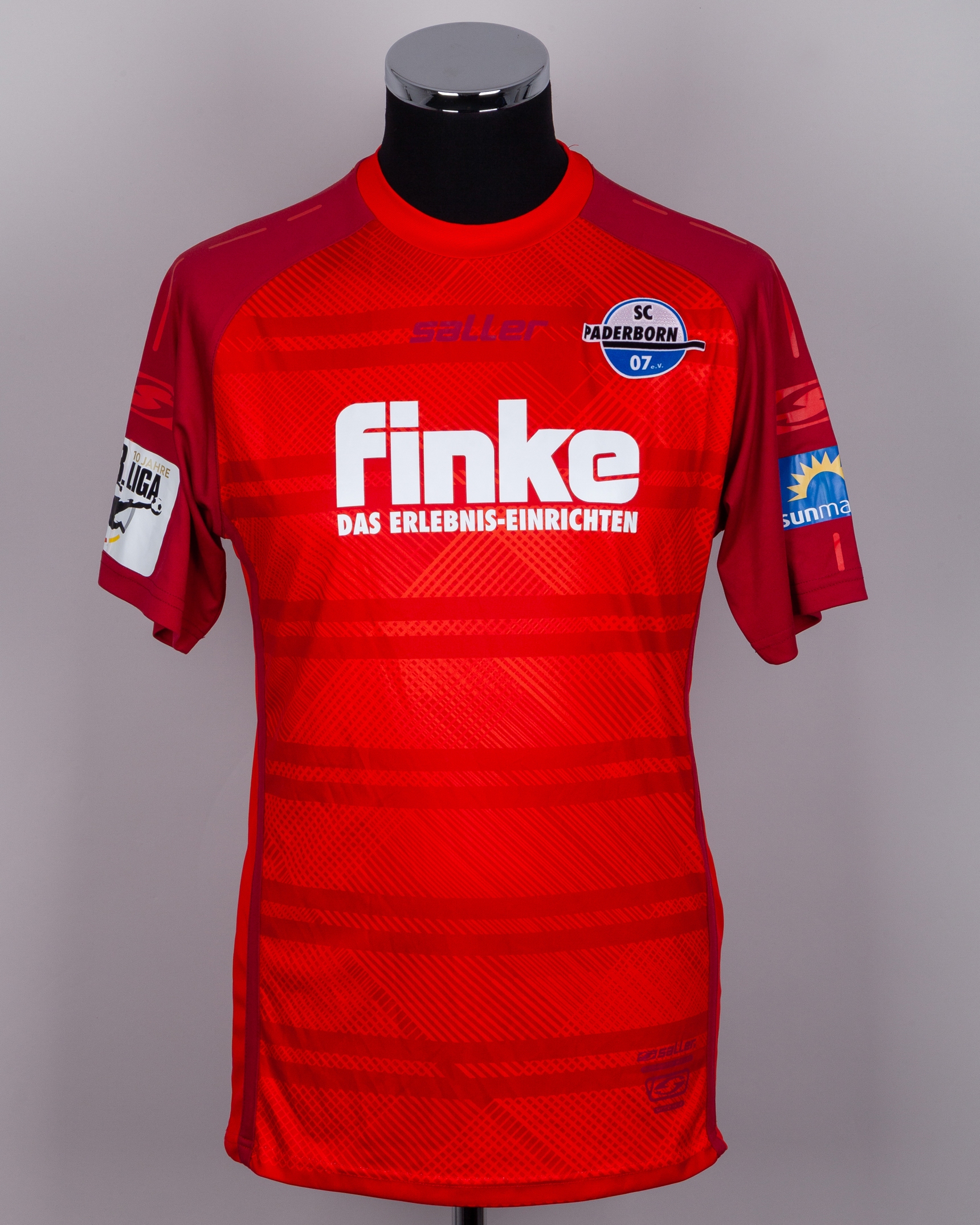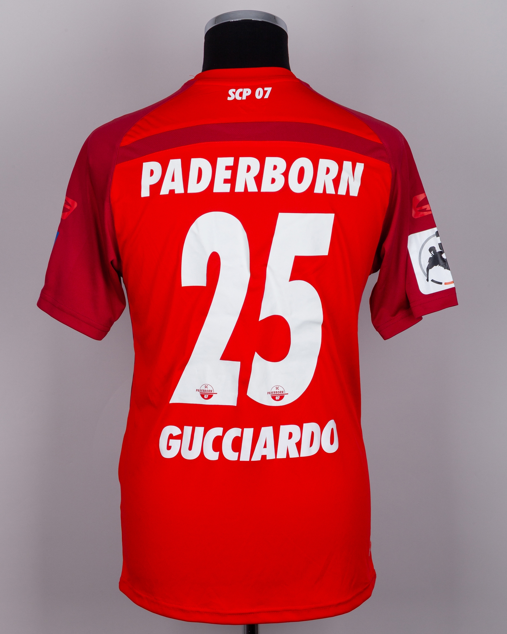 Sergio Gucciardo red No.25 Paderborn 07 short-sleeved shirt, 2017-18, Saller, M, with crew-neck collar and printed badge, the reverse lettered GUCCIARDO, the right sleeve with 10 Jahre 3. Liga flash