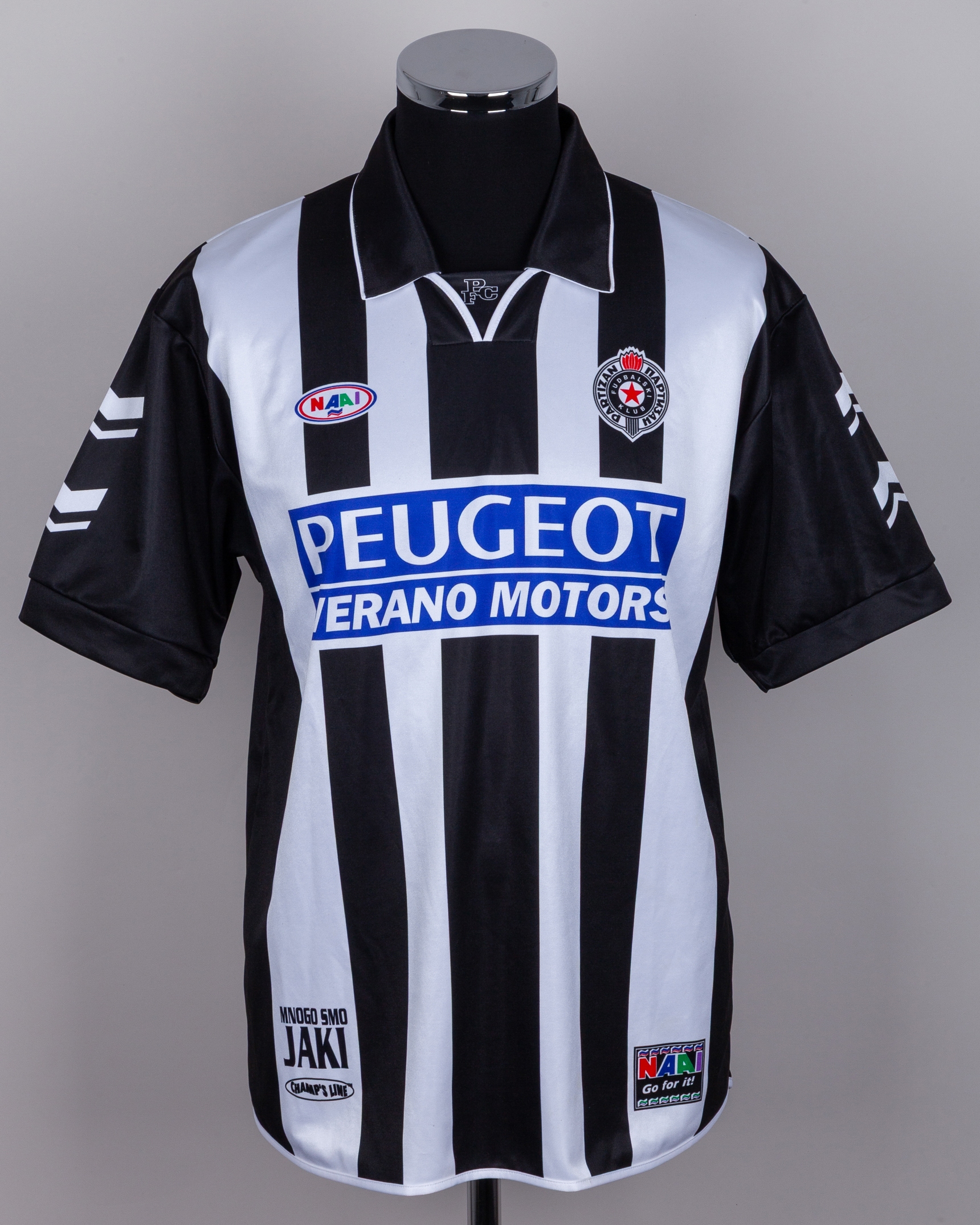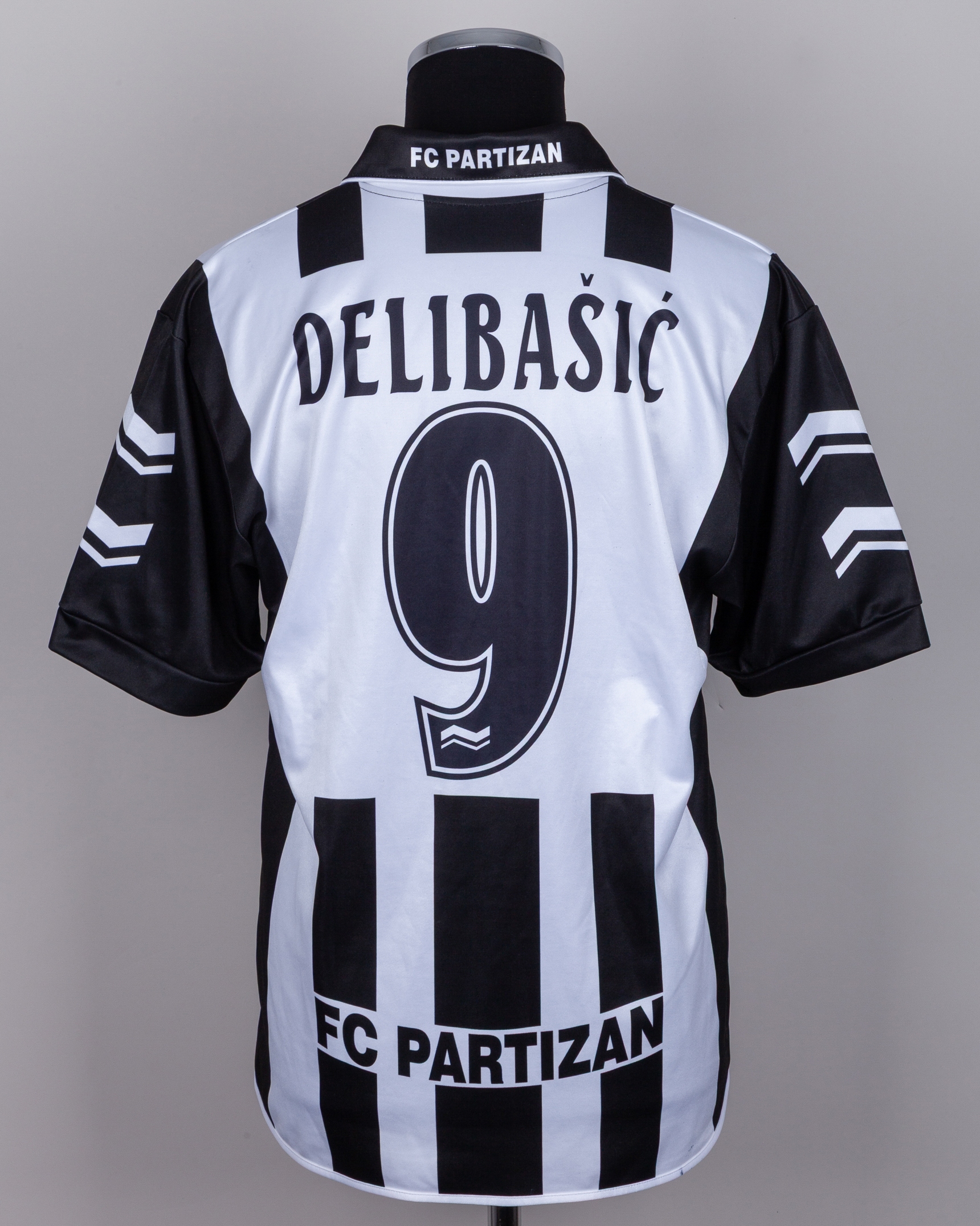 Andrija Delibasic black and white No.9 Partizan short-sleeved shirt, 1999-00, NAAI, with v-neck style collar and printed badge, the reverse lettered DELIBASIC